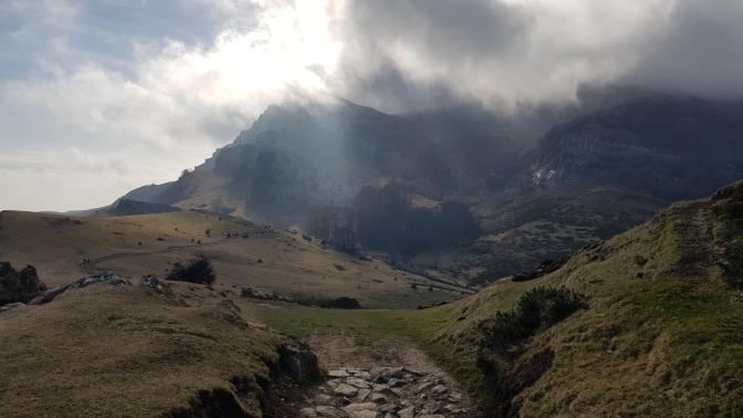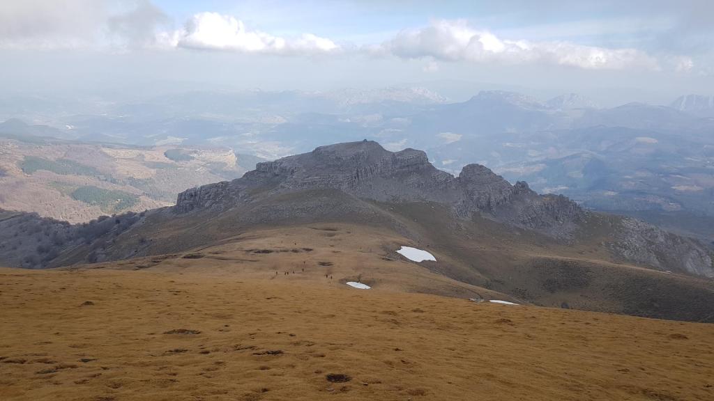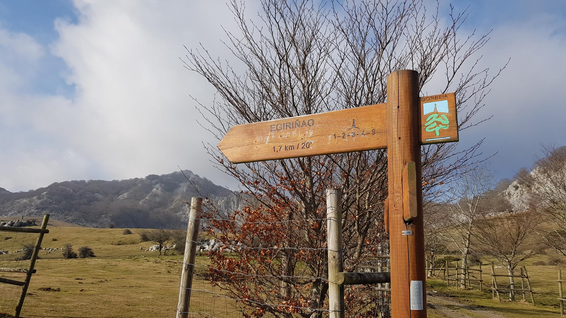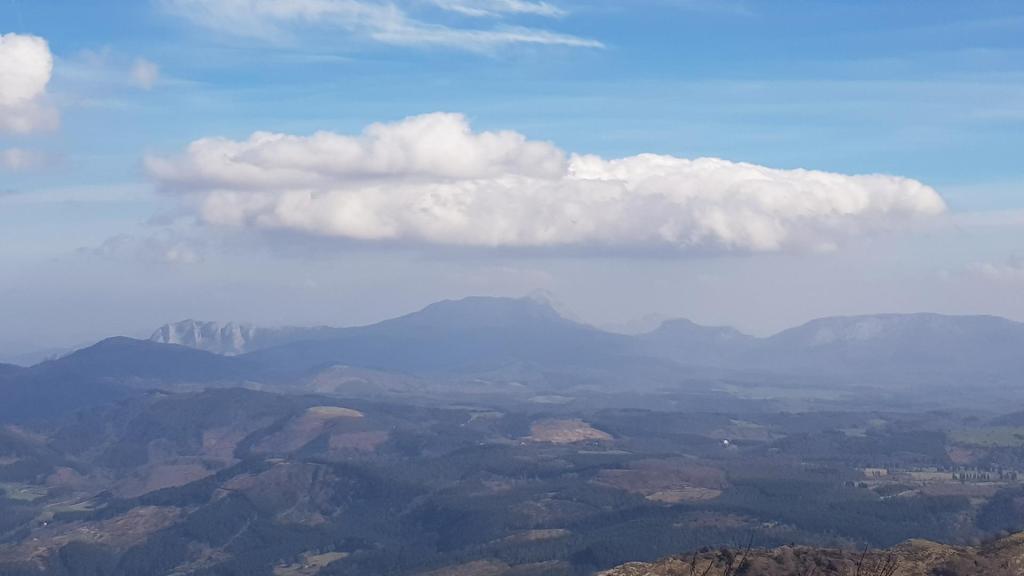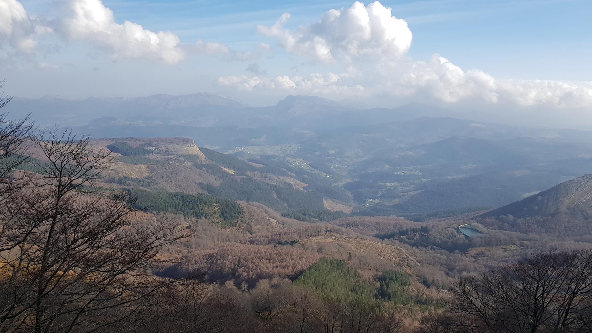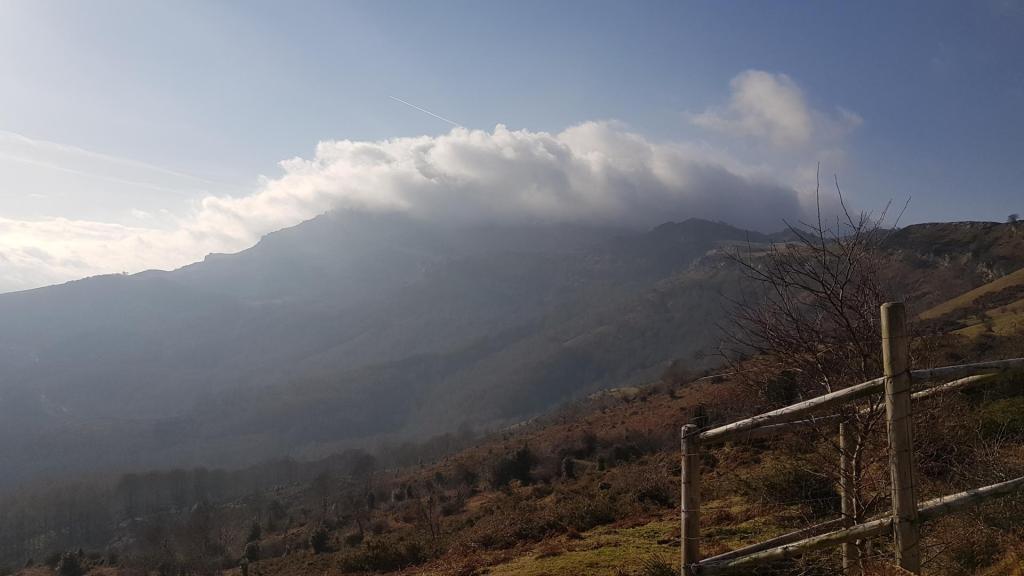 Según vamos ascendiendo deberíamos ir contemplando en el horizonte el Gorbea, y su «hermano pequeño», el Aldamin, pero las nubes impiden que podamos deleitarnos con las vistas. ¡Mala pinta!