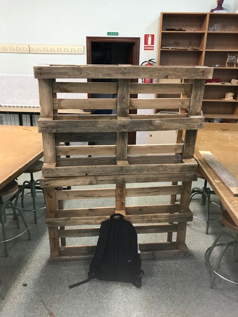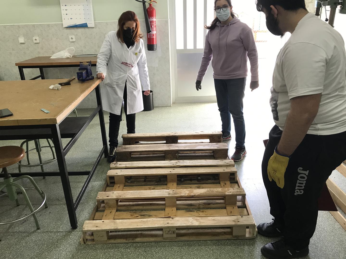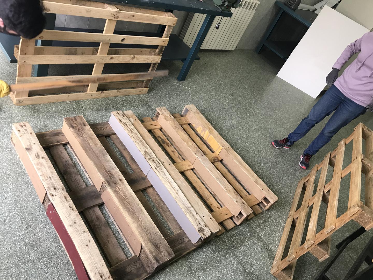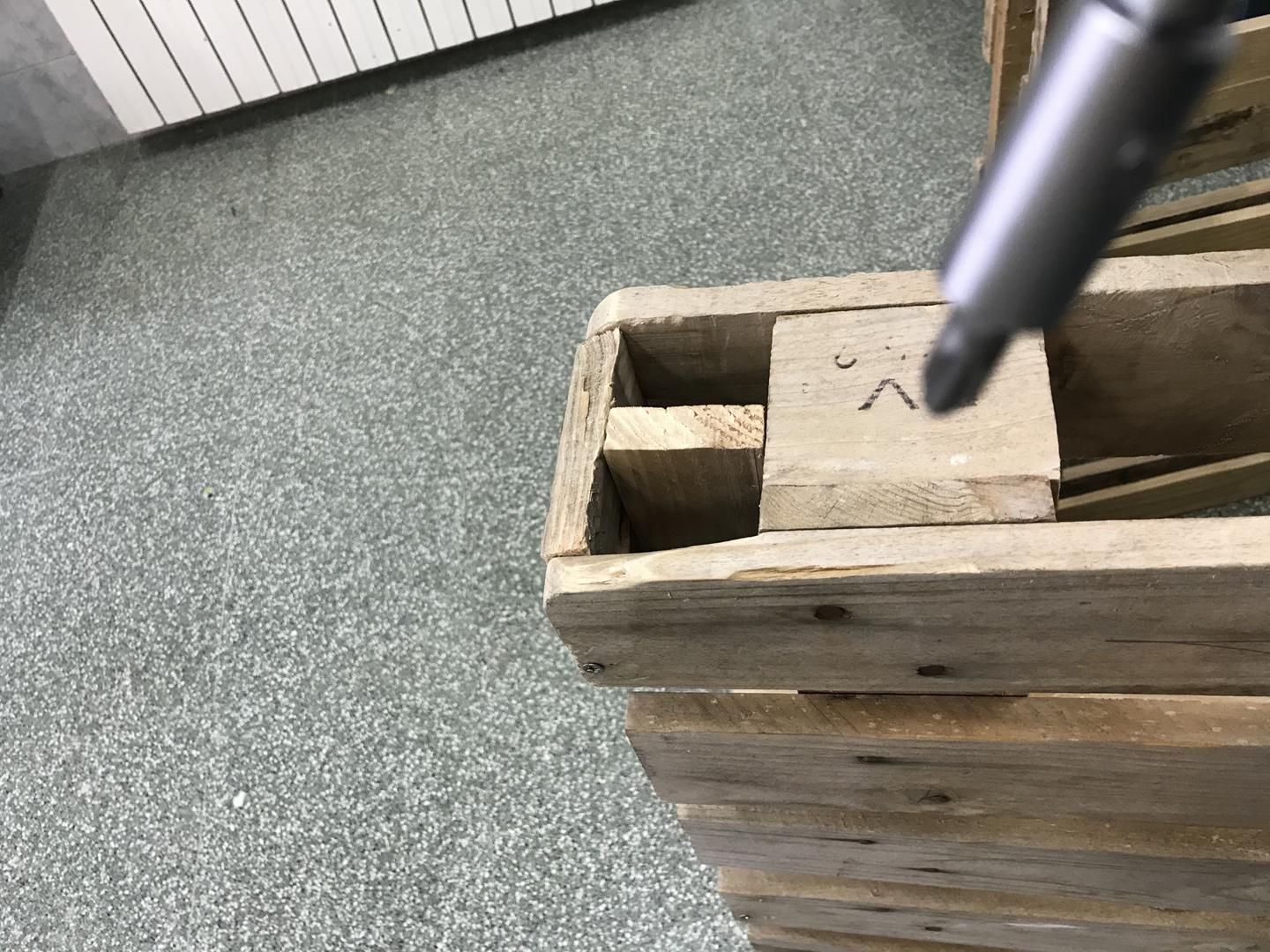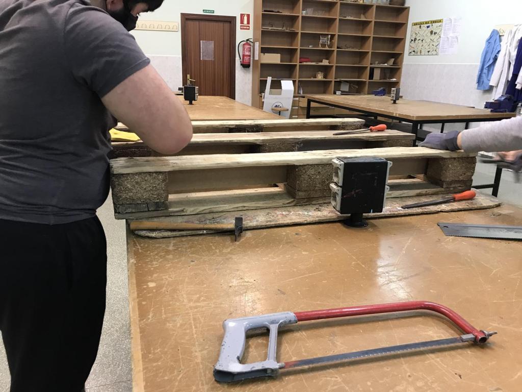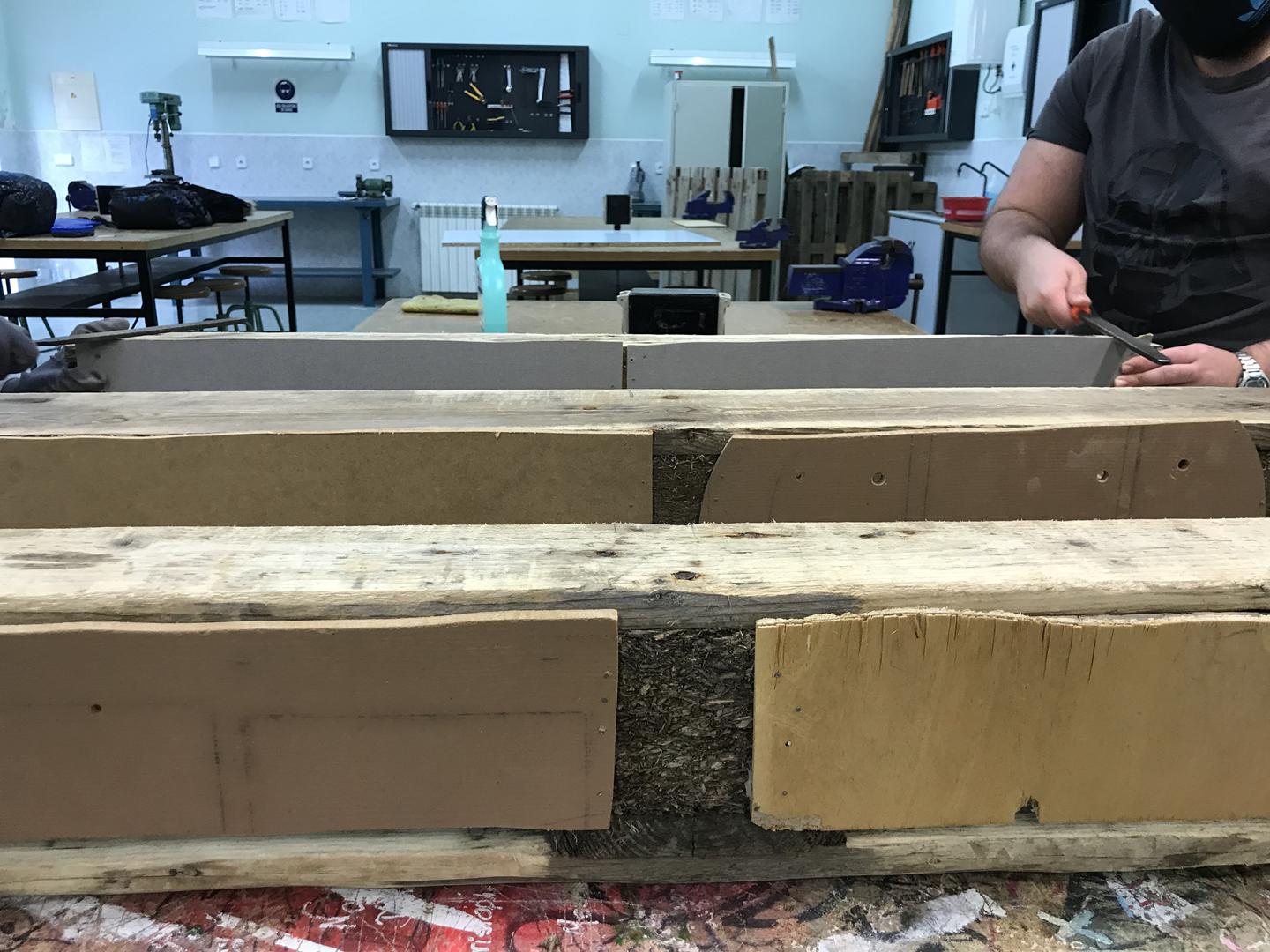 En un palé no coincidían los tacos, nos ha tocado fabricar unos nuevos para poder clavar más adelante la tabla al lateral.