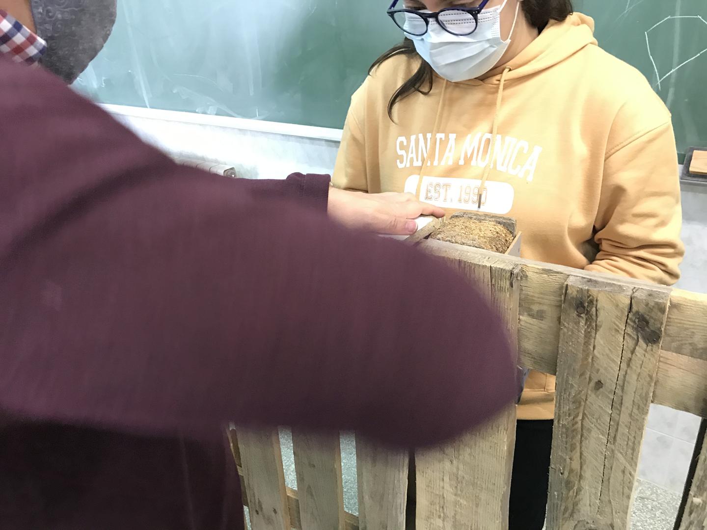 Entre los tacos, aprovechando el espesor de pale, vamos a colocar las macetas. Para ello hay que colocar algo de base impermeable y resistente para sujetar la tierra. El problema es que no tenemos madera suficiente para hacerlo. En cada par de pales, un huerto, hay 10 macetas. No tenemos madera para todas las tablas.