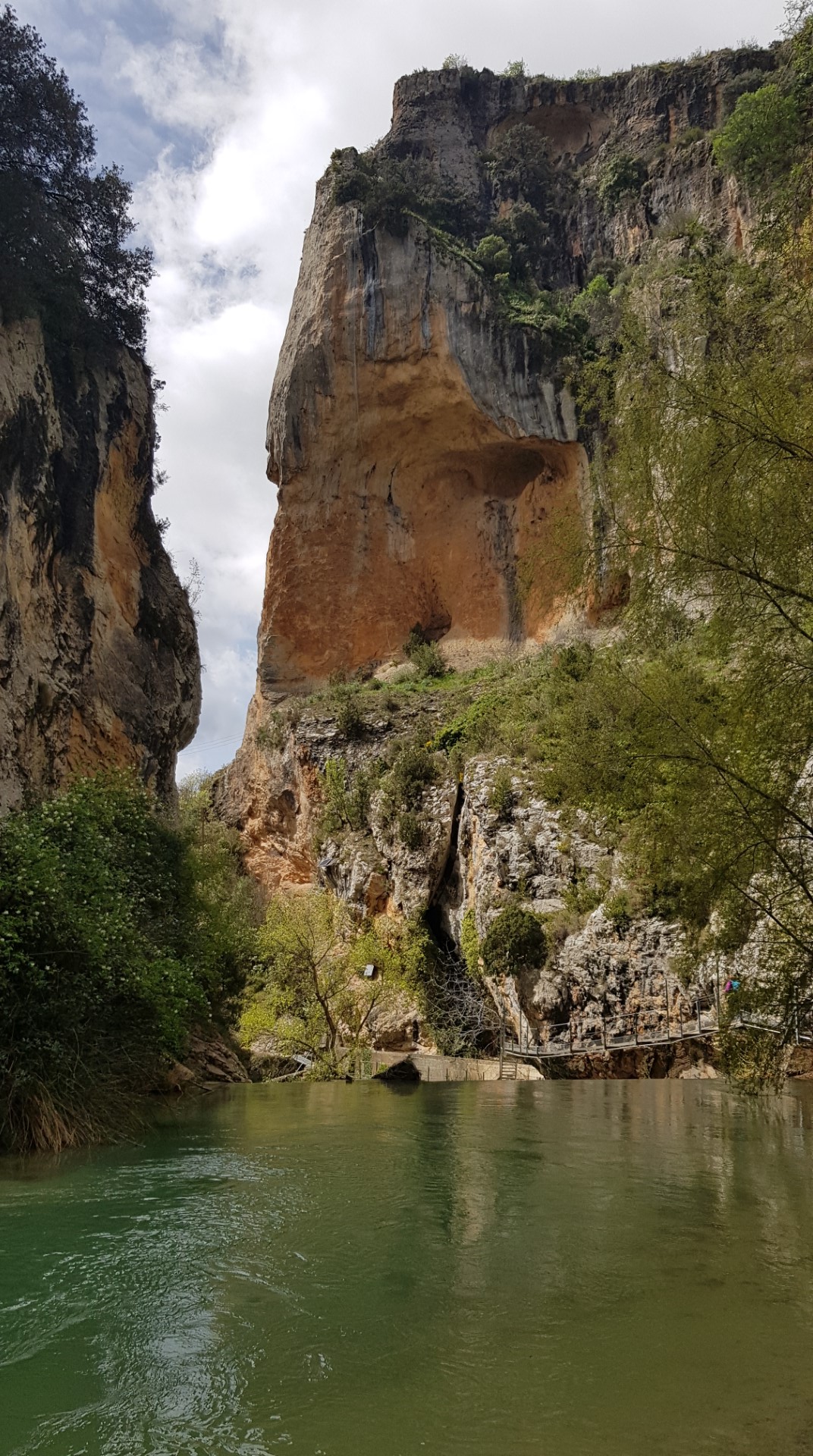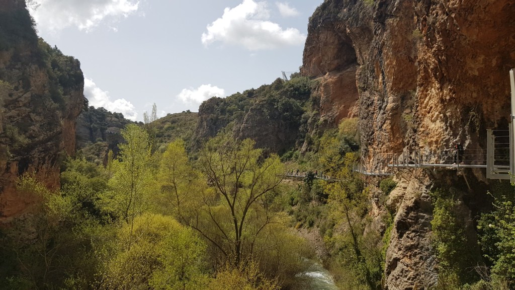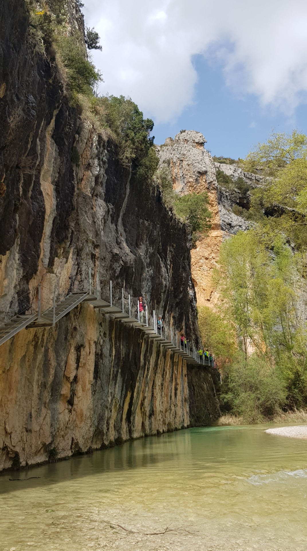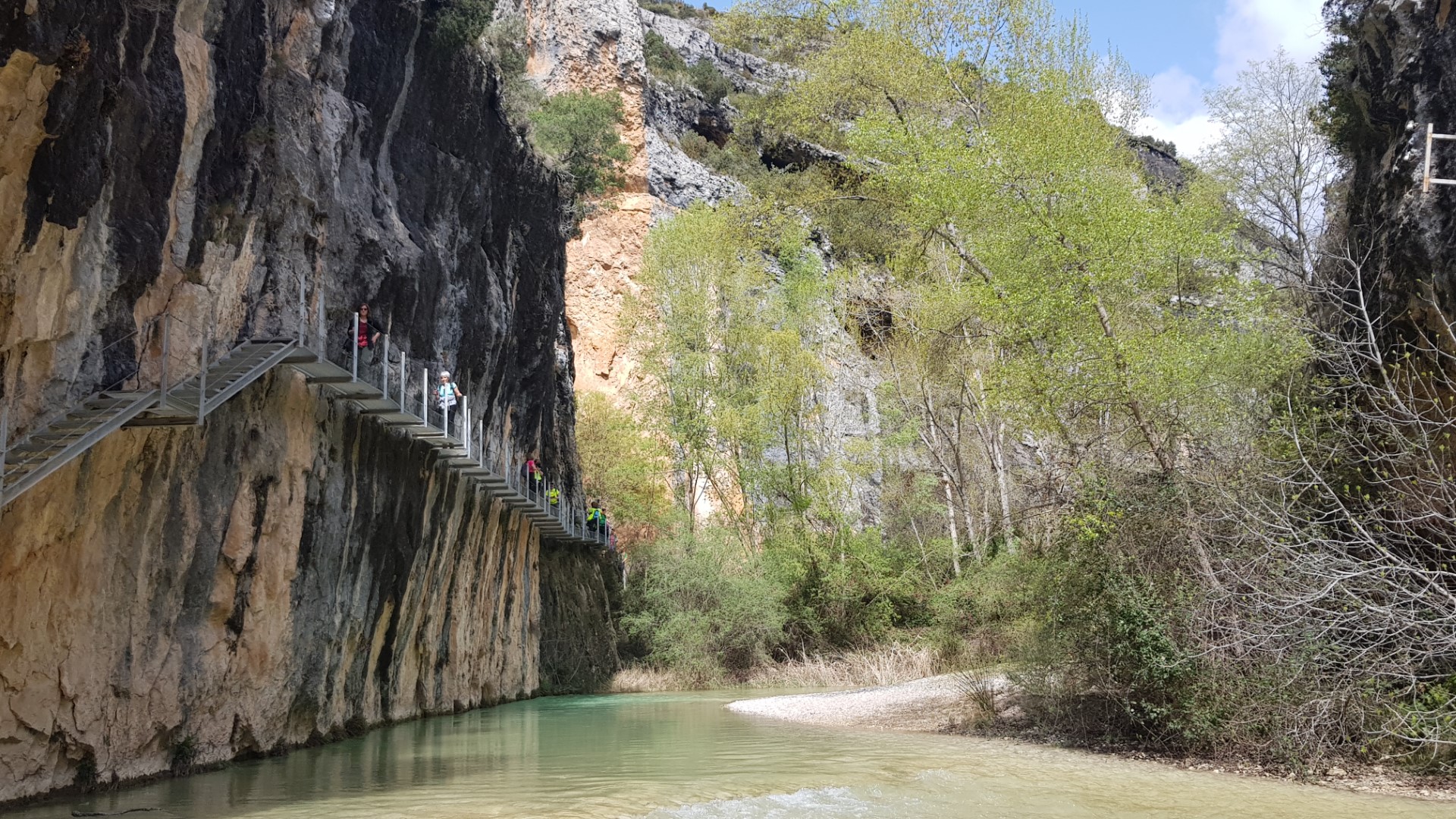 Después de visitar la cueva de Picamartillo, una gran oquedad formada en la roca caliza a la que no podemos acceder por la cantidad de agua que lleva el rio, giramos a nuestra derecha para pasar por las pasarelas metálicas colgadas literalmente de la roca y continuar el camino. En algunas zonas podemos contemplar las antiguas pasarelas. ¡Cuidado los que tengáis vértigo!