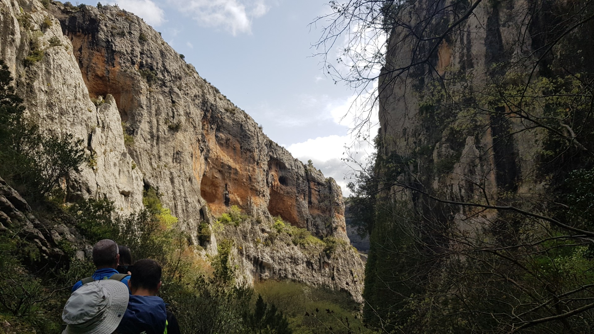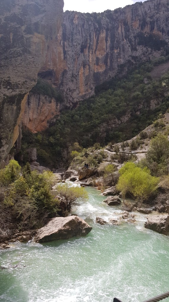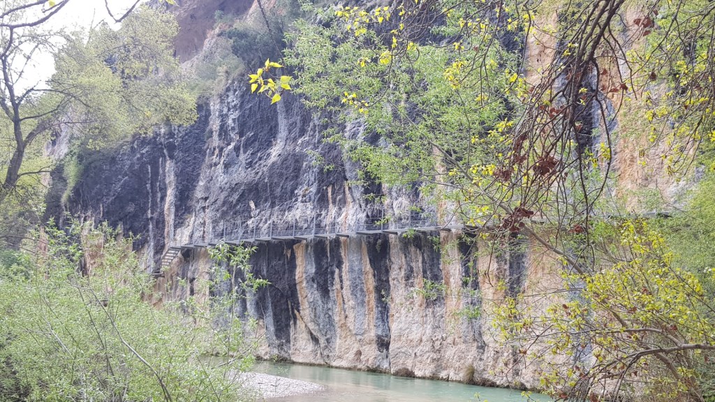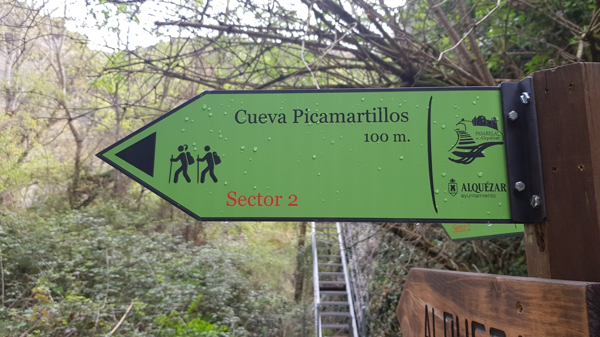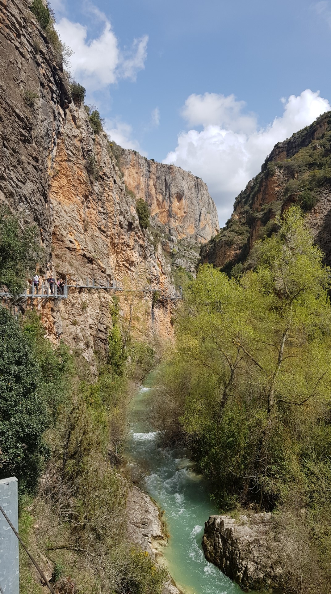 Después de visitar la cueva de Picamartillo, una gran oquedad formada en la roca caliza a la que no podemos acceder por la cantidad de agua que lleva el rio, giramos a nuestra derecha para pasar por las pasarelas metálicas colgadas literalmente de la roca y continuar el camino. En algunas zonas podemos contemplar las antiguas pasarelas. ¡Cuidado los que tengáis vértigo!