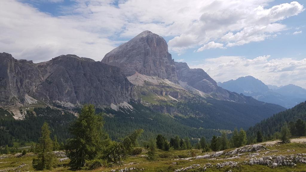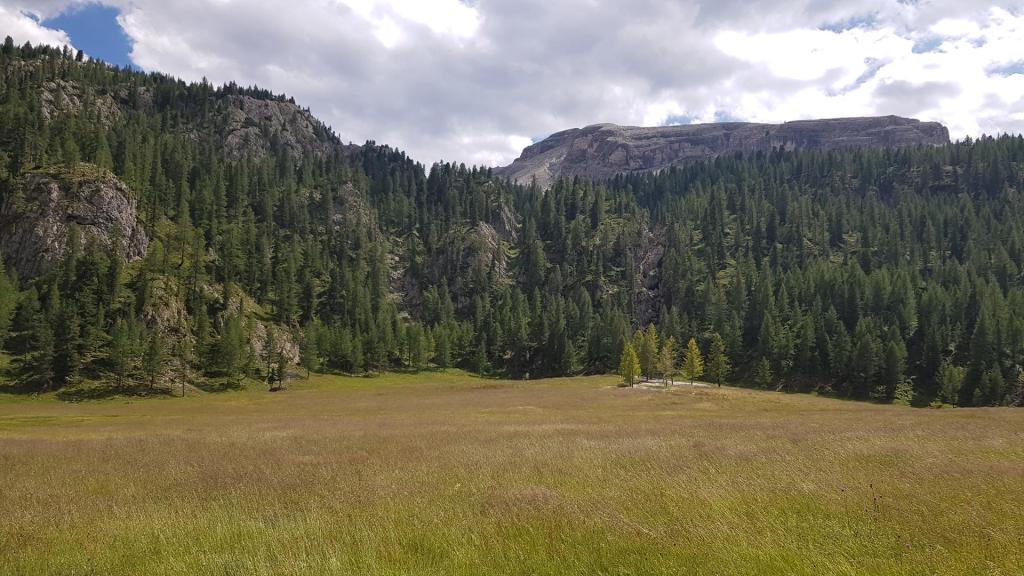 Desde aquí bajamos por el bosque hasta alcanzar la carretera, la cual seguiremos en paralelo hasta llegar de nuevo al aparcamiento del Paso Falzarego.
