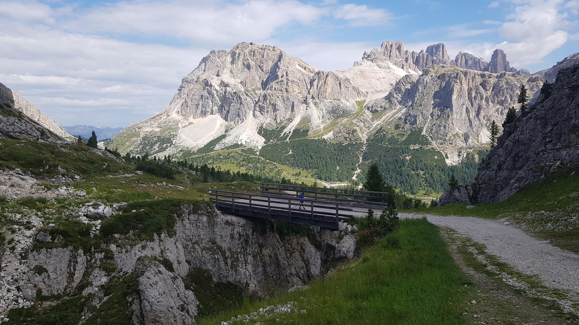 Desde aquí bajamos por el bosque hasta alcanzar la carretera, la cual seguiremos en paralelo hasta llegar de nuevo al aparcamiento del Paso Falzarego.