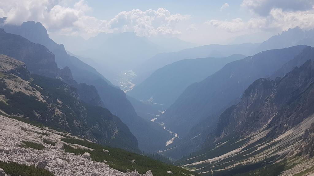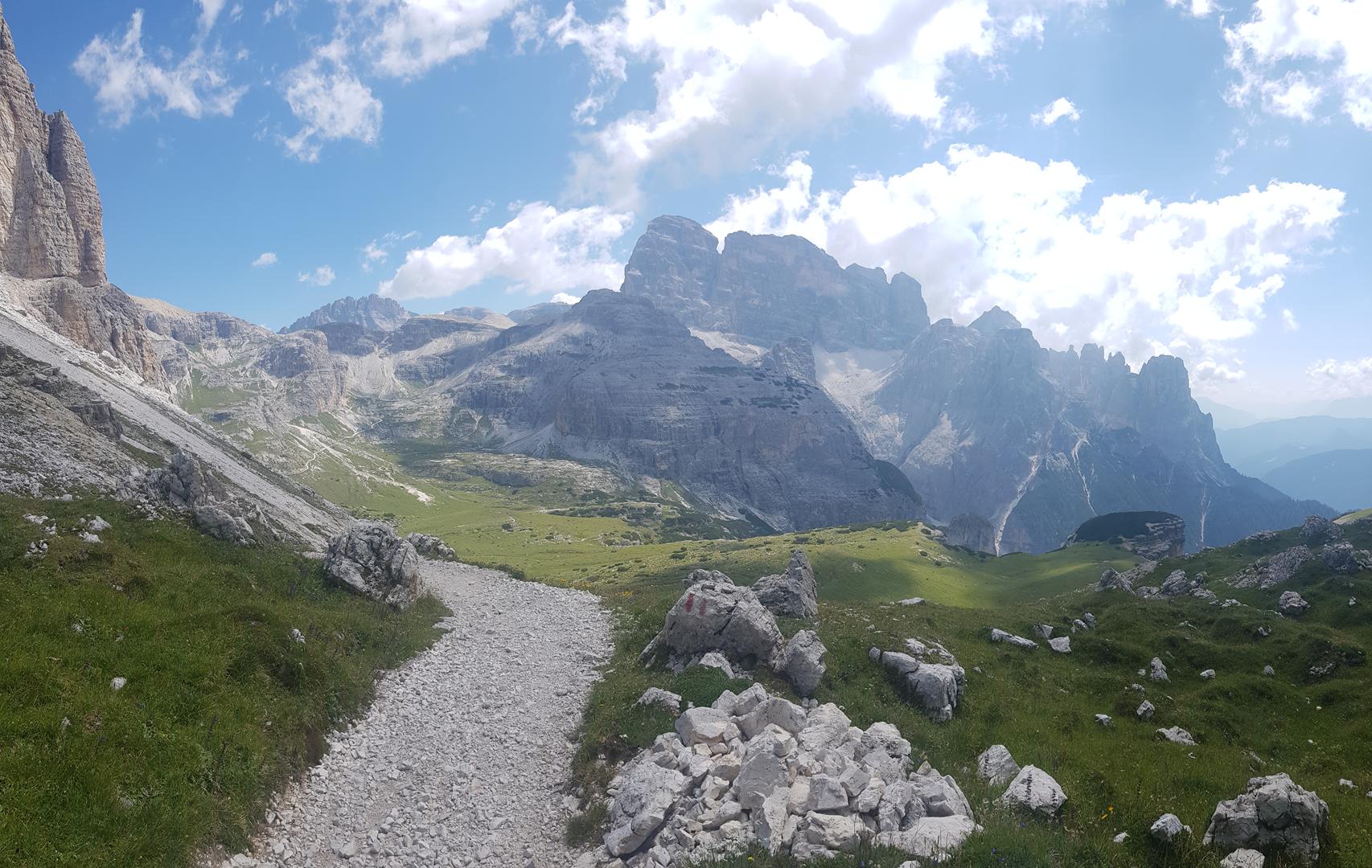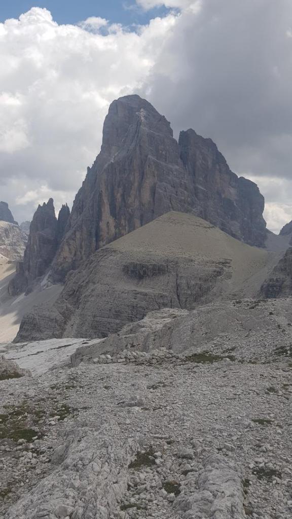 Después de las correspondientes fotos, rodeamos las moles de las tres Cimas de Lavaredo junto con cientos de excursionistas, senderistas y escaladores, pasando por el Col de Forcellina (2232 metros) y el Col de Miezzo (2315 metros), hasta llegar nuevamente al aparcamiento de Auronzo.