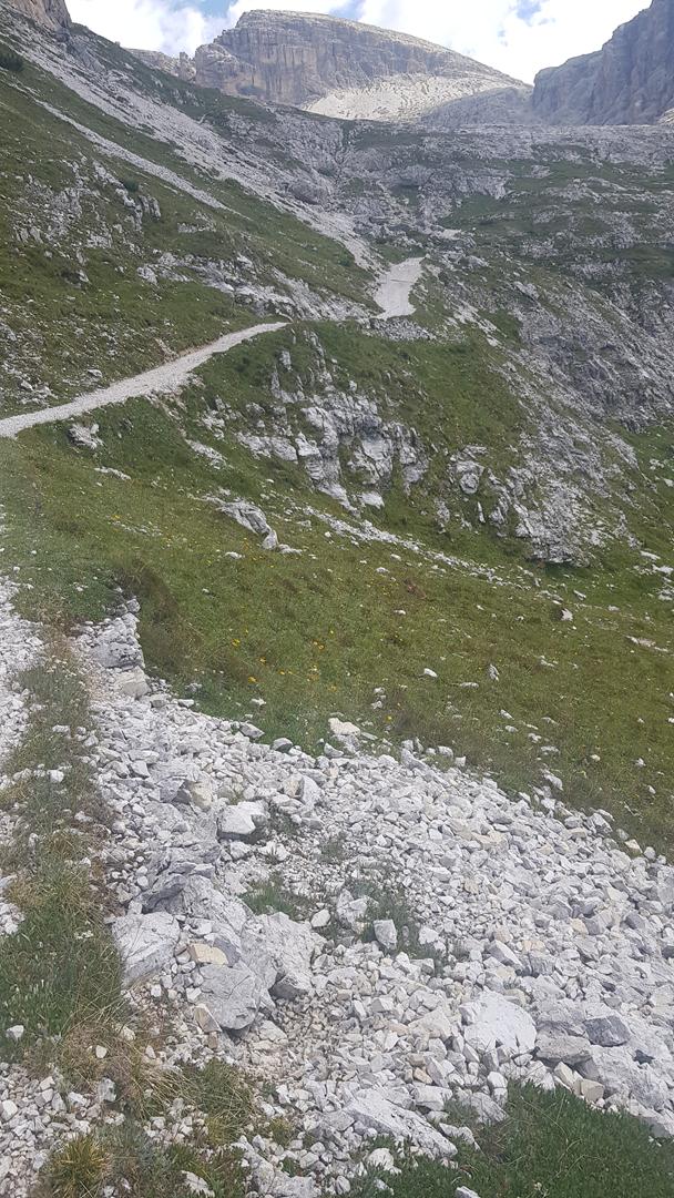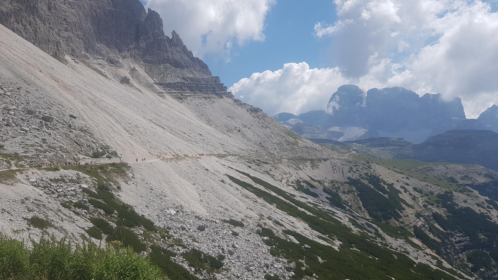 A partir del refugio, cientos de personas caminan con nosotros por una pista ancha y cómoda, dejando detras de nosotros Las Tres Cimas de Lavaredo, hasta el Refugio de Lavaredo, a 2345 metros de altitud. Despues de unos 800 metros caminando por esta pista, cambiamos de sendero tomando uno que sale a nuestra derecha. La mayoria de la gente lo que hace es continuar por el que veniamos hacia la Forcela Lavaredo y hacia Las Tres Cimas.