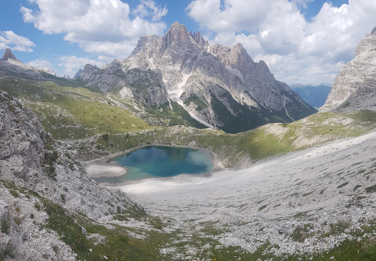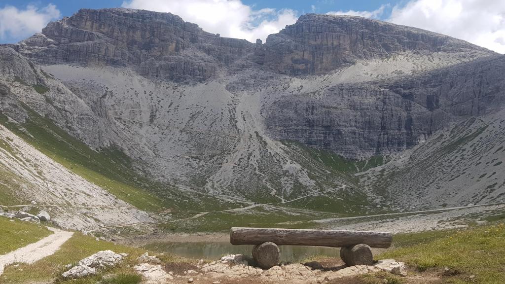 El nuevo sendero ahora es cuesta abajo hasta llegar al Lago di Cengia. Durante esta parte del trayecto la gran acumulación de personas ha desaparecido y unicamente nos encontramos con algún senderista embelesado como nosotros por la grandiosidad del paisaje. Es en el lago donde paramos a comer alguna de nuestras provisiones y contemplar a algún amigo que viene a saludarnos.