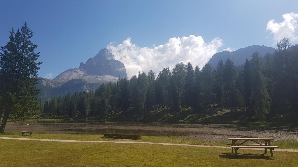 En la base de estas tres moles existe un gigantesco aparcamiento al que se accede a traves de un peaje previo pago de 30€. A nuestra llegada habia un atasco de coches enorme por lo que decidimos parar antes del peaje en el Lago Antorno, a 1870 metros de altitud.