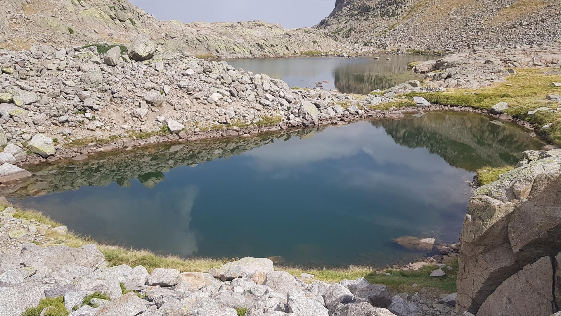 Una vez encaramados al circo de 5 lagunas, se hace un silencio y crece una paz embriagadora. A partir de aquí cada paso es un regalo. Descubrimos en seguida la primera laguna, la Laguna Bajera, que con suerte para nosotros tiene agua.