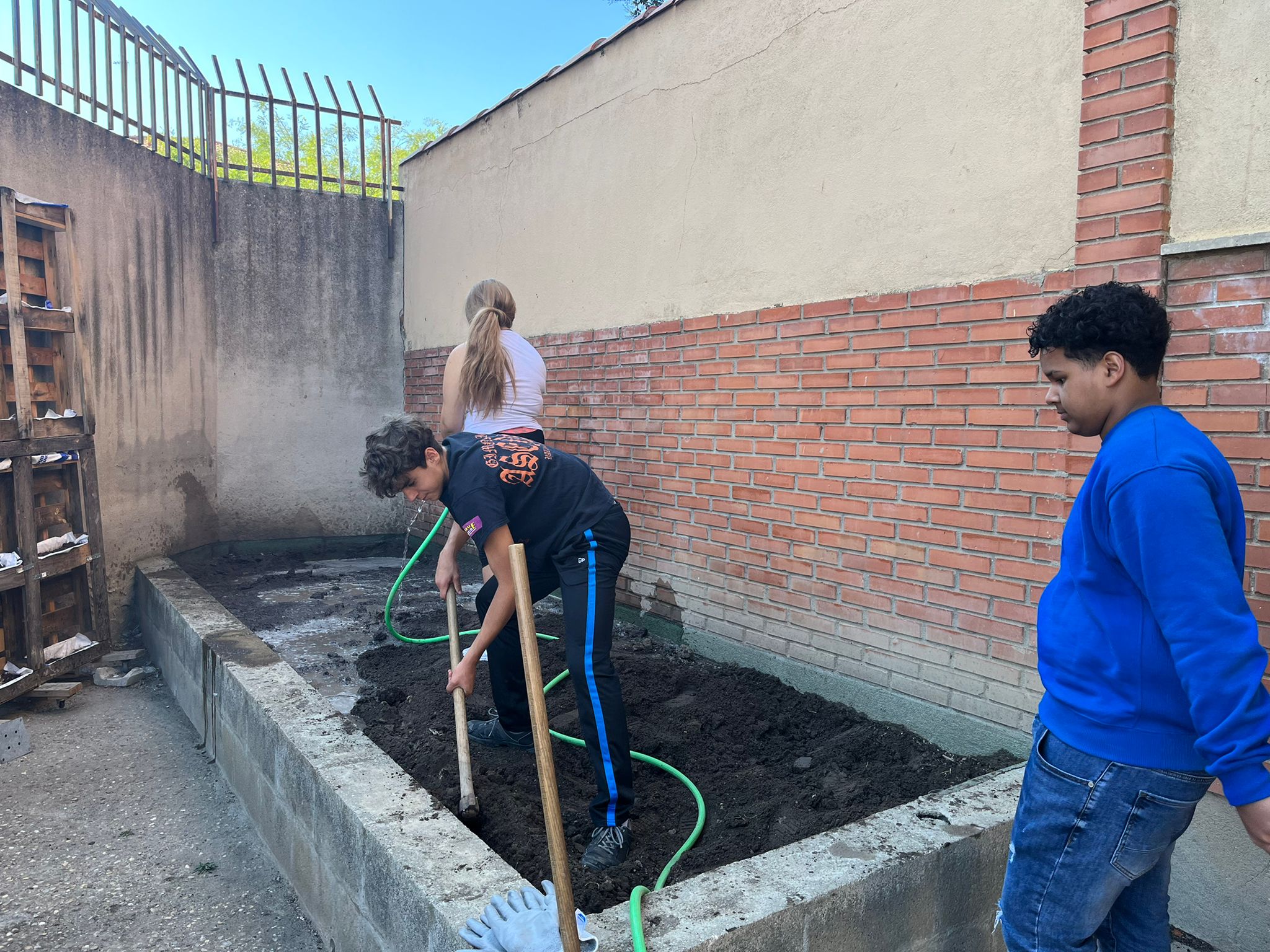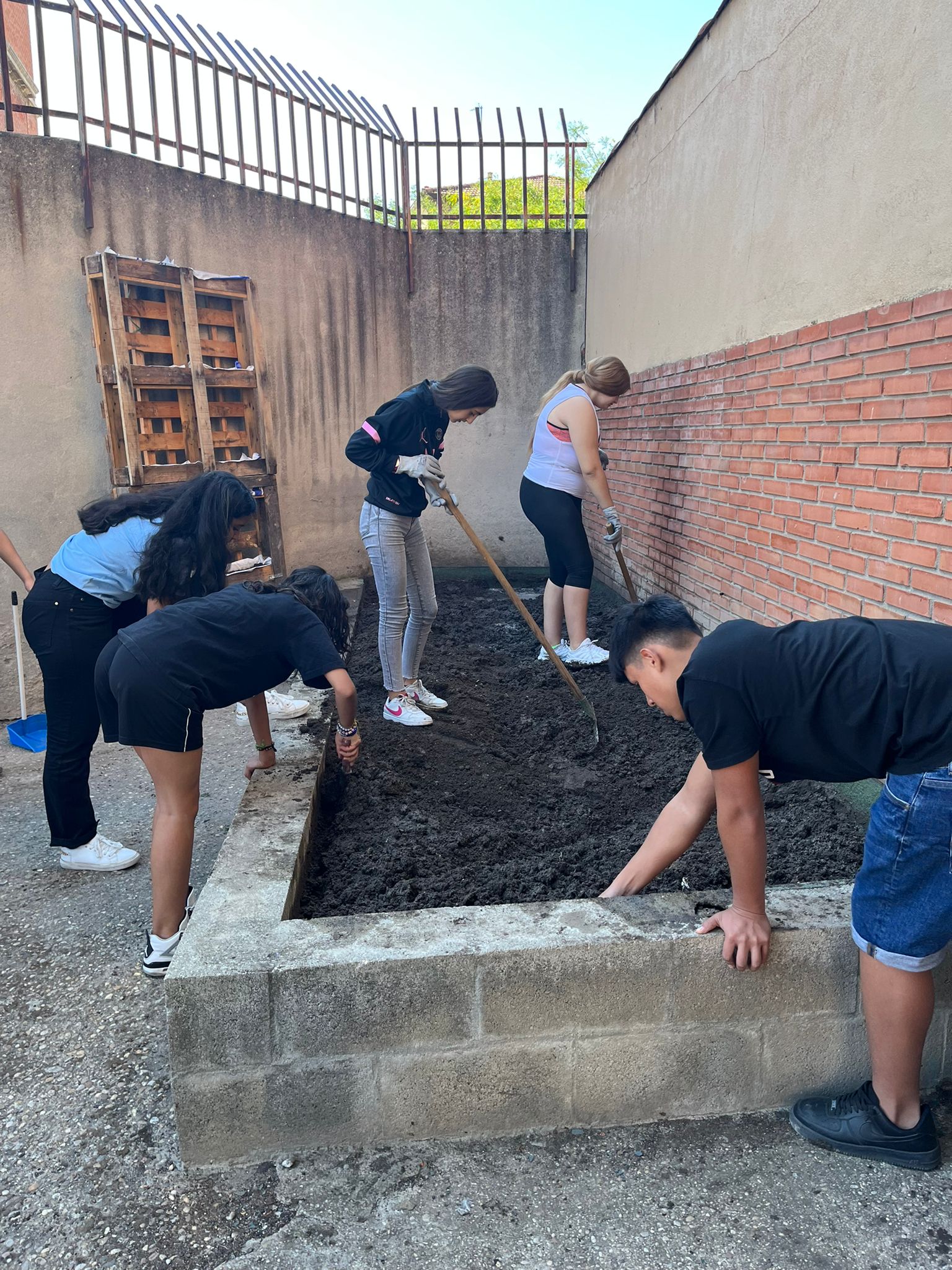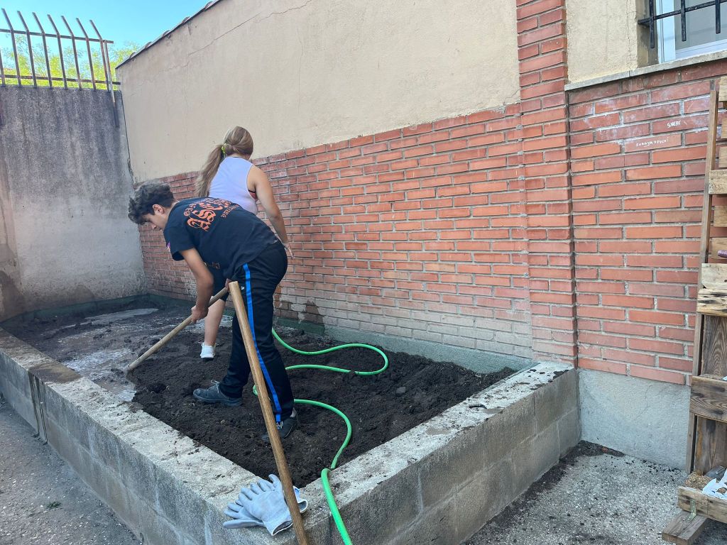 Los chicos de 2º ESO-PMAR son este año los encargados del huerto escolar. Rastrillo y azada en mano, y mucho que aprender del tema hortícola, han comenzado este proyecto volteando y aireando la tierra para mejorar su drenaje. Fue una tarea difícil, pues la tierra estaba muy seca, pero es esencial de cara a la siembra de las hortalizas de otoño.