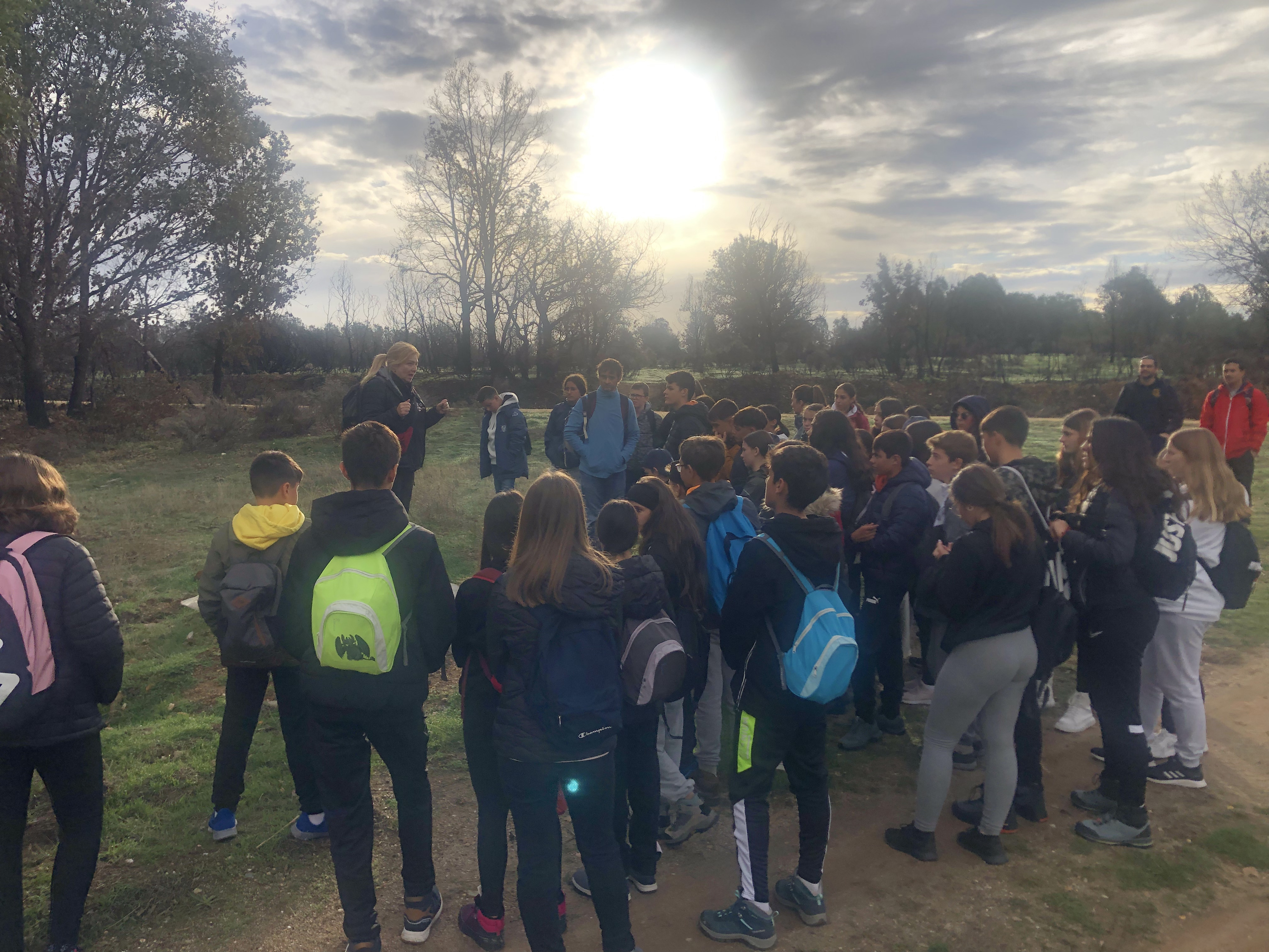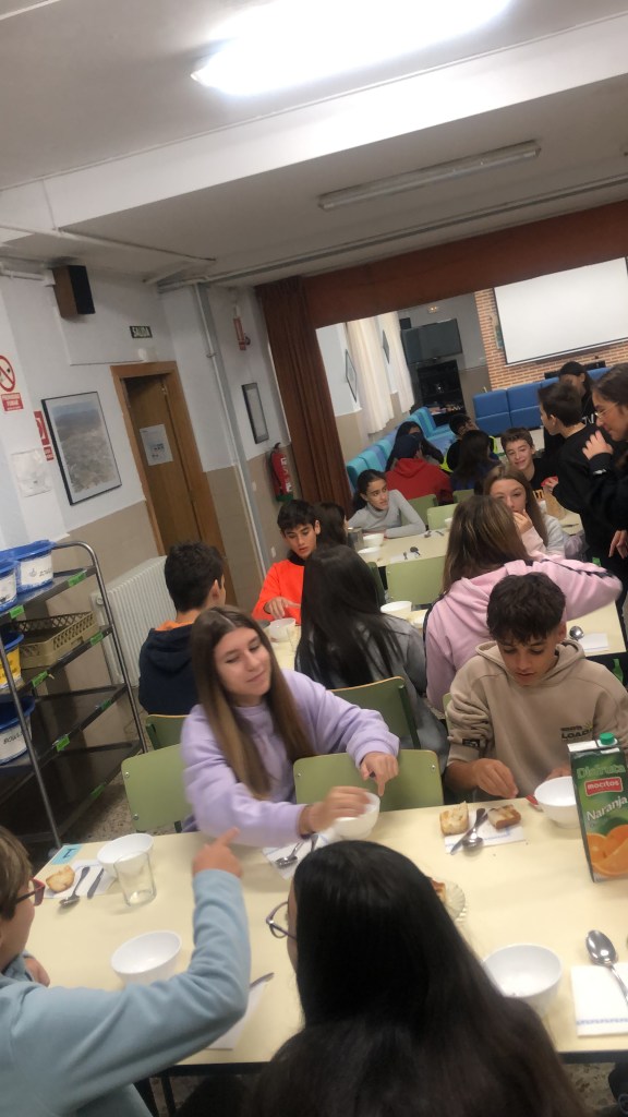 Levantarse, asearse y a las 8.45h todo el mundo está sentado para desayunar. Un desayuno muy completo y variado para todos los gustos (cereales, galletas, pan tostado, mantequilla y mermelada, aceite y sal, colacao, descafeinado, leche, fruta…). Y con las pilas cargadas y después de cambiarnos de calzado para el exterior, comenzamos una ruta desde el centro hasta el Embalse de Valparaíso donde estaba previsto hacer allí un análisis de aguas y durante el recorrido conocer especies de fauna y flora autóctonas. Sin embargo, la lluvia nos ha impedido completar todo lo programado y hemos tenido que volver antes de tiempo al centro.