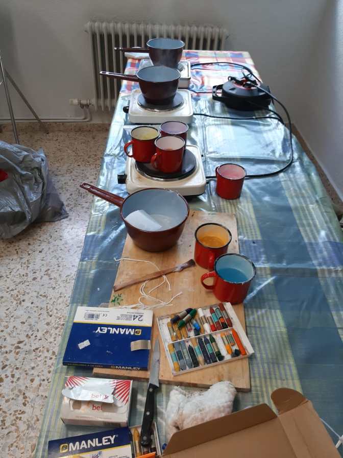 En el segundo taller elaboran velas con parafina tintada de colores. Para ello, calientan la parafina para disolverla y con porciones muy pequeñas de pinturas de cera la tintan de verde, azul, rosa, morado, amarillo y naranja. Cada uno elige los colores que quiere utilizar y con un palillo para colocar la mecha, van vertiendo la parafina en moldes (envases de petit suisse) esperando entre color y color para que se endurezca y no se mezclen. El último día se llevará cada uno su vela de recuerdo.