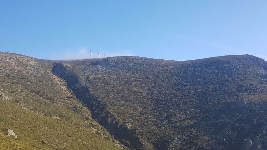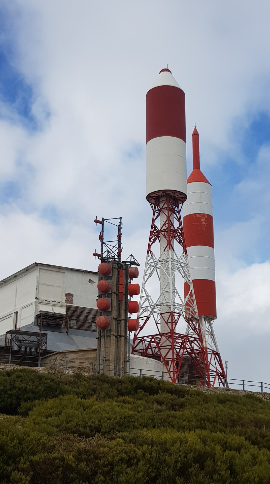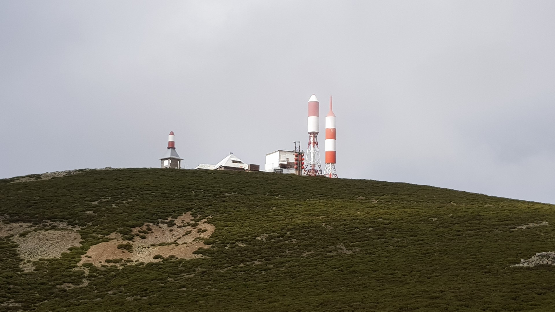 En la cima de la Bola del Mundo se encuentran varios repetidores de televisión, creemos que cerrados aunque sigan emitiendo, con unas curiosas estructuras cilíndricas blancas y rojas que sirven para protegerlos de las inclemencias meteorológicas.