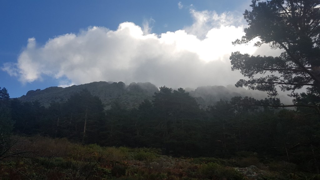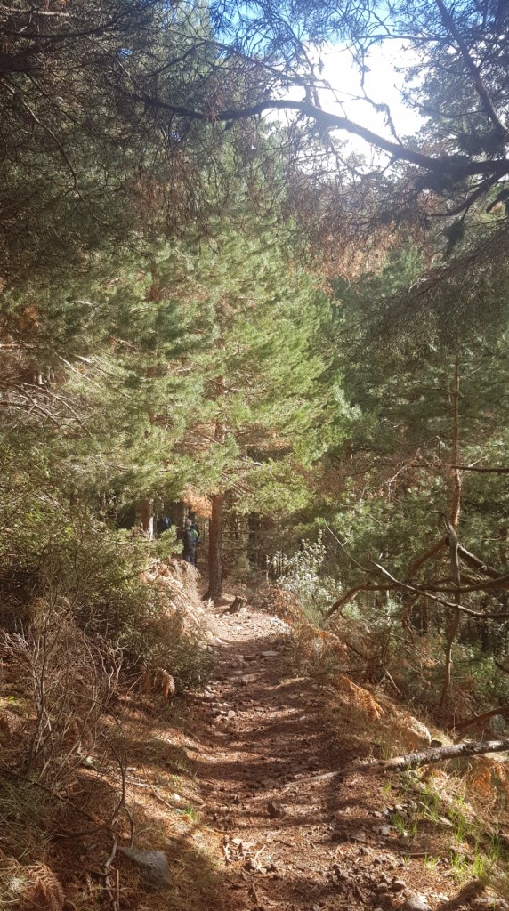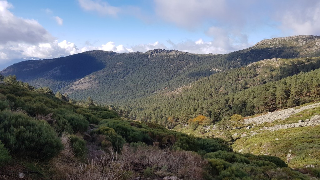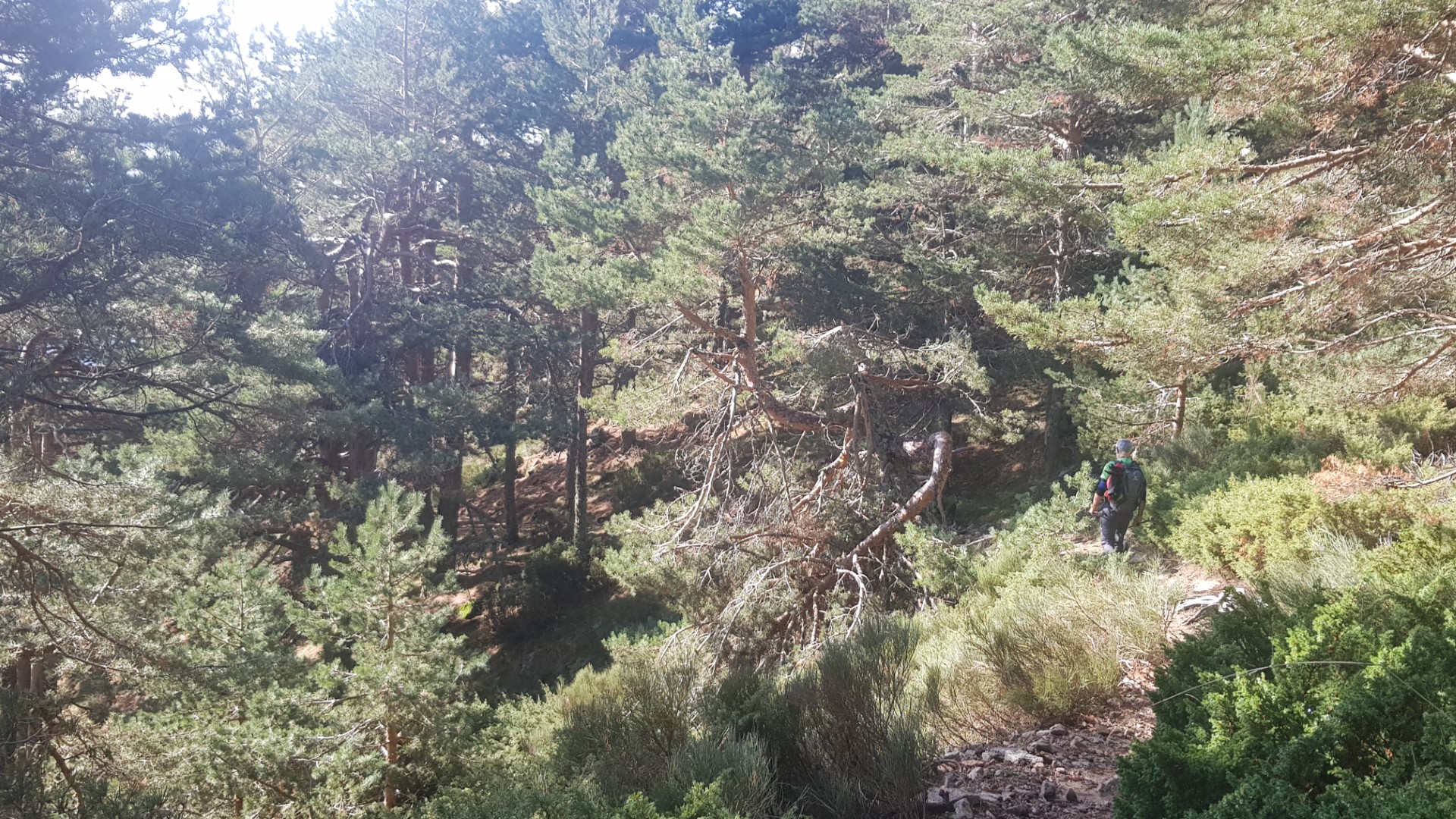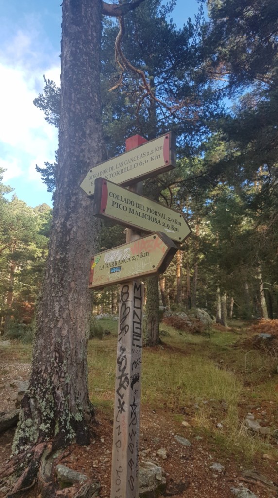 La ruta la comenzamos siguiendo la senda que nos debería llevar hasta la Bola del Mundo, pero que después de 1,5 kilómetros, la dejaremos a nuestra izquierda para bajar a través de un precioso bosque de pinos hasta la Senda de la Tubería.