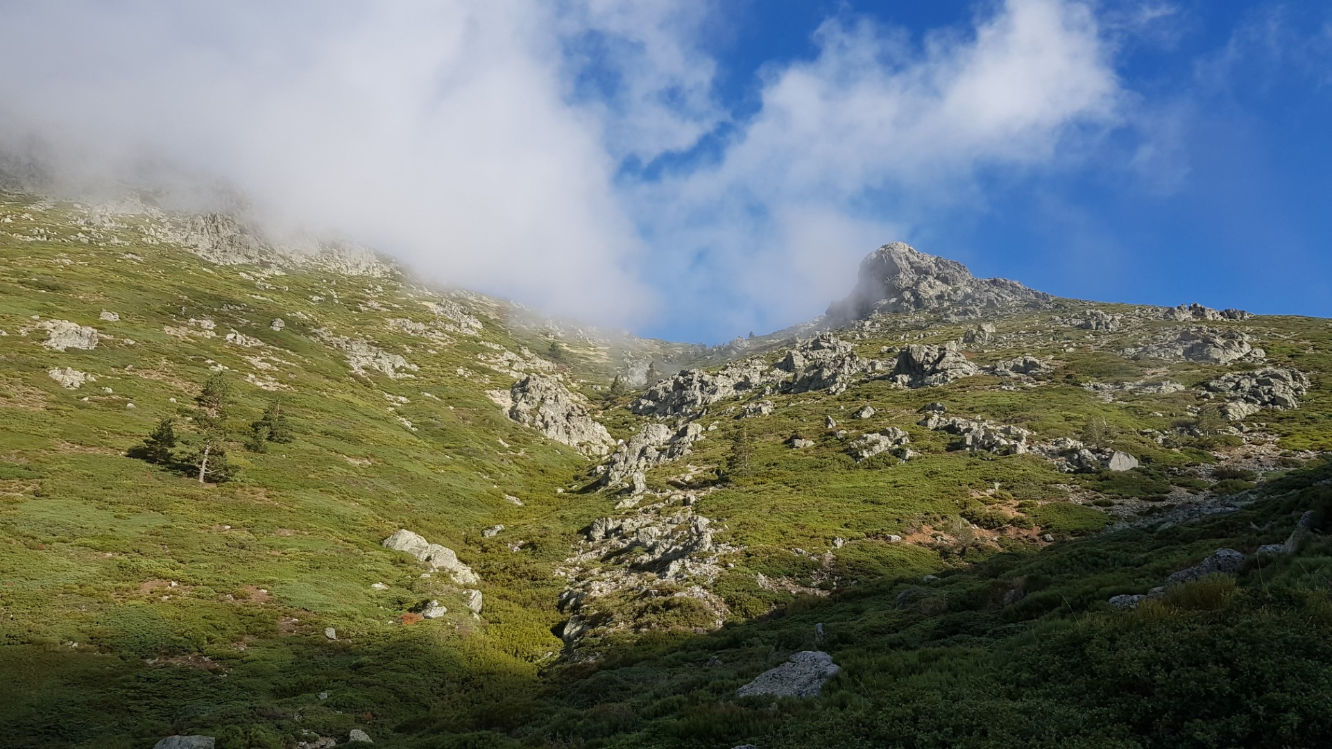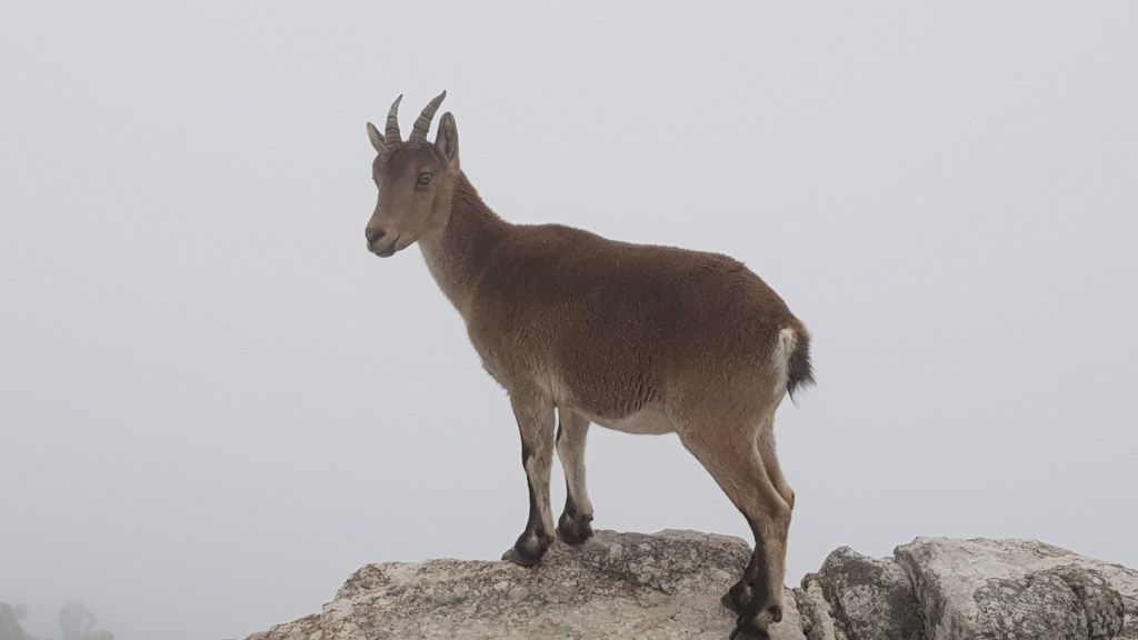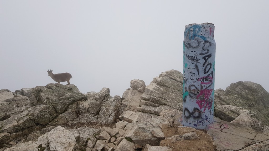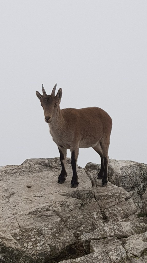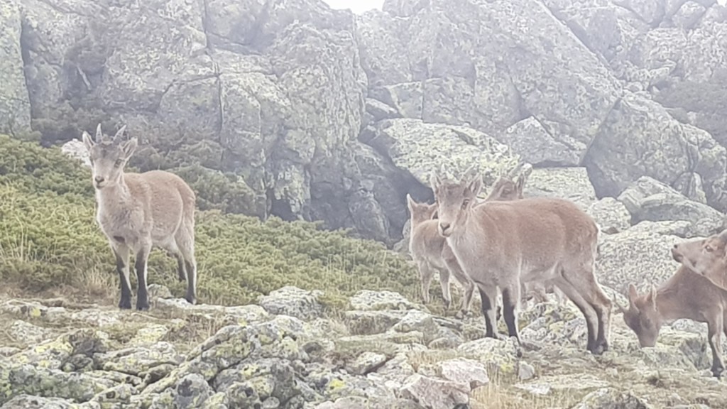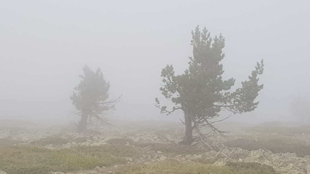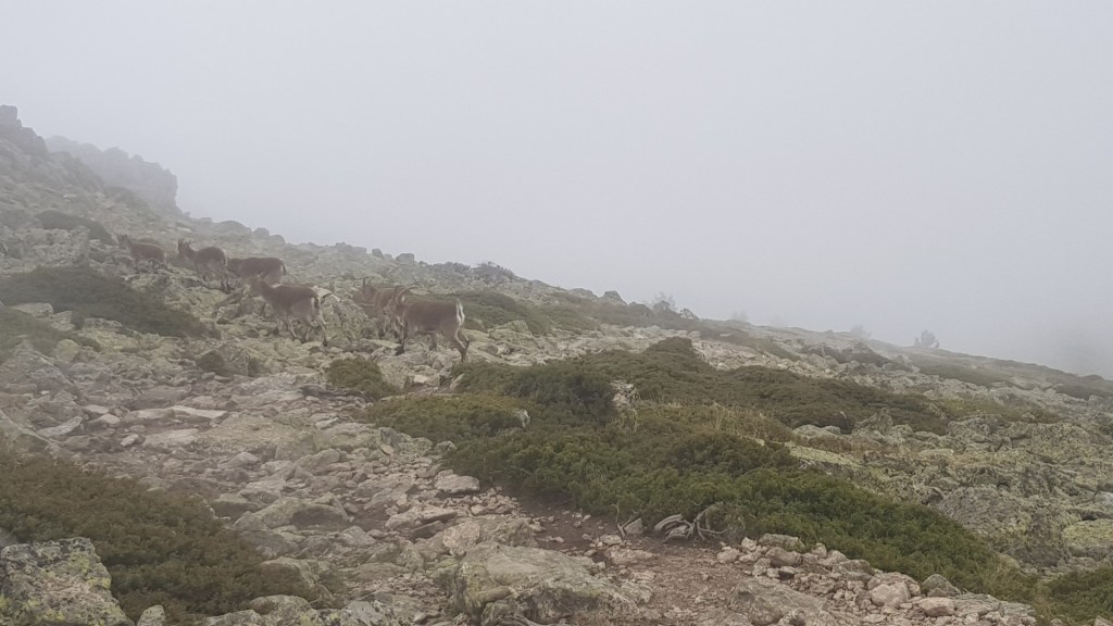 Arriba, la espesa niebla prácticamente no nos deja distinguir nada, excepto algunos acompañantes curiosos que se pasan por allí.