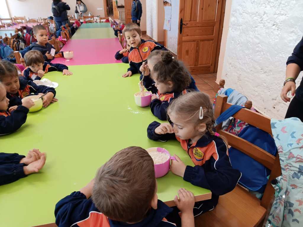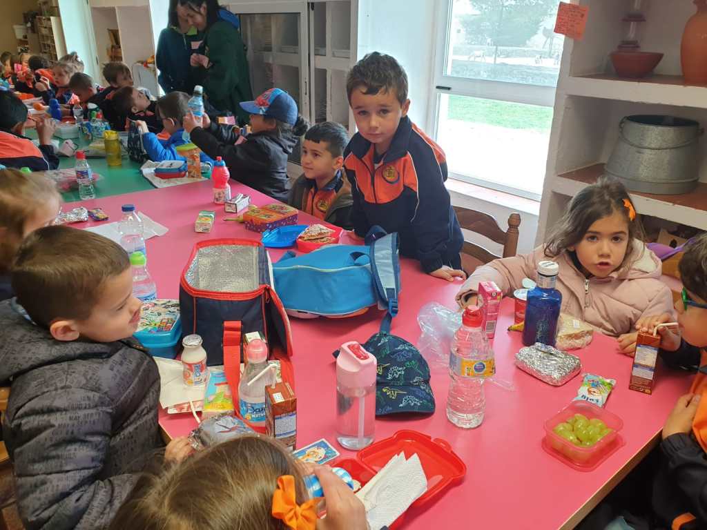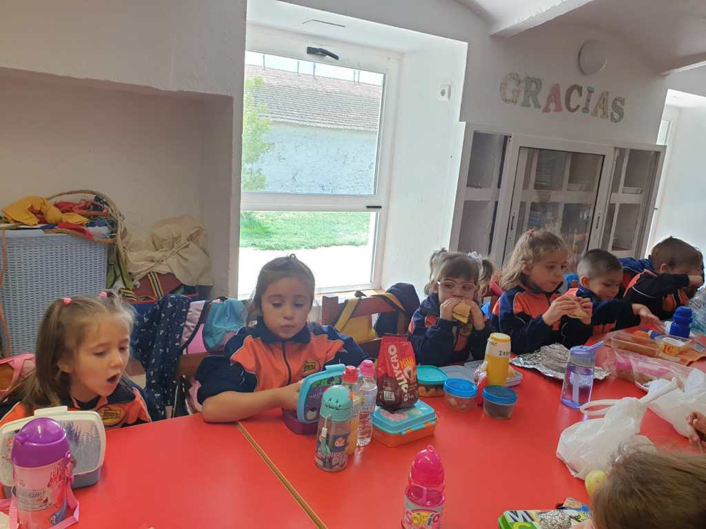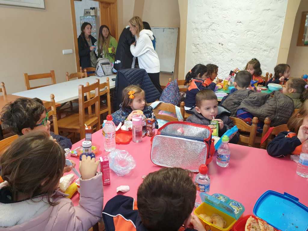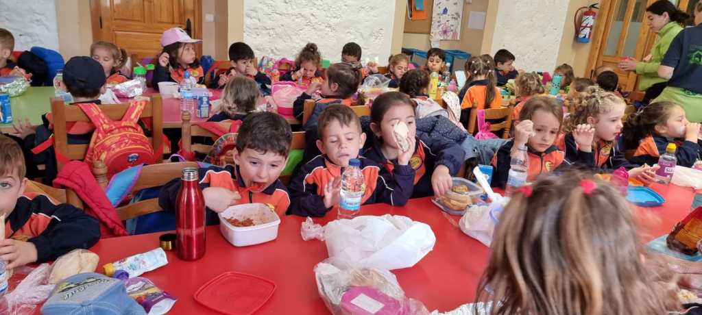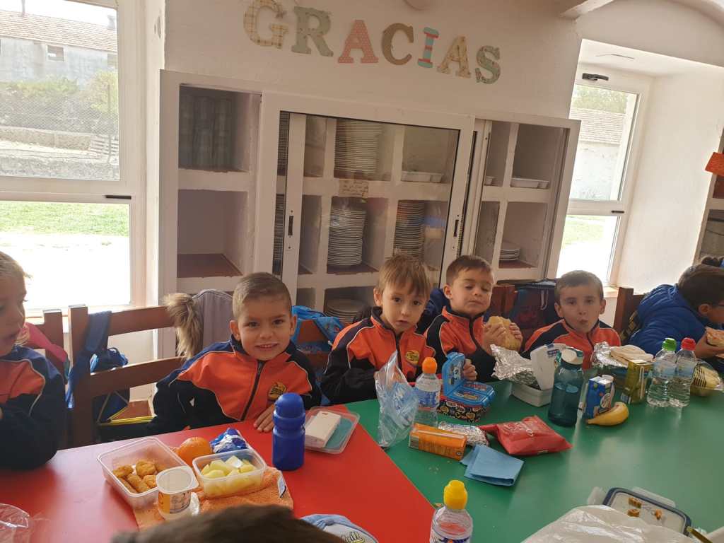 Llegó la hora de la comida, los mayores comimos todos juntos en un salón y los más pequeños junto con los alumnos de 2º lo hicimos ayudados por los monitores y nuestros profesores.