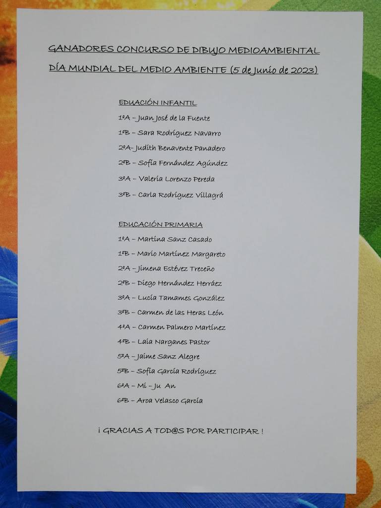 Pues bien, varios días después del evento, no ha faltado a clase ninguno de los 18 premiados y se han podido entregar los premios a los mejores trabajos. A continuación podéis ver alguna de las fotos de los dibujos ganadores del día 5 de junio, la lista de ganadores (uno por cada clase de Educación Infantil y Primaria) y sus fantásticas obras.