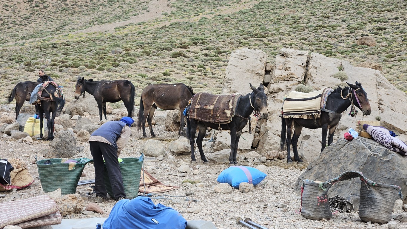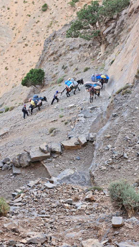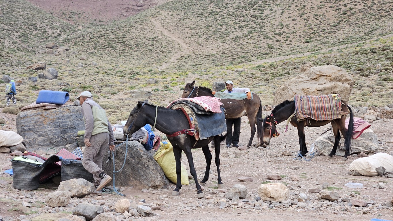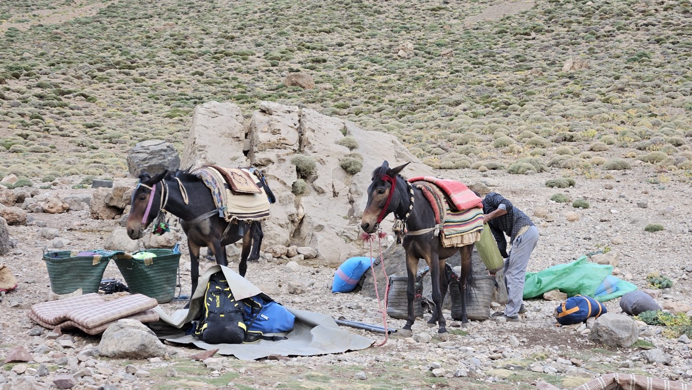 Cuando salimos de desayunar, los muleros ya han desarmado todas las tiendas y están a punto de cargar las mulas. La eficacia de estos hombres es indiscutible ¡Vaya profesionalidad! Ni lavarnos los dientes nos dejan. La verdad es que las mulas hoy tienen un trayecto duro, con pasos bastante complicados.