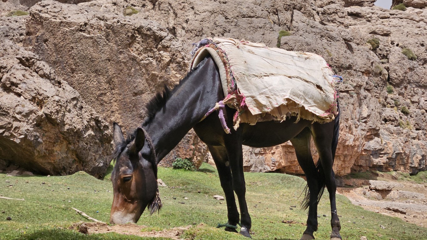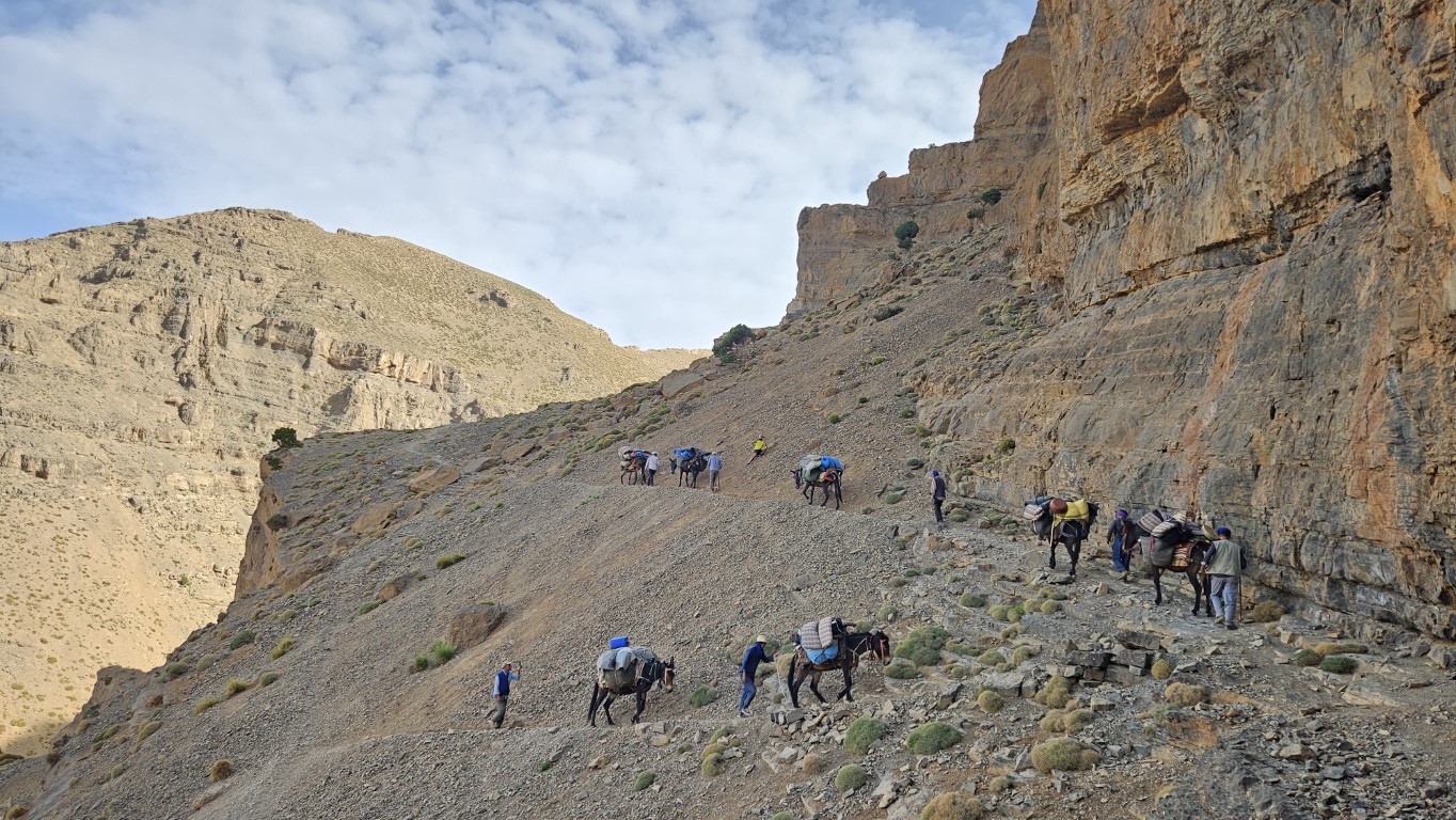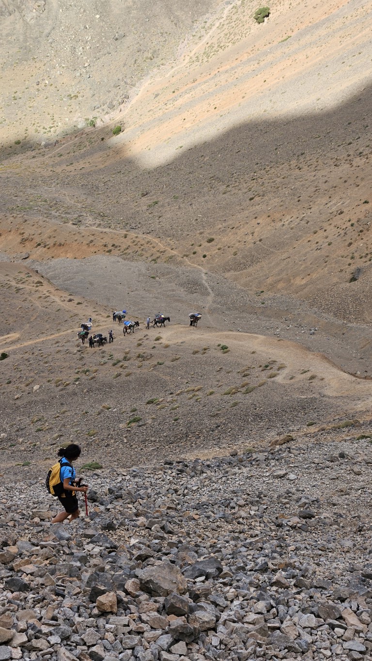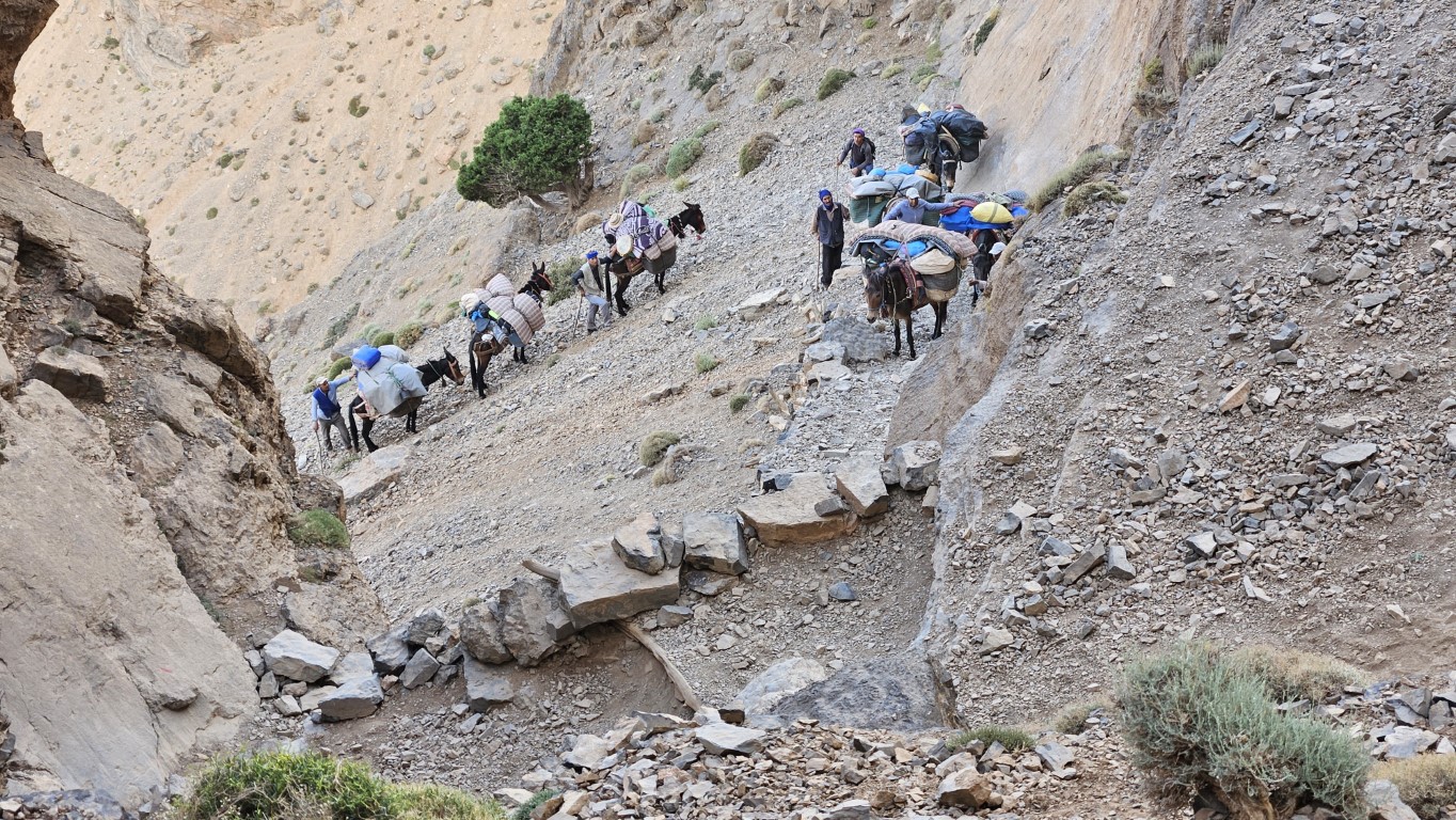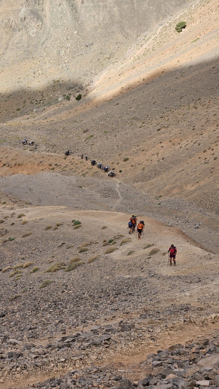 Sobre los 3000 metros comenzamos una subida muy fuerte para acceder al collado de Rougolt (3195 m). Este es un punto delicado para las mulas, lo tienen que hacer despacio, de una en una y ayudadas por los muleros. Es todo un espectáculo donde tenemos reservada primera fila.