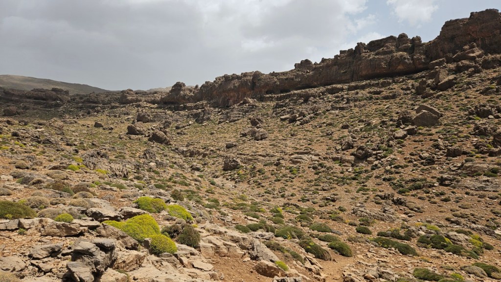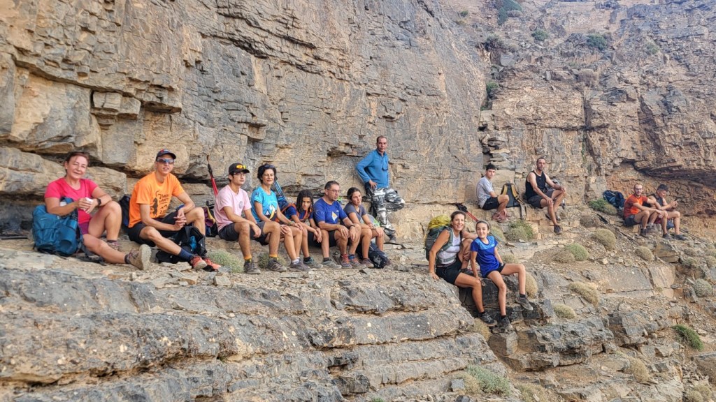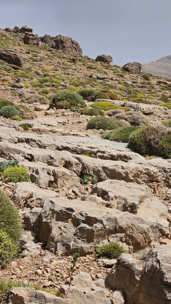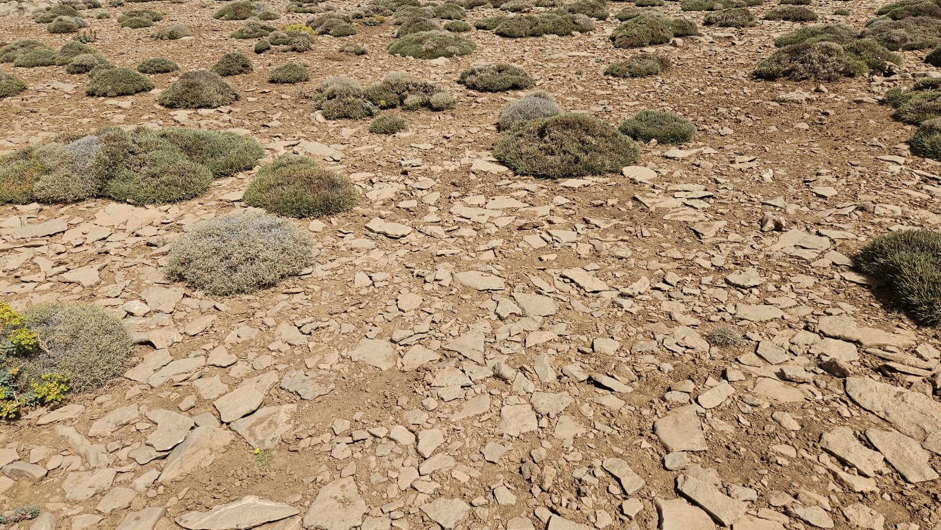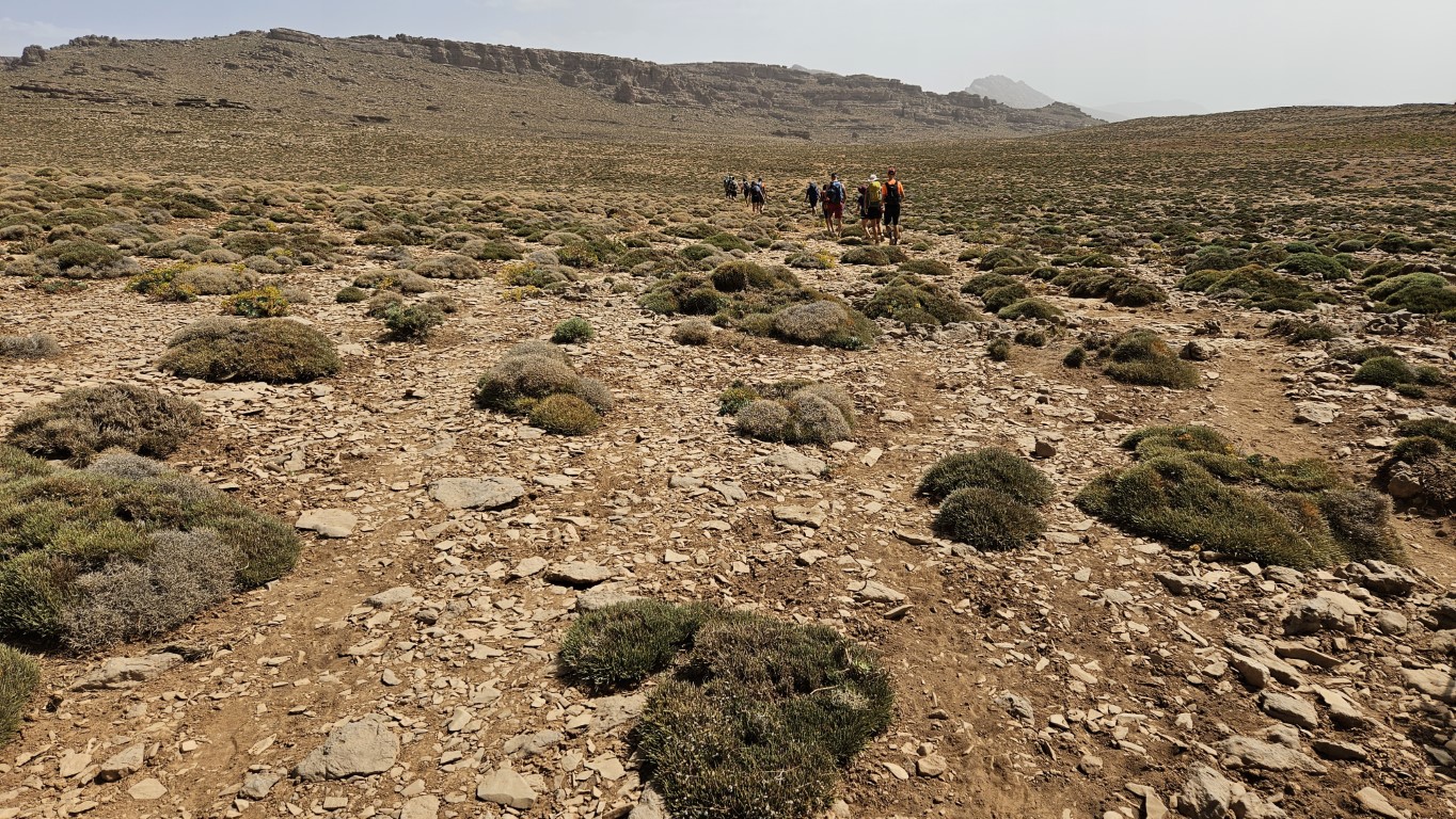 Salimos del campamento y rápidamente vamos ganado altura dejando abajo el valle. Aquí la vegetación prácticamente ha desaparecido, unos pequeños setos bajos nada más, y los más curiosos se dedican a buscar fósiles y rosas del desierto.