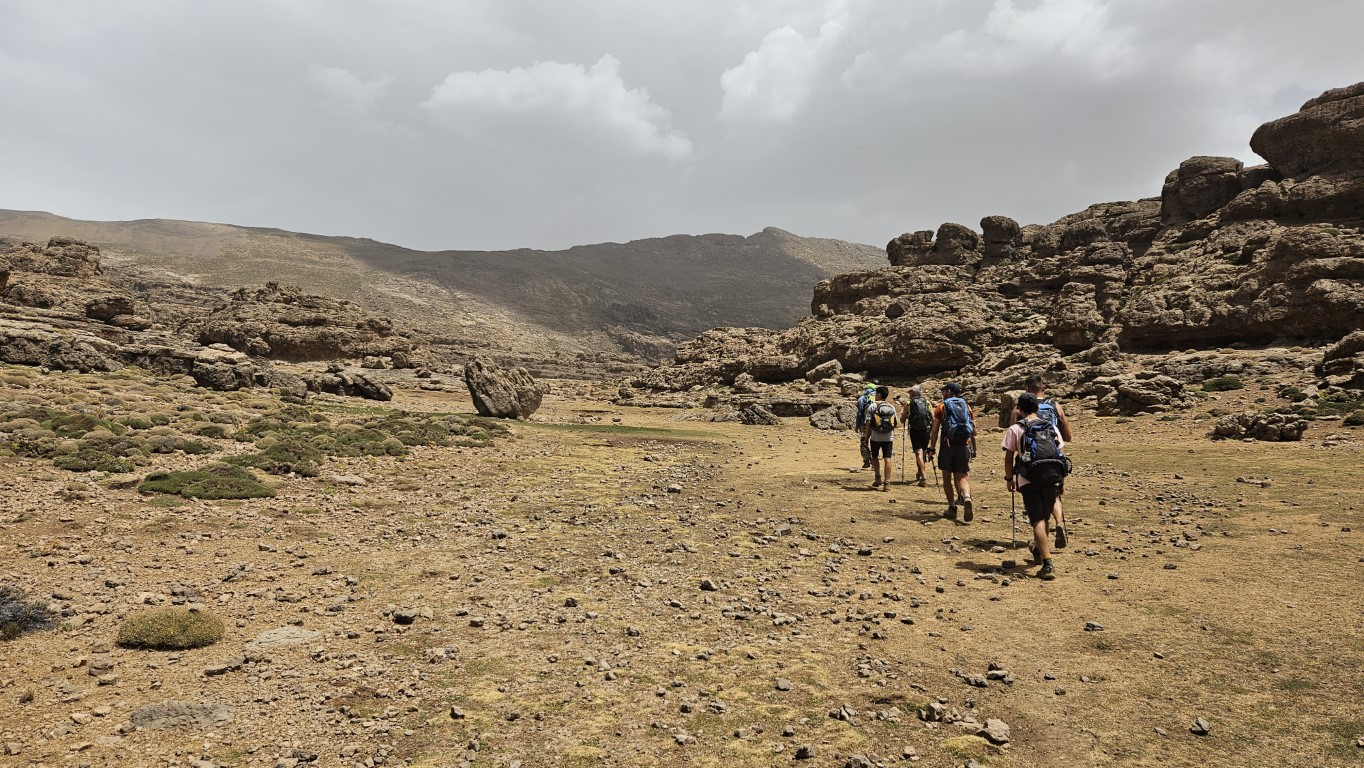 Una vez repuestos, continuamos la marcha hasta el final de la llanura donde montaremos el campamento cerca del refugio.