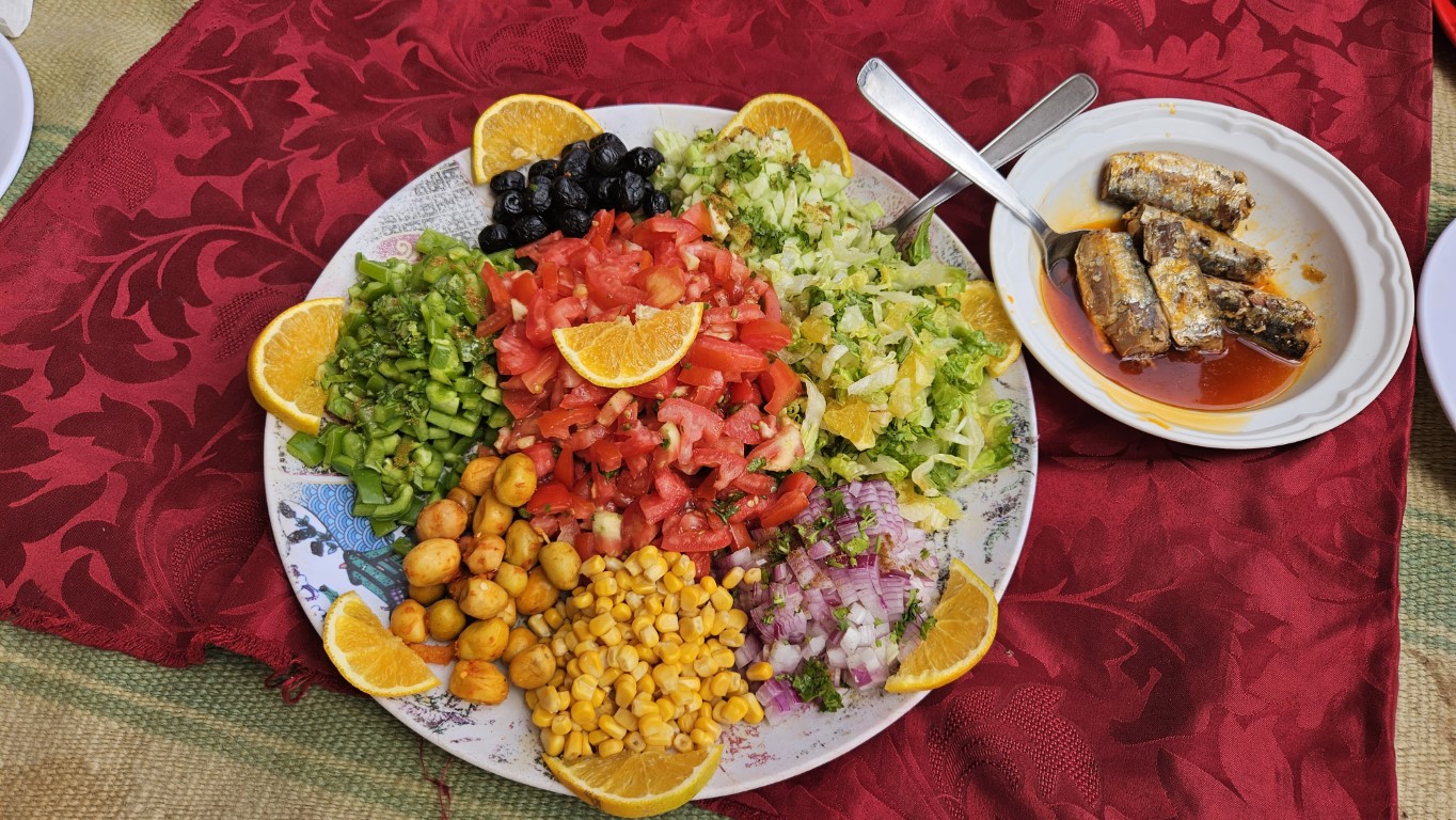 Antes de llegar a esta impresionante explanada es hora de comer. Hoy tenemos una deliciosa ensalada de pasta con cebolla, pimiento, tomate, lechuga y maíz finamente picadas junto con unas buenísimas olivas. Todo ello acompañado de unas sabrosas sardinas. Este Yousef es una joya.