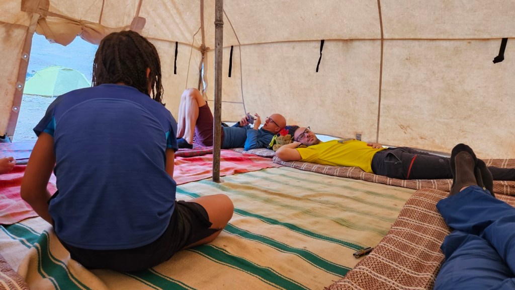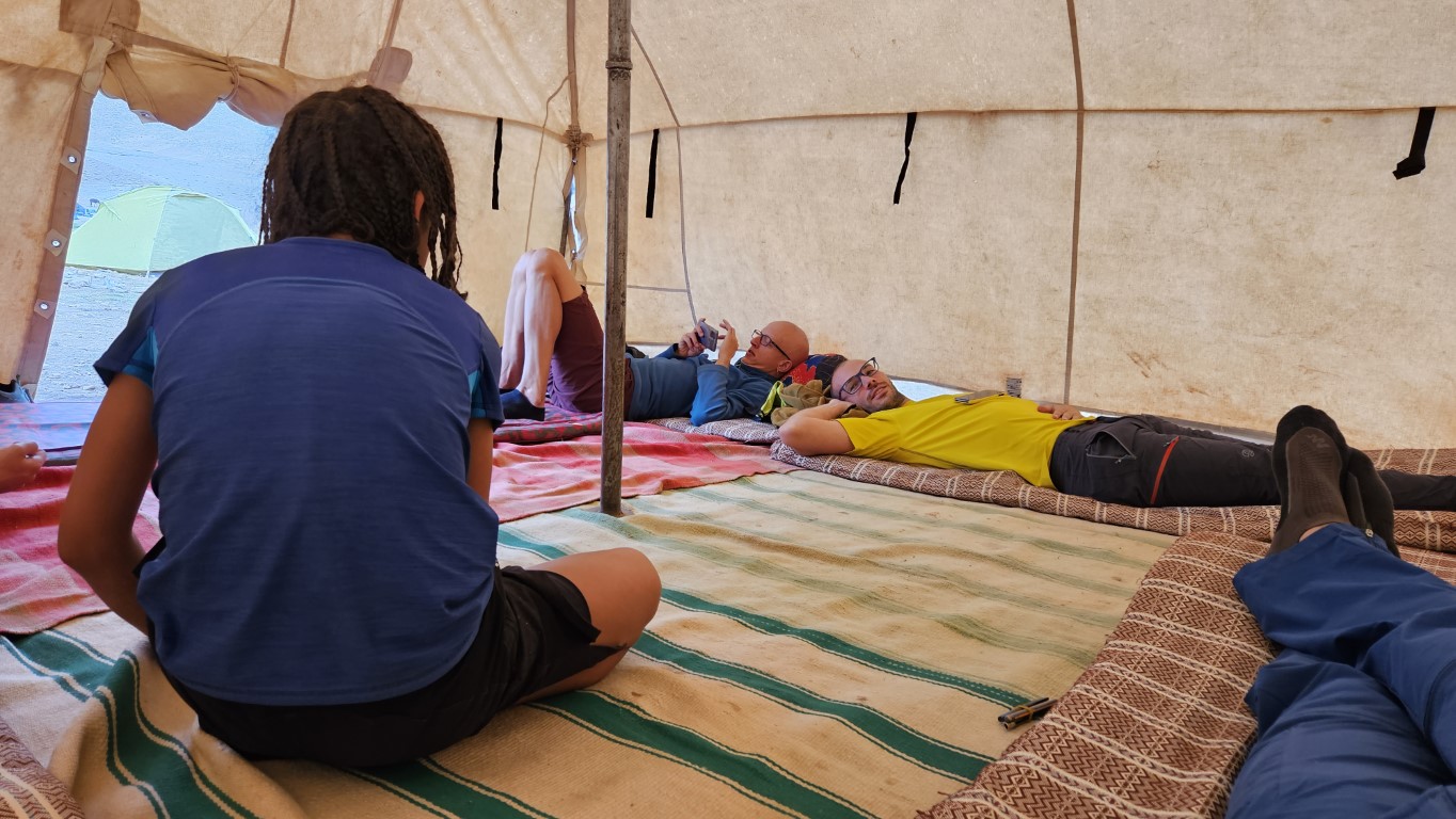 Como la tormenta sigue presente, después de lavarnos adecuadamente y hacer nuestras necesidades en unas letrinas bastante sucias, donde debemos echar agua con un cubo para que se vayan las deposiciones, nos metemos en las haimas, para conversar con nuestros compañeros sobre el reto de mañana.