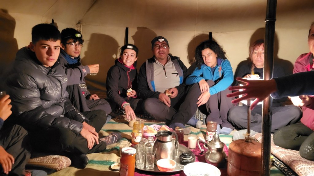 Nos levantamos a las 4:30. Es noche cerrada por lo que debemos llevar los frontales en todo momento. Todavía con las legañas en los ojos vamos a la haima a desayunar. Definitivamente el pan ha dejado su consistencia para convertirse en una masa indefinida. Pero el día será duro, por lo que debemos alimentarnos adecuadamente.