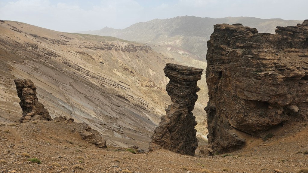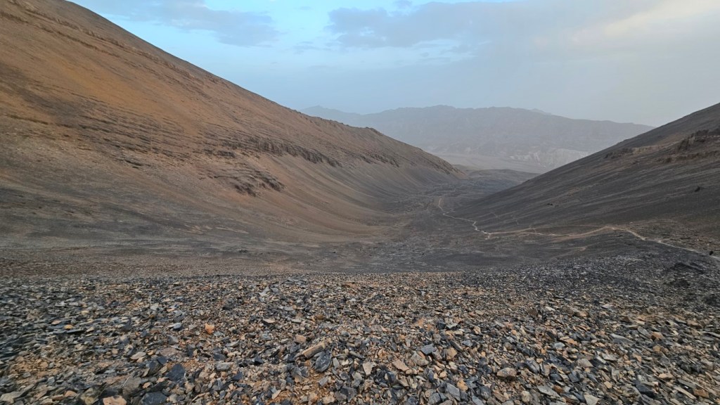 Una vez «descansados» en este magnifico pedregal, continuamos camino hacia nuestro campamento. El terreno va perdiendo desnivel progresivamente hasta llegar a la llanura de un gigantesco valle, por el que en tiempos inmemoriales circulaba un rio seco.