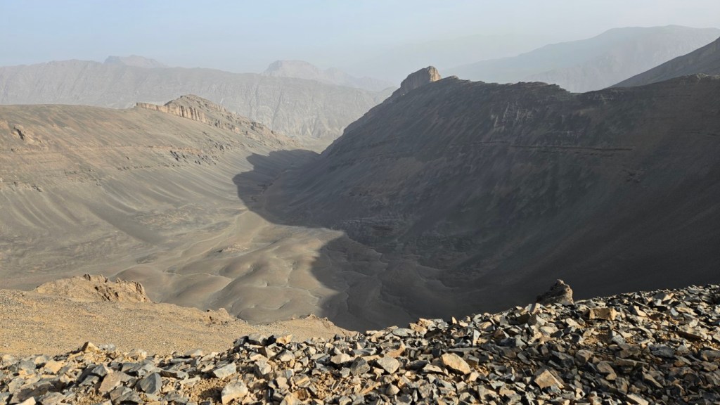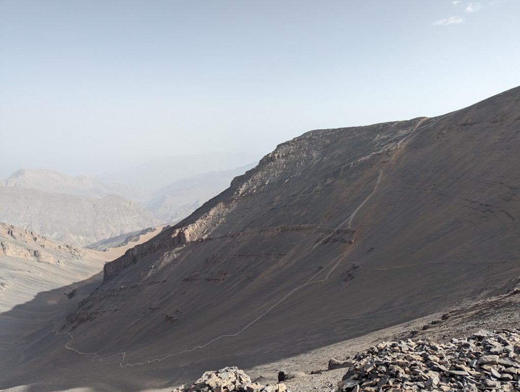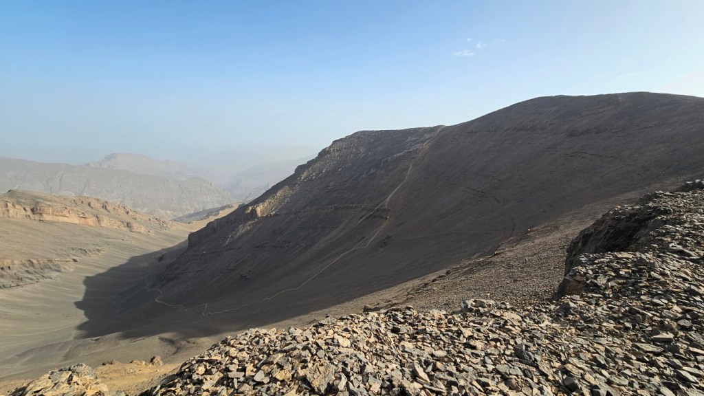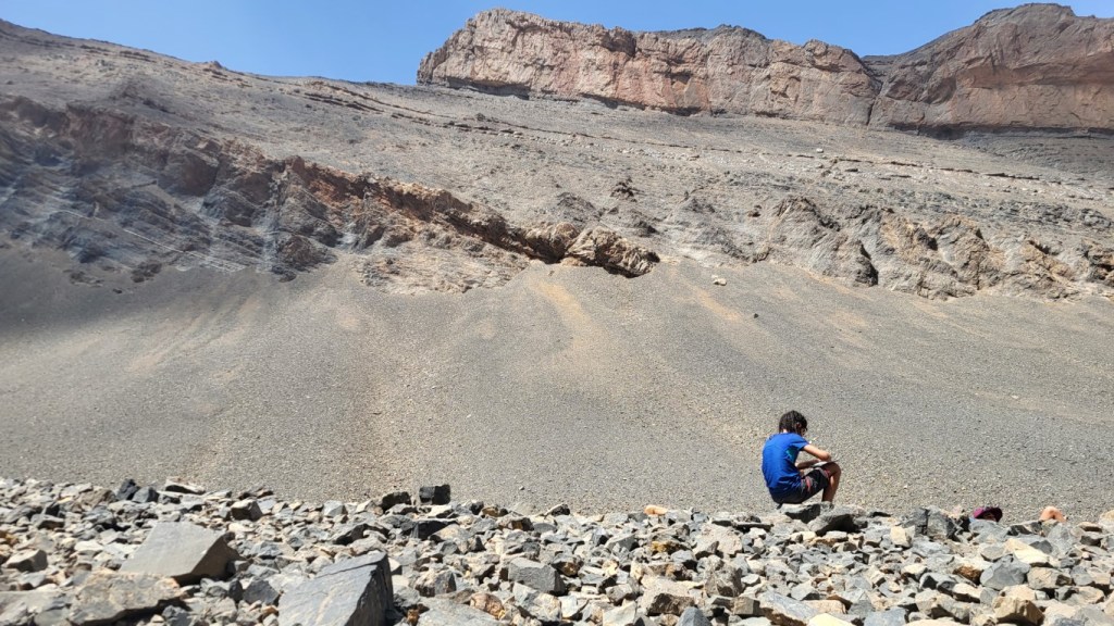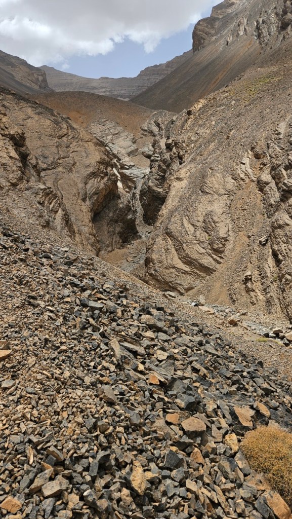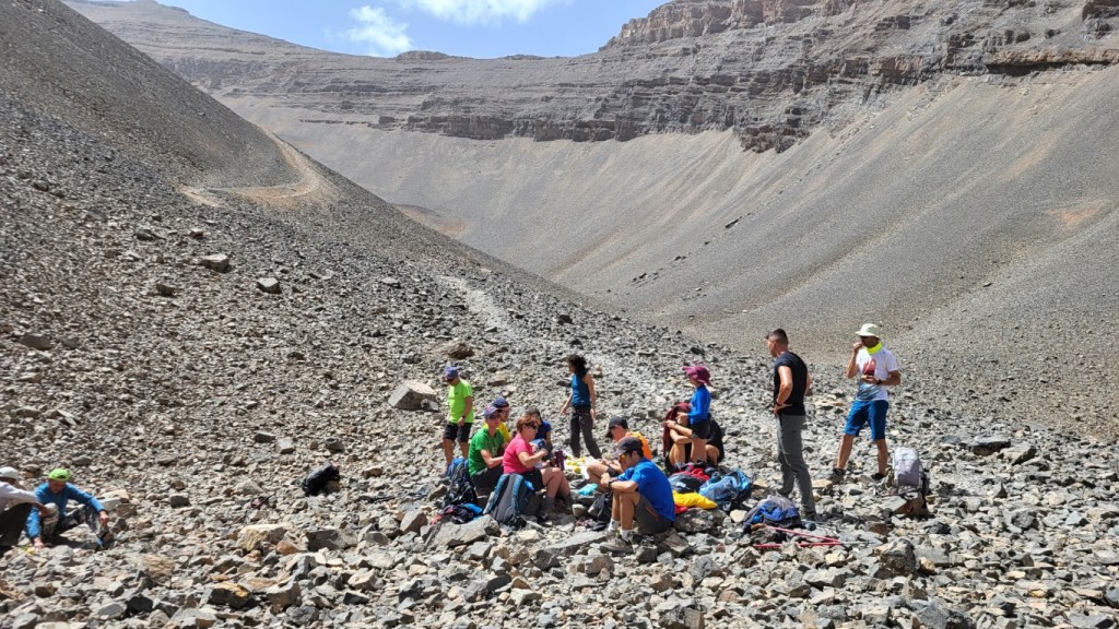 Después de los besos y abrazos, un sinfín de fotografías para la familia e hidratarnos adecuadamente, comenzamos el descenso. Los primeros kilómetros de bajada son a través de una gran pedrera. Al principio bastante empinada pero que rápidamente pierde inclinación. Bajamos con mucha precaución debido a la gran cantidad de piedras sueltas que hay en la bajada. ¡Pero que demonios! De repente, pidiendo permiso a Mohamed, me lanzo a toda velocidad deslizándome por la fuerte pendiente. Es mucho más rápido y lo más importante, más divertido. ¿Dónde va este loco?