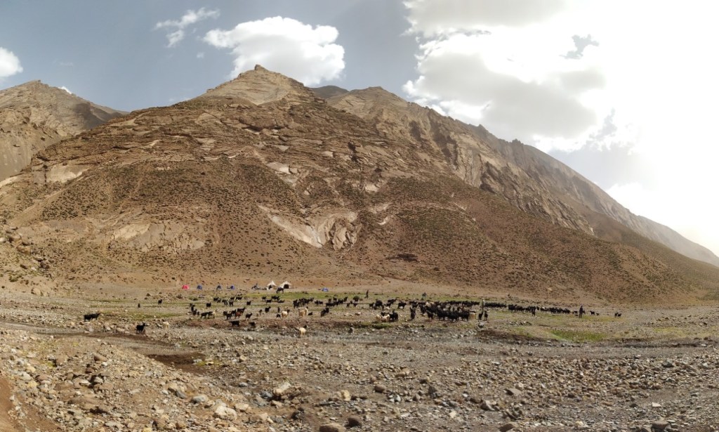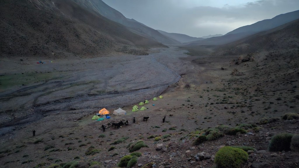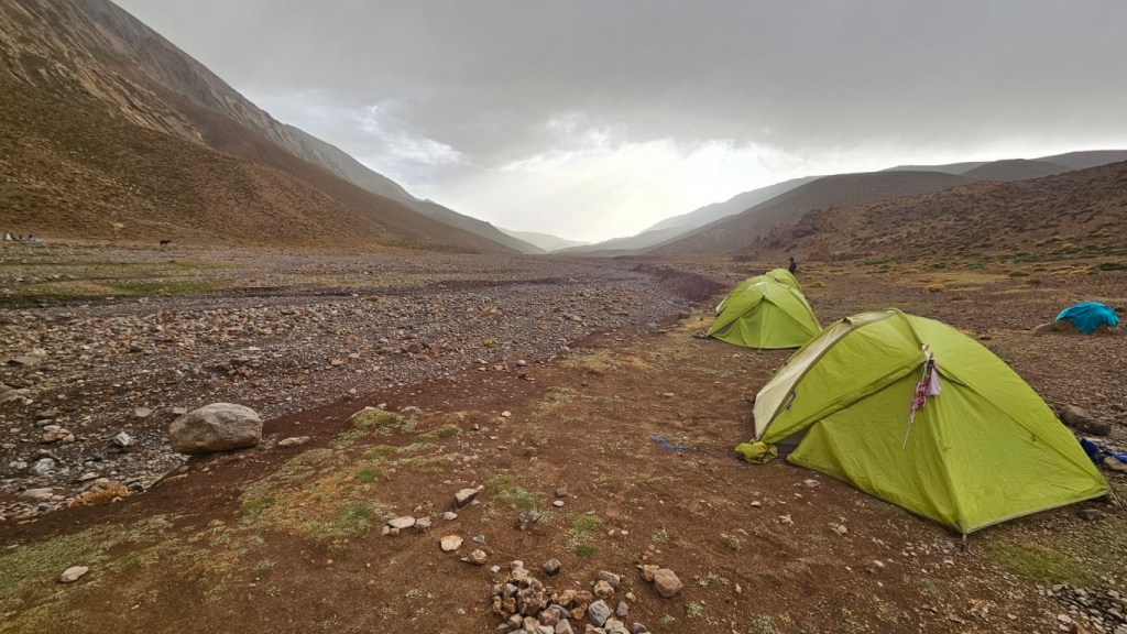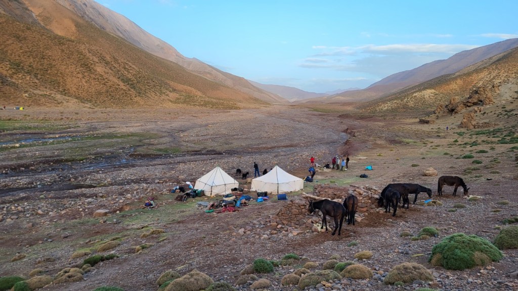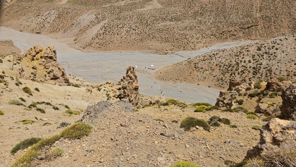 El campamento lo han montado al final del valle, a la orilla de donde existe una surgencia en la tierra naciendo un nuevo río. El lugar es idílico. No en vano enfrente de nosotros tenemos otra expedición que también ha subido al M Goun. Después de un intenso día nos damos nuestro primer baño. También lavamos la ropa para tener para las jornadas posteriores.