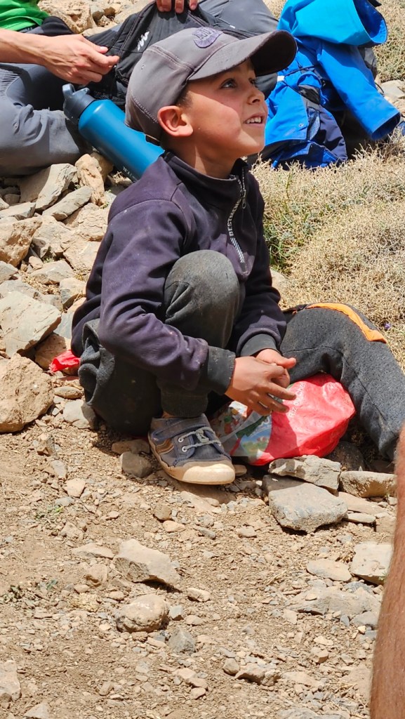 Por el camino nos encontramos multitud de niños y niñas, vendiendo o pidiéndonos multitud de cosas. Estos chavales y chavalas pertenecen a comunidades que practican un estilo de vida pastoral y nómada en las montañas del Alto Atlas de Marruecos. Se dedican principalmente a la ganadería, como la cría de ovejas, cabras y ocasionalmente otros animales, y siguen un patrón de movimiento estacional en busca de pastos frescos y agua para su ganado. No tienen una residencia fija y se desplazan según las estaciones y las necesidades de su ganado.