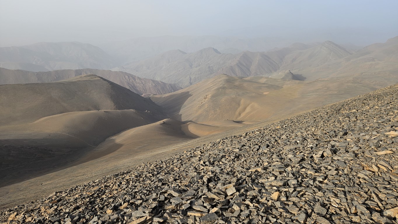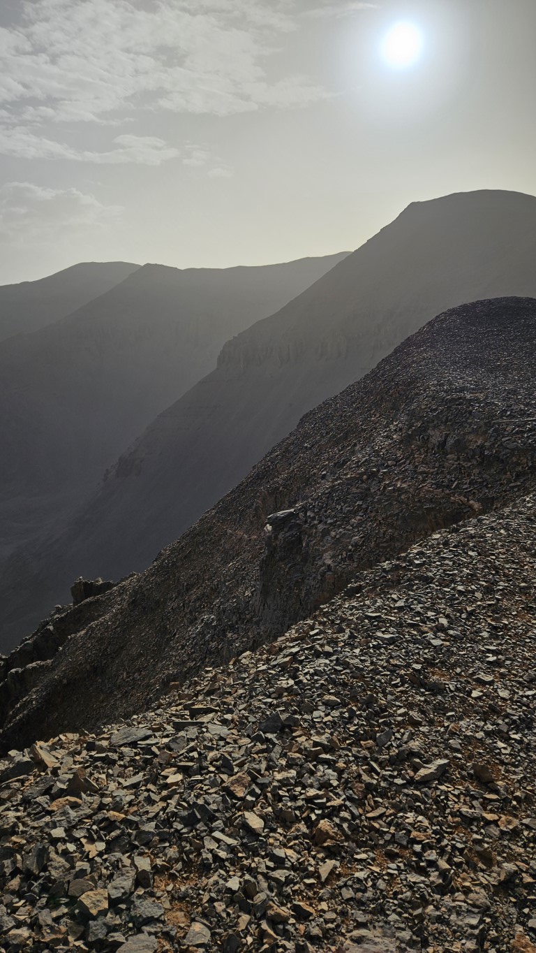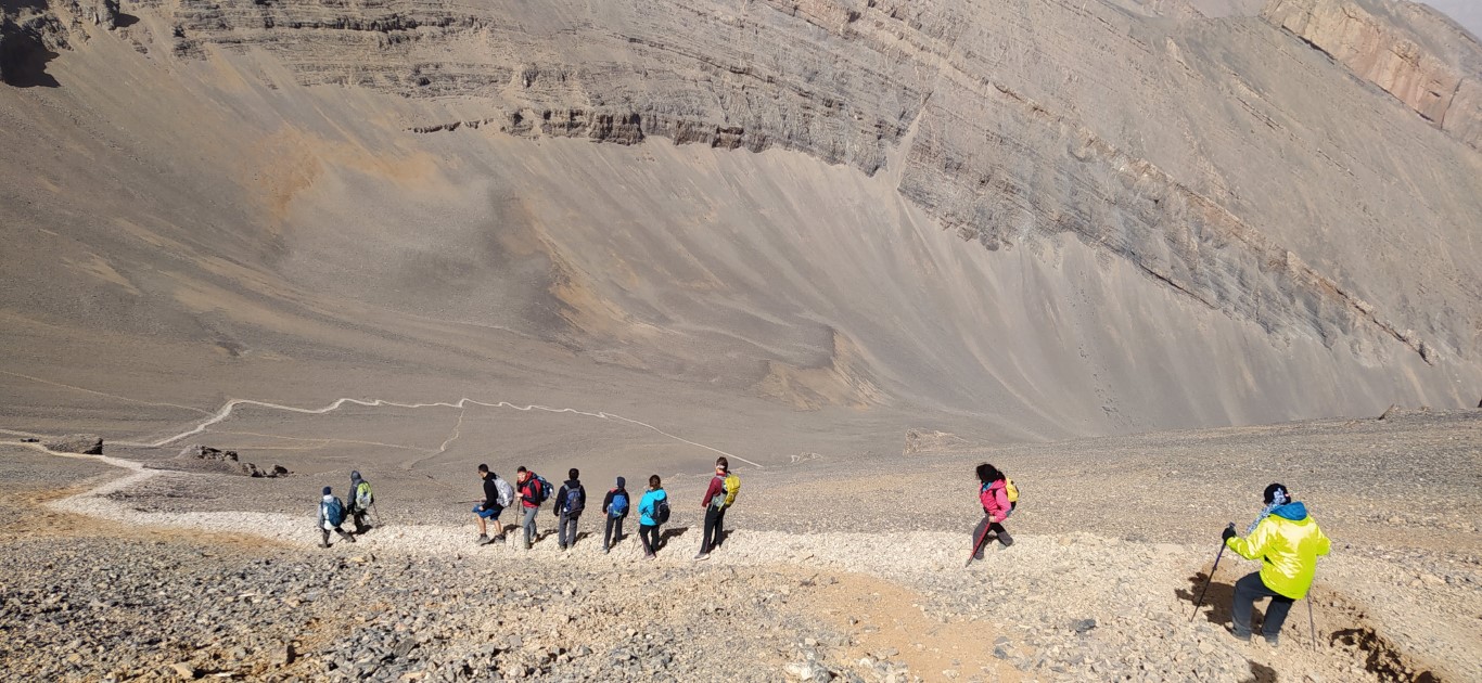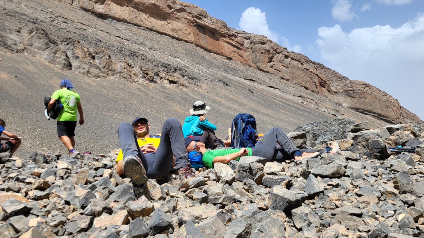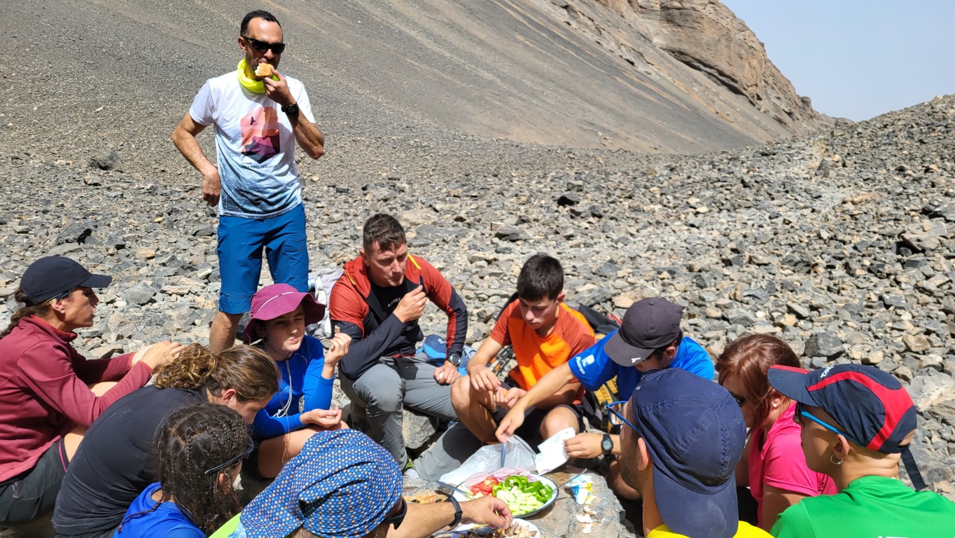 Después de los besos y abrazos, un sinfín de fotografías para la familia e hidratarnos adecuadamente, comenzamos el descenso. Los primeros kilómetros de bajada son a través de una gran pedrera. Al principio bastante empinada pero que rápidamente pierde inclinación. Bajamos con mucha precaución debido a la gran cantidad de piedras sueltas que hay en la bajada. ¡Pero que demonios! De repente, pidiendo permiso a Mohamed, me lanzo a toda velocidad deslizándome por la fuerte pendiente. Es mucho más rápido y lo más importante, más divertido. ¿Dónde va este loco?