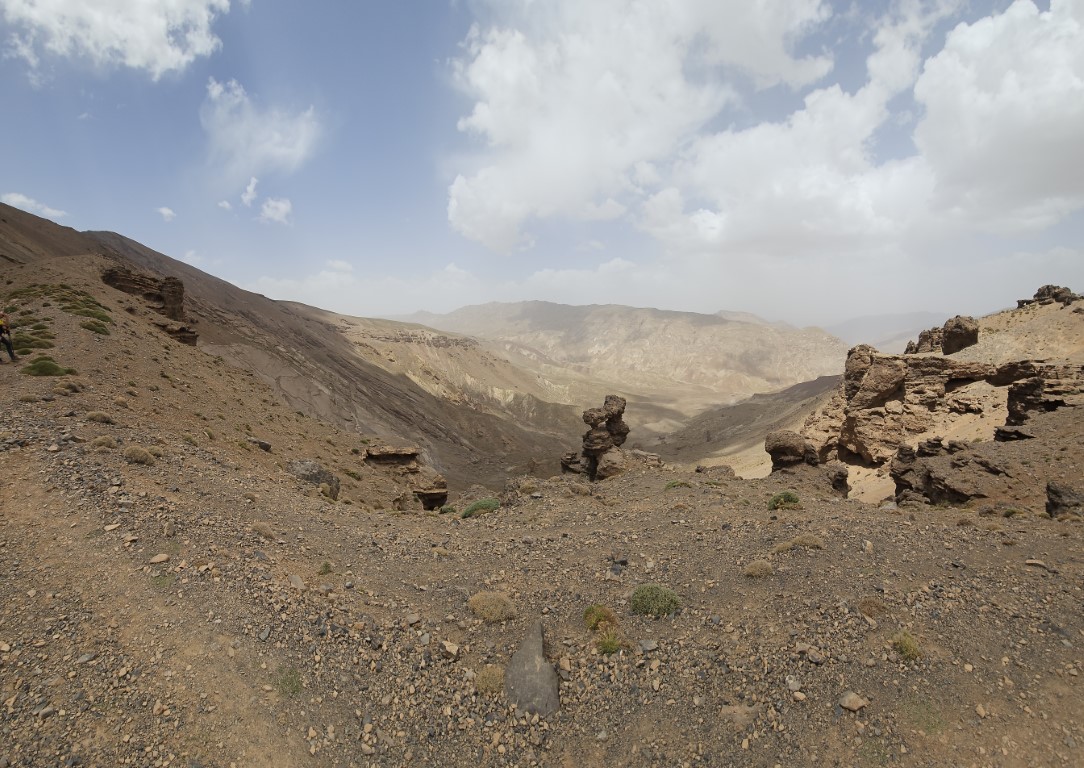 Una vez «descansados» en este magnifico pedregal, continuamos camino hacia nuestro campamento. El terreno va perdiendo desnivel progresivamente hasta llegar a la llanura de un gigantesco valle, por el que en tiempos inmemoriales circulaba un rio seco.