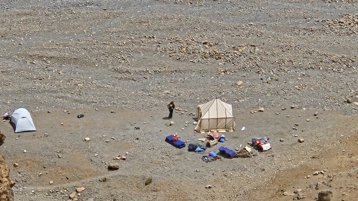 El campamento lo han montado al final del valle, a la orilla de donde existe una surgencia en la tierra naciendo un nuevo río. El lugar es idílico. No en vano enfrente de nosotros tenemos otra expedición que también ha subido al M Goun. Después de un intenso día nos damos nuestro primer baño. También lavamos la ropa para tener para las jornadas posteriores.