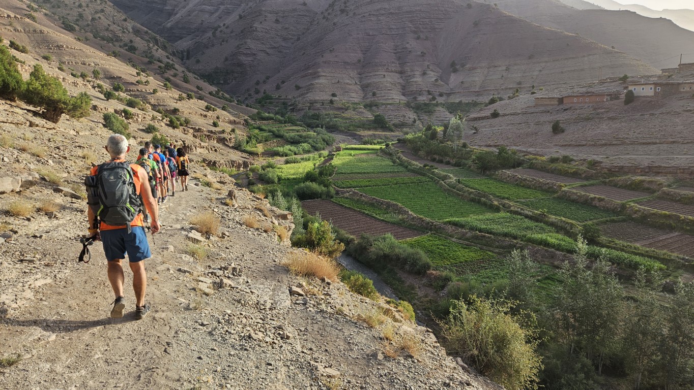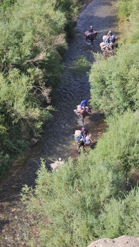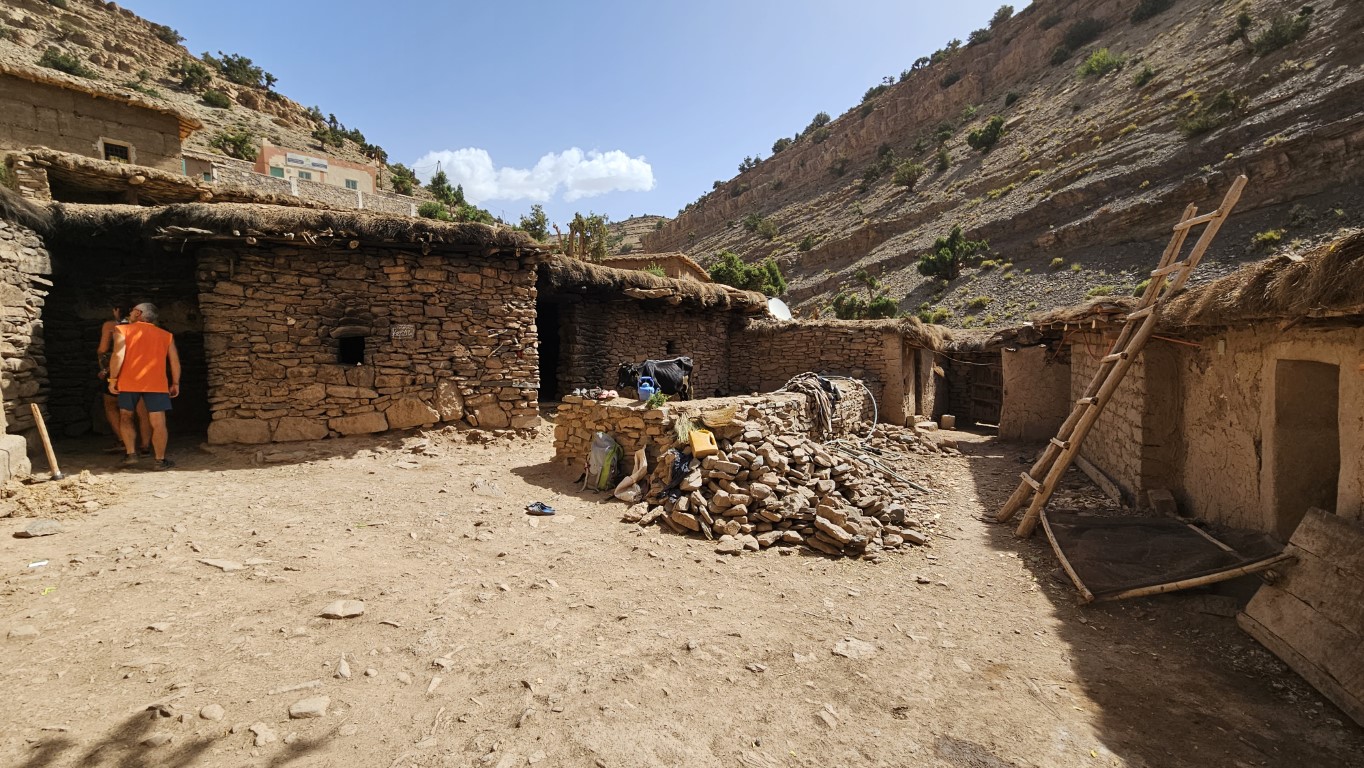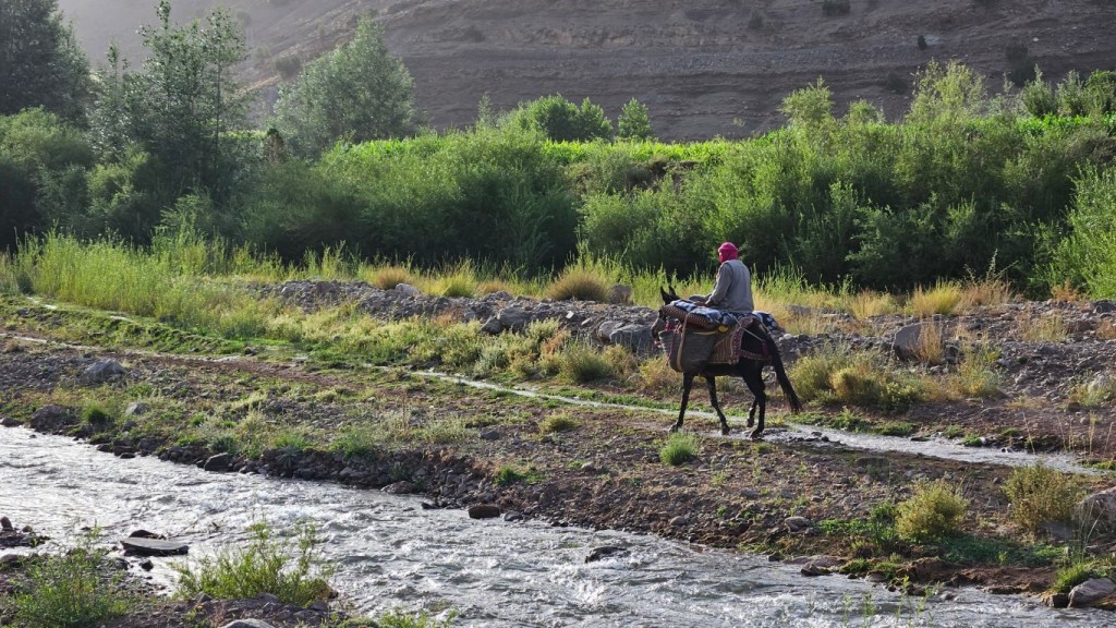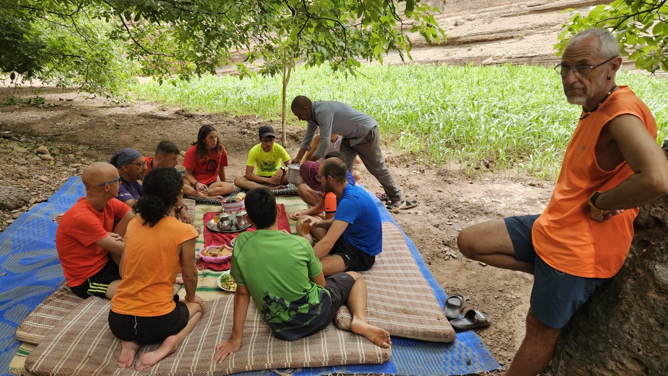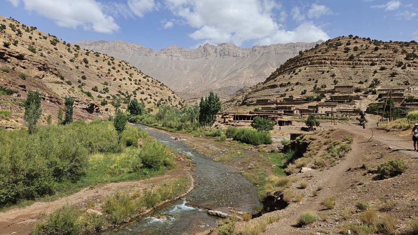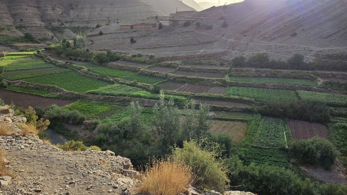 Abandonamos Tagherft a través de las vegas de cultivo dispuestas junto al río. El sistema de acequias para regadío nos deja a todos sorprendidos. Se trata de un sistema de ramales muy ingenioso que hace que todos los vecinos dispongan de agua. Atrás quedan los días de falta de agua. Aquí parece tenerla en abundancia. Durante el trayecto por las aldeas podemos ver como viven estos pueblos bereberes.