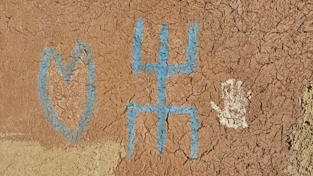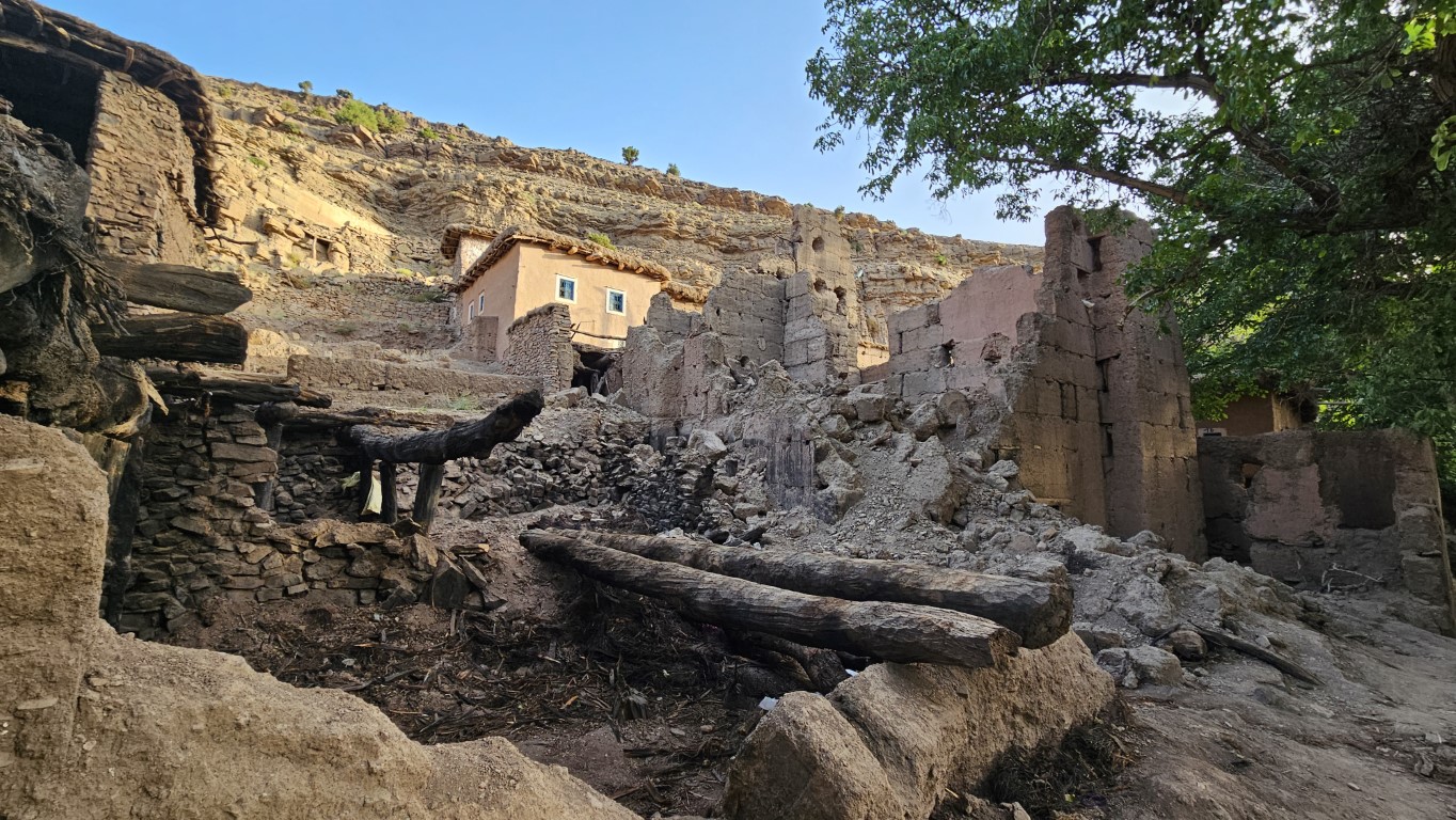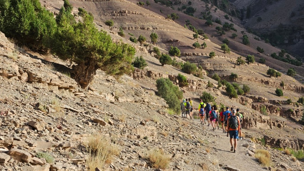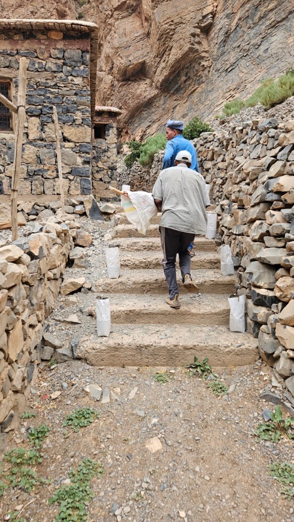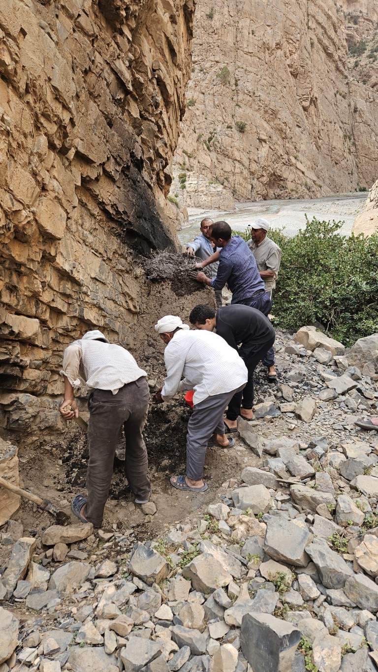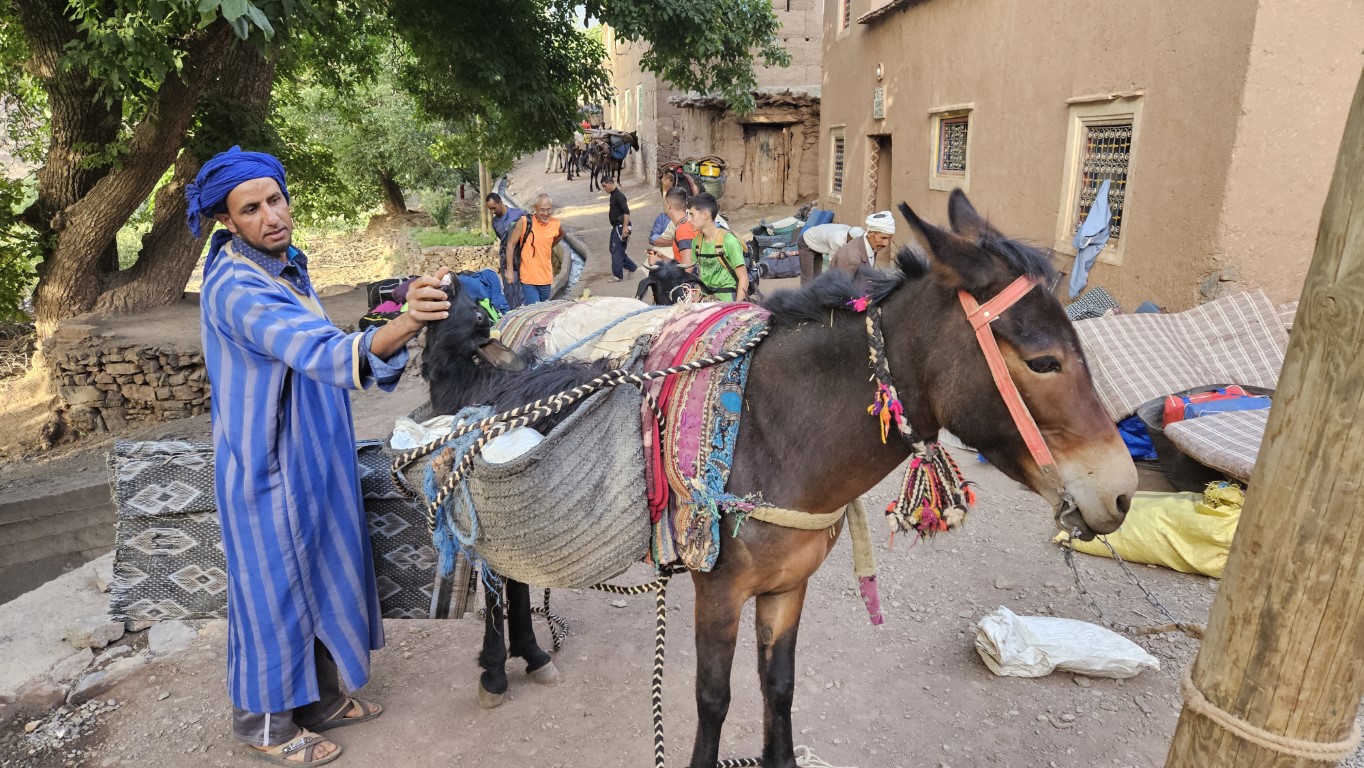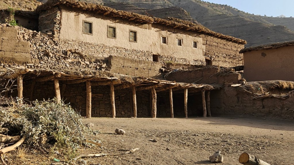 Abandonamos Tagherft a través de las vegas de cultivo dispuestas junto al río. El sistema de acequias para regadío nos deja a todos sorprendidos. Se trata de un sistema de ramales muy ingenioso que hace que todos los vecinos dispongan de agua. Atrás quedan los días de falta de agua. Aquí parece tenerla en abundancia. Durante el trayecto por las aldeas podemos ver como viven estos pueblos bereberes.
