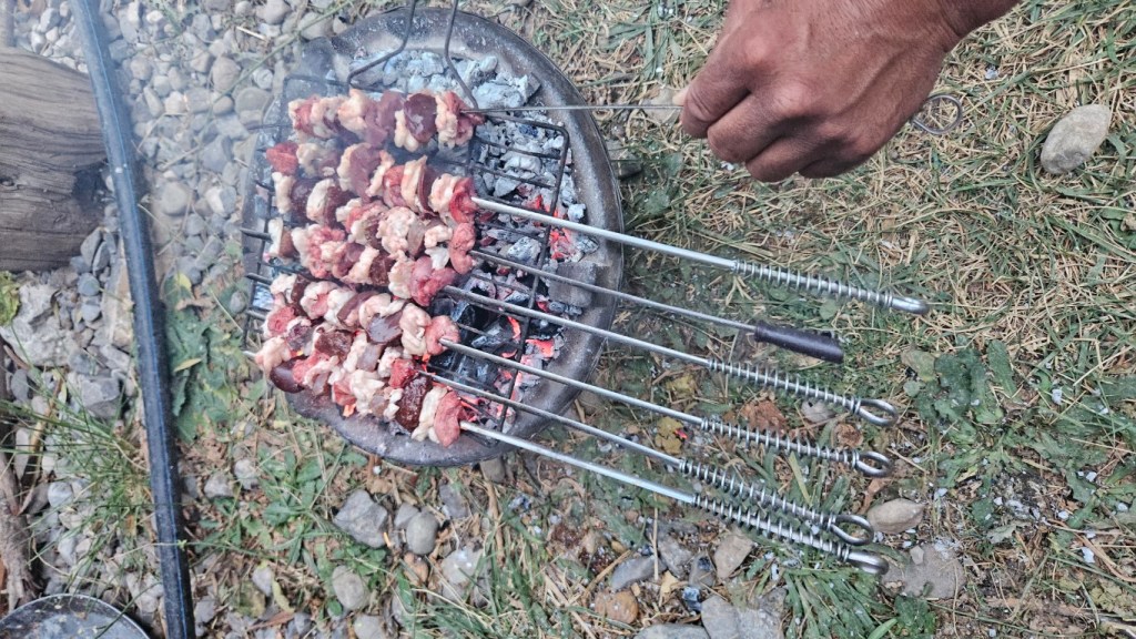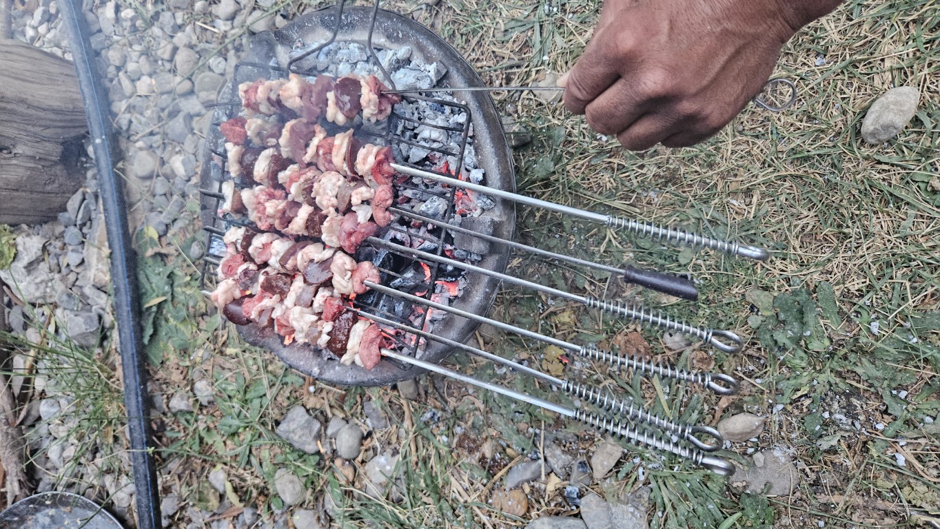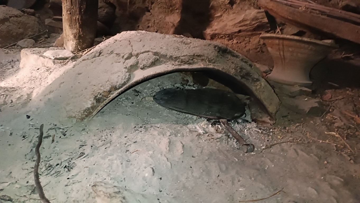 Nos preparan dos tipos de cabritos. Asado al estilo tradicional, en un horno de barro que previamente habían fabricado ellos. Y guisado, con varias capas de verduras. Aprovechan todo. Con la casquería hacen unas brochetas sólo aptas para los estómagos menos delicados.