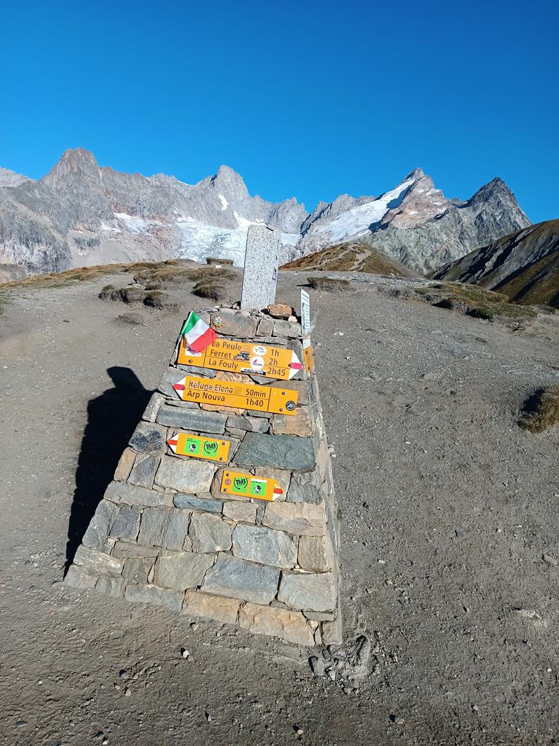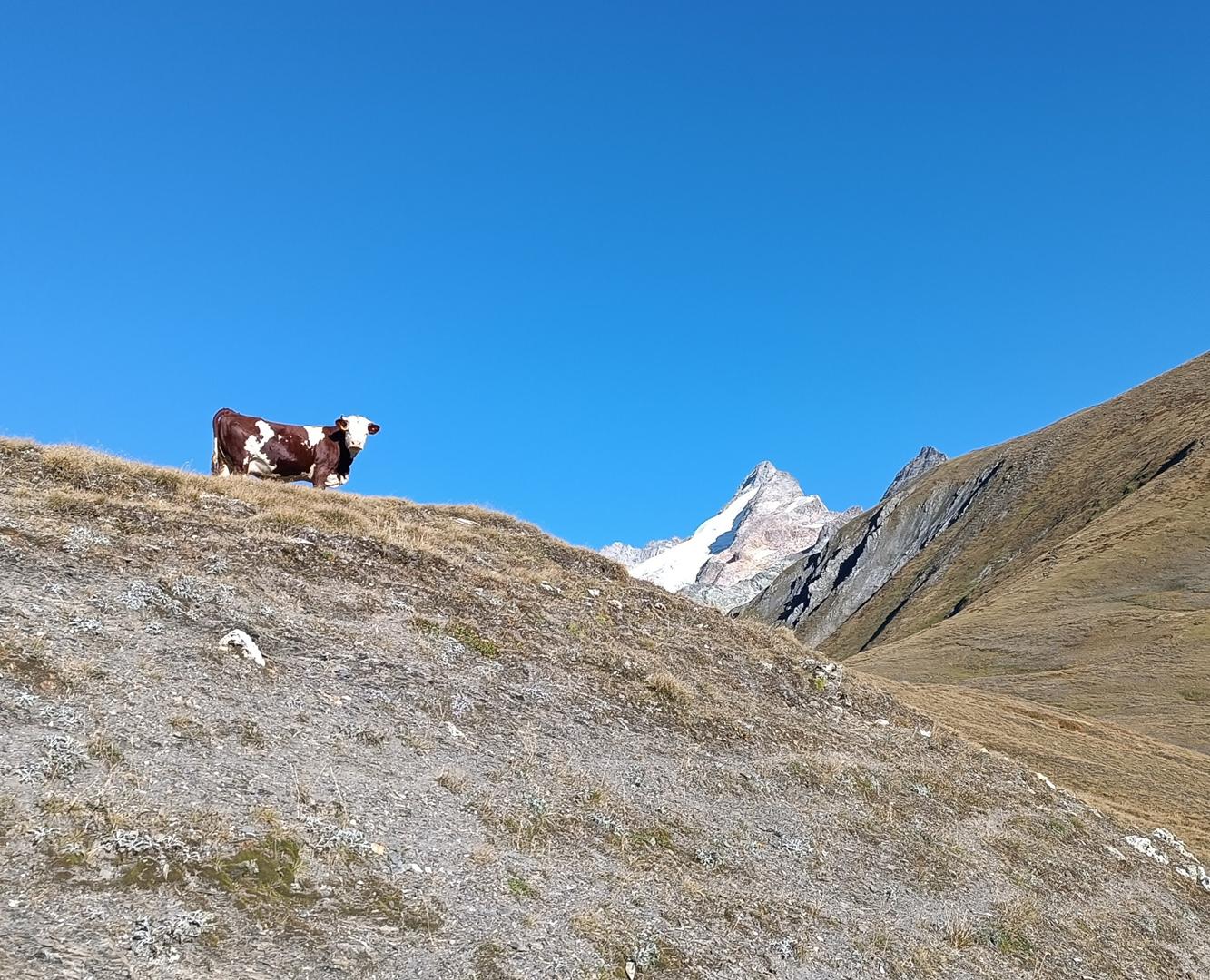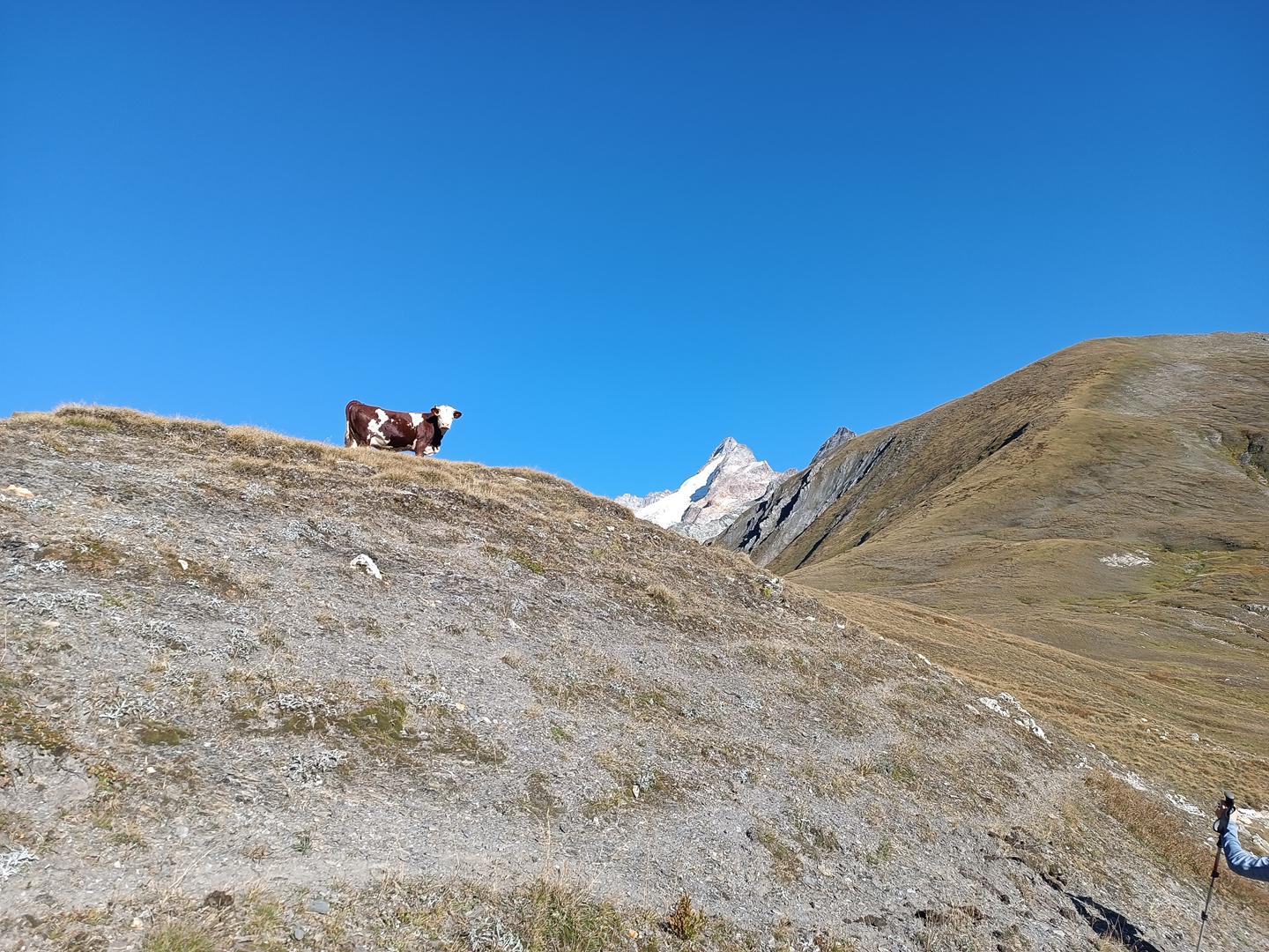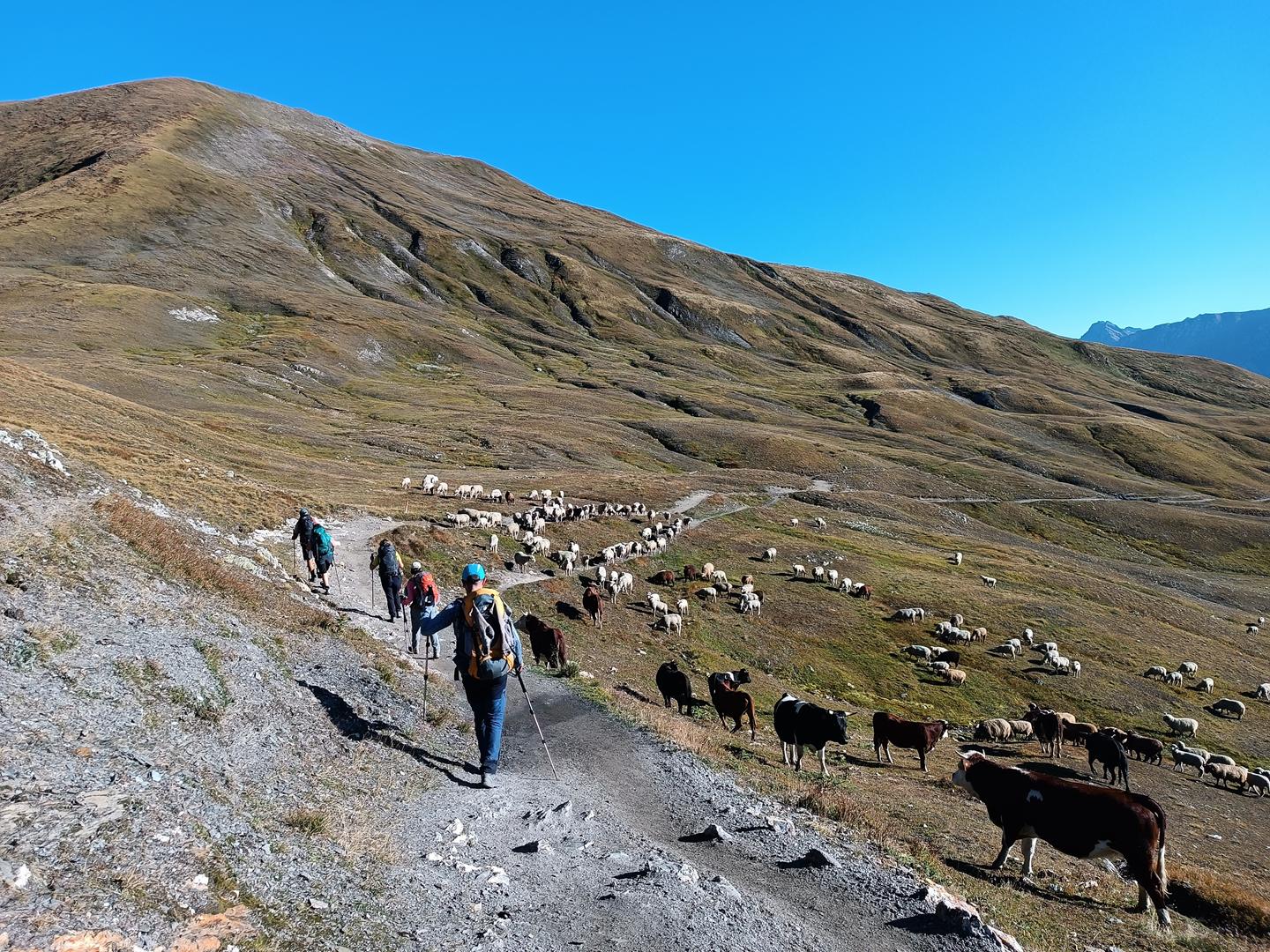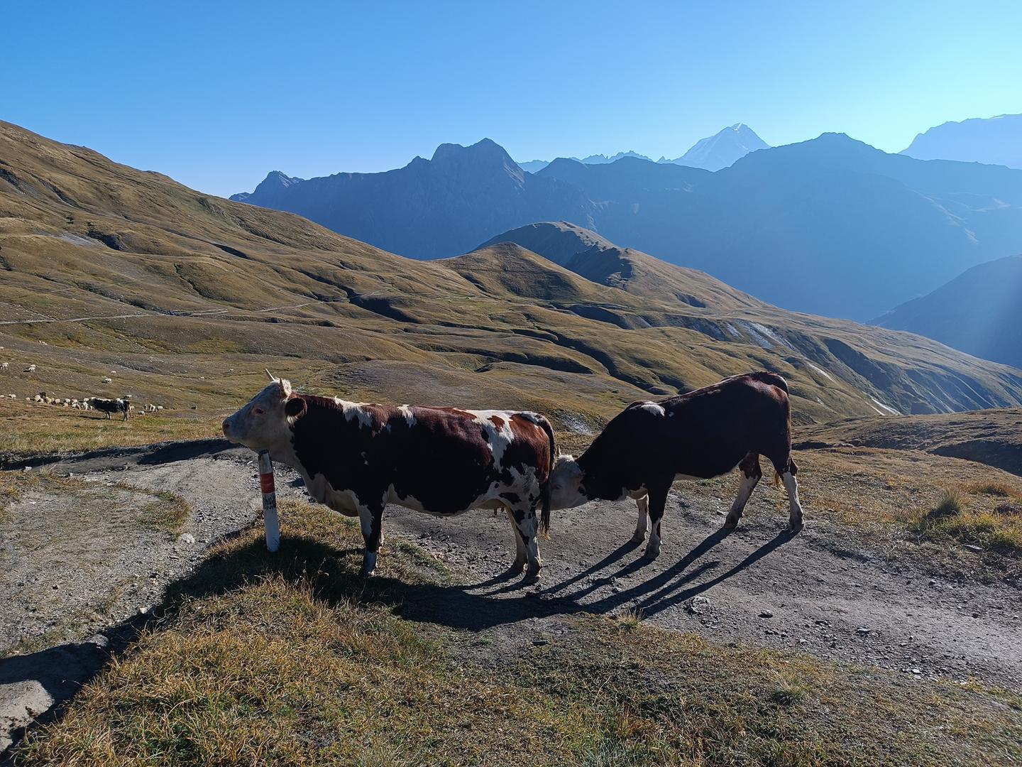 En el desayuno el refugio Elena se portó. Subimos, como siempre, hasta el Col de Ferret (2537 mts), cruce a Suiza. Bajamos por el valle, nos encontramos con vacas, ovejas y ciclistas.