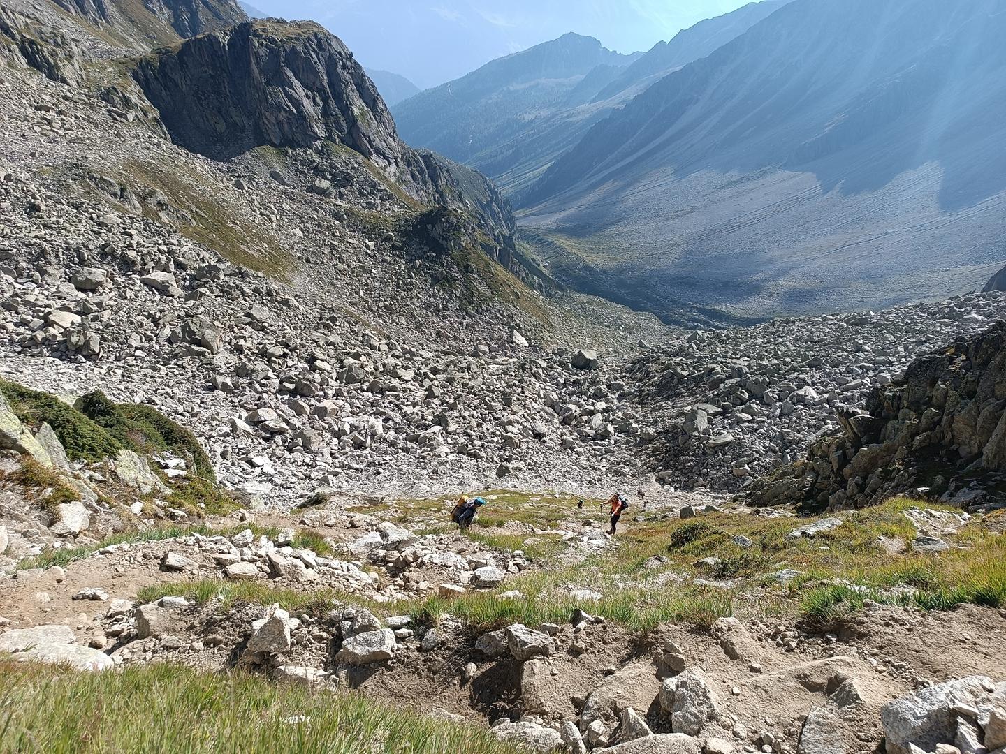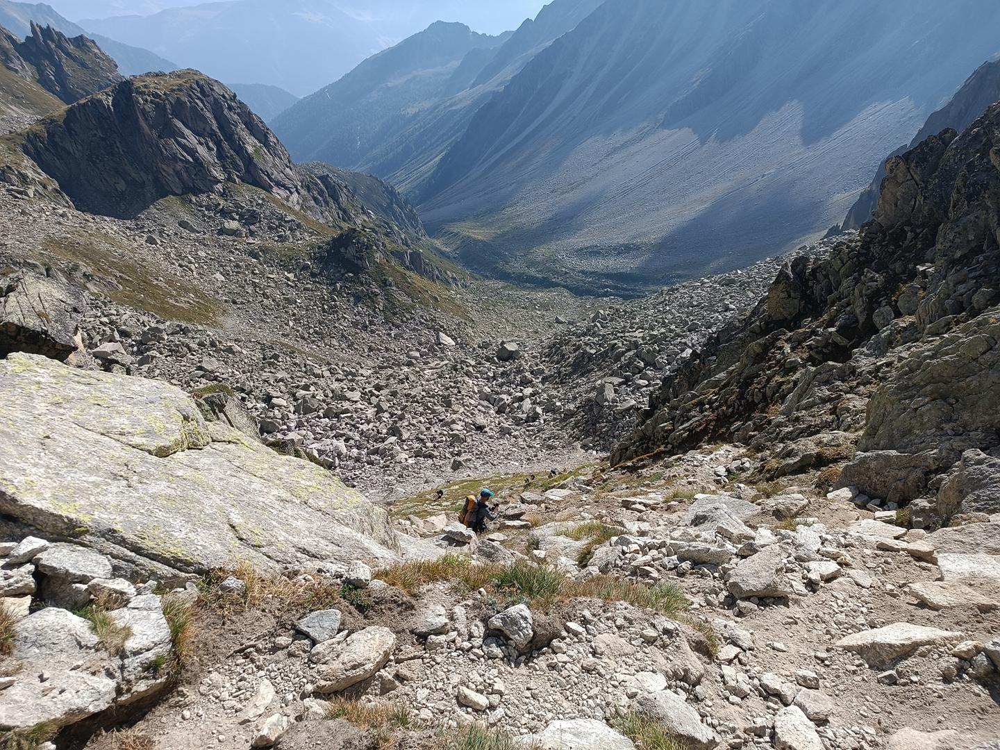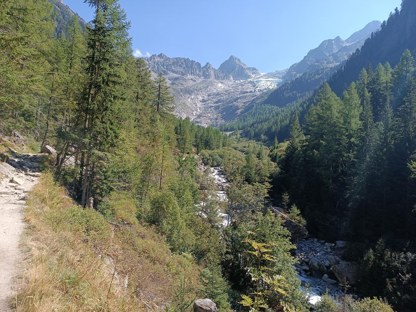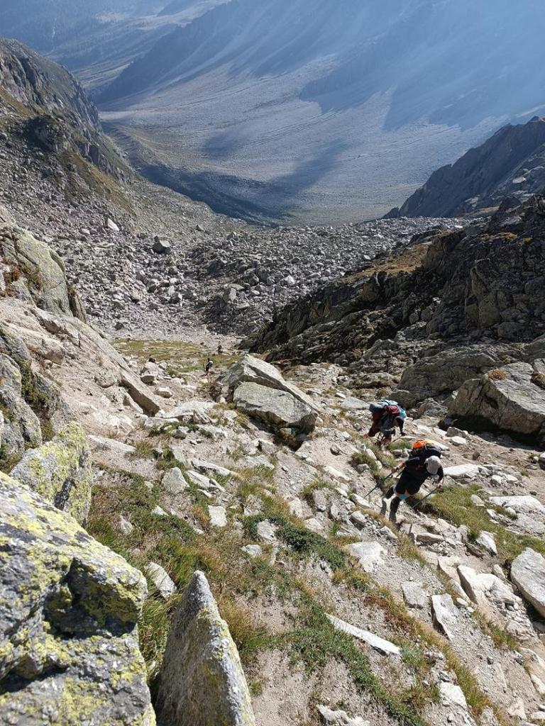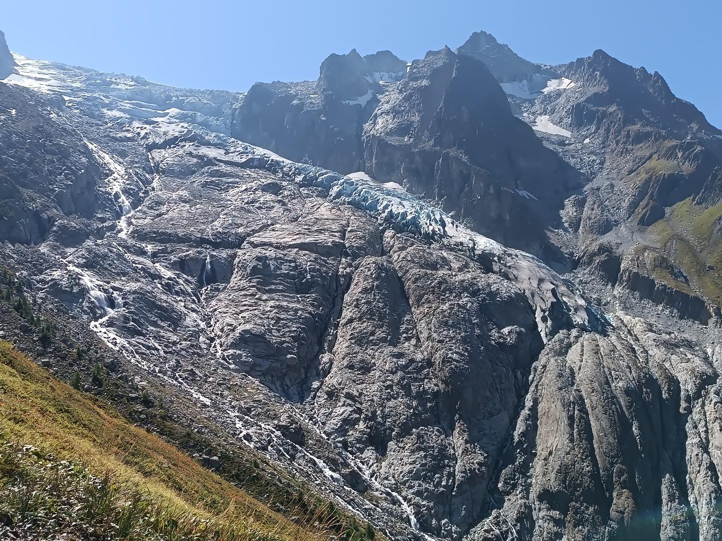 Hasta la fenetre d’Arpette hay una subida dura, muy montañera, con piedras y pasinos guapos. Yo me encuentro bien (será efecto suite) y llego la primera al collado. Es un collado con vistas a la morrena de un glaciar por donde subimos desde Arpette y con vistas al glaciar de Trient, somos testigos durante toda la bajada de como se está deshaciendo. La bajada tb es larga y dura. Llegamos al río propongo lavado de pies al pie del glaciar, pero no tengo apoyo suficiente, hay ganas de llegar al hotel (hay un bar pero no paramos) y seguimos una hora hasta el col de Forclaz por un sendero familiar.