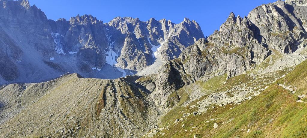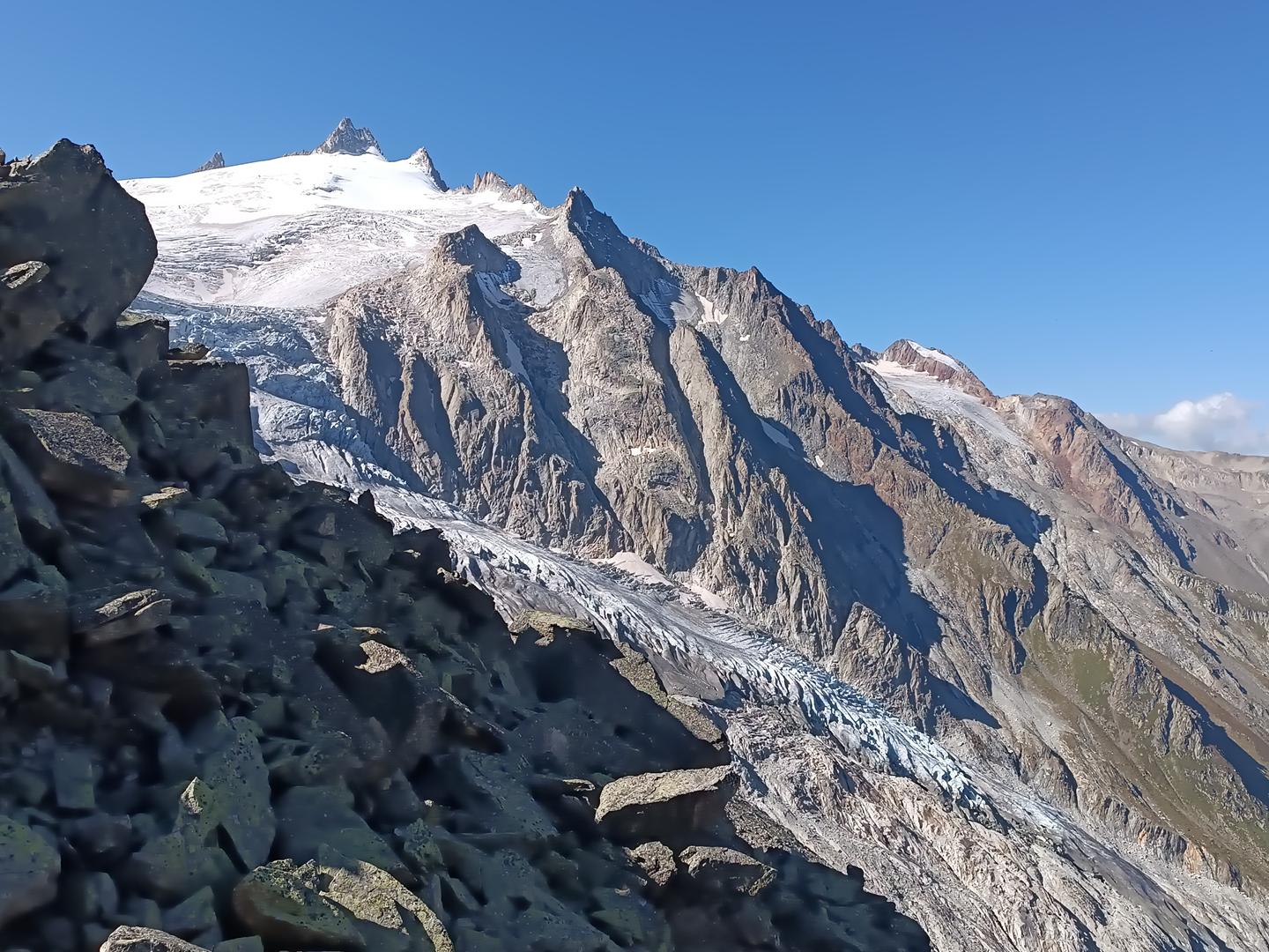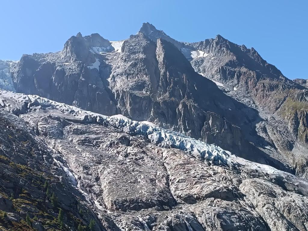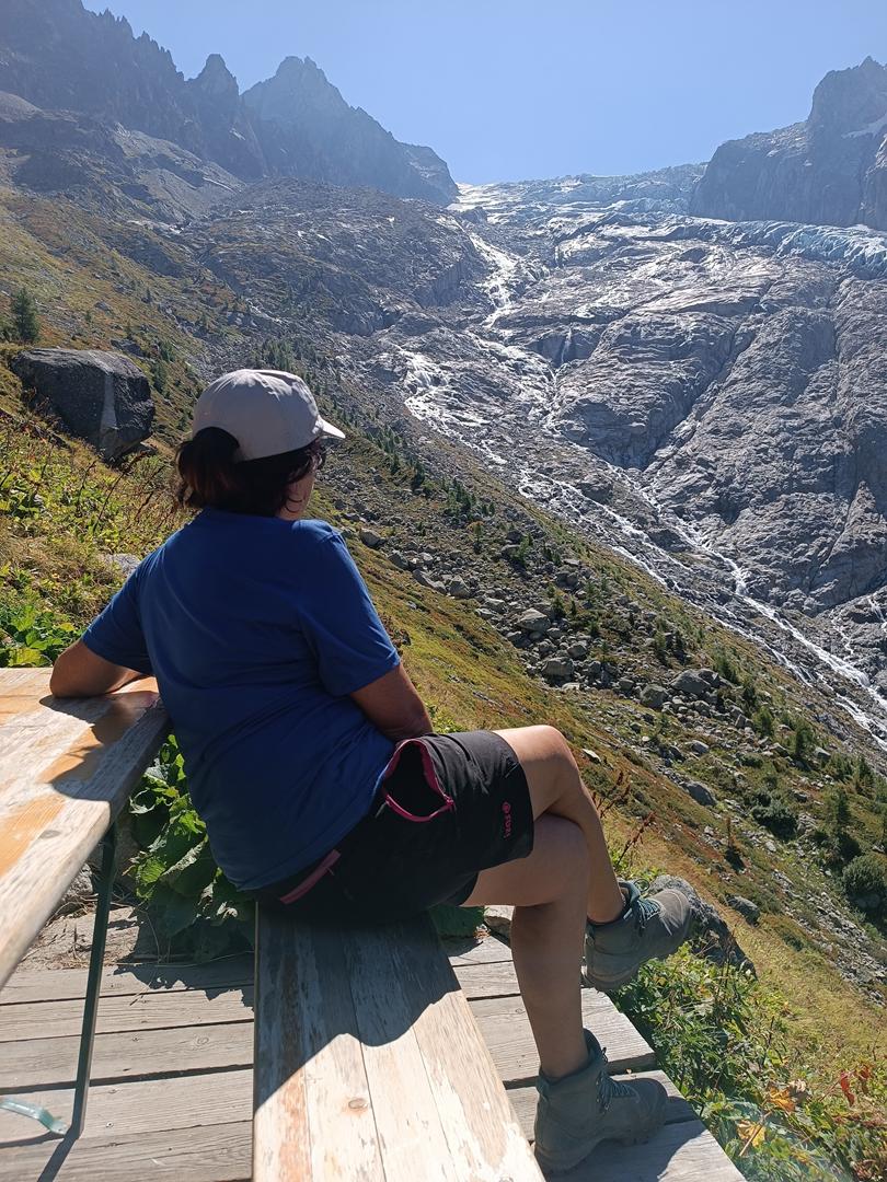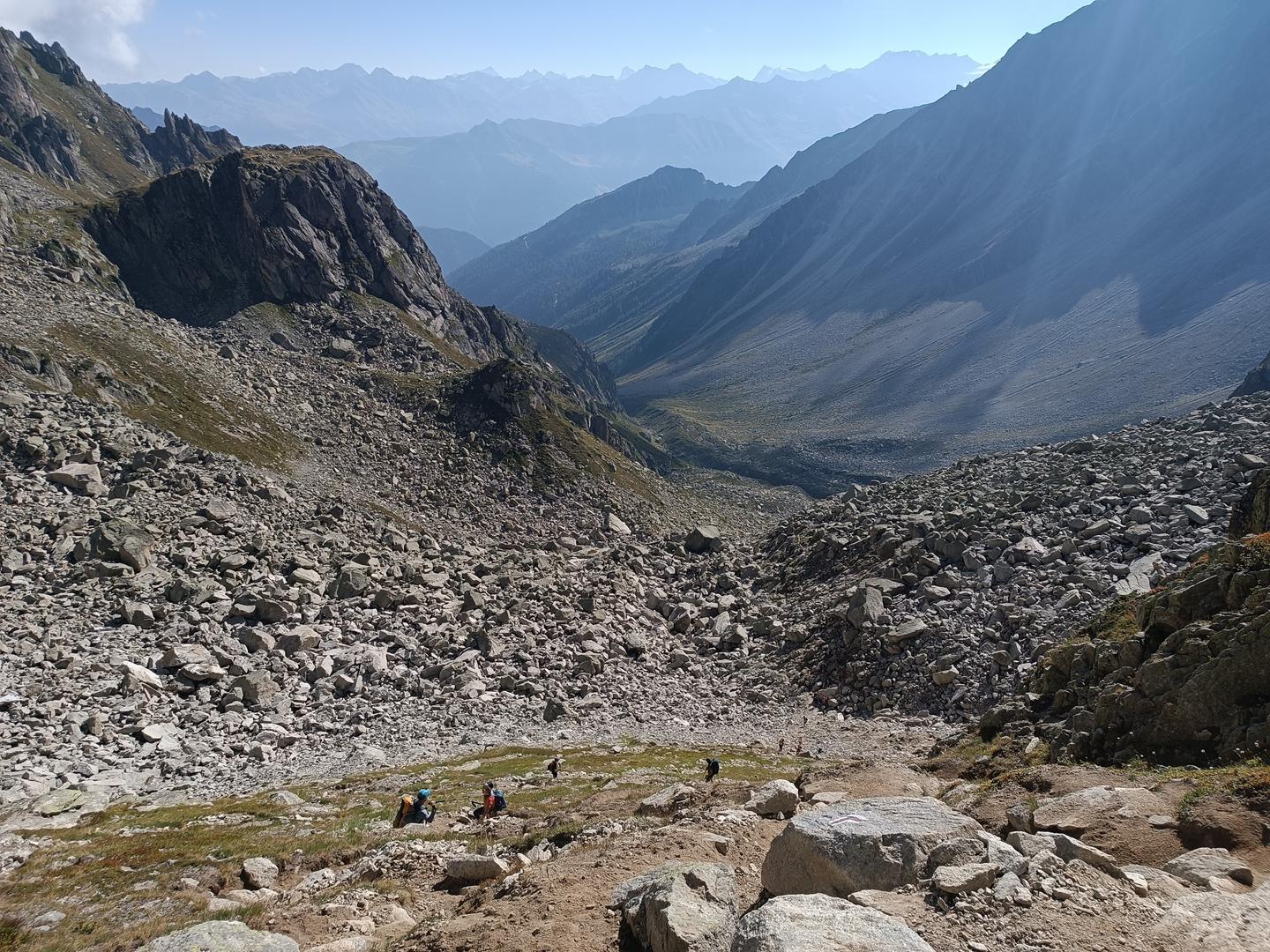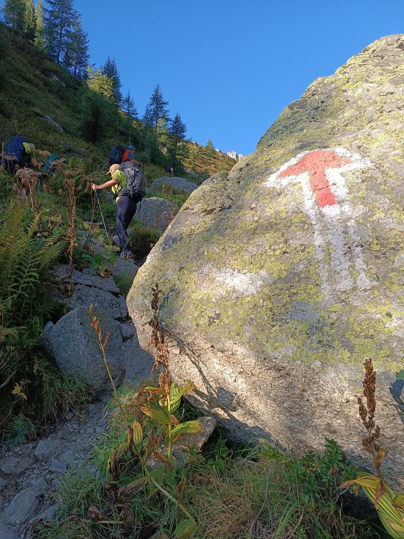 Hasta la fenetre d’Arpette hay una subida dura, muy montañera, con piedras y pasinos guapos. Yo me encuentro bien (será efecto suite) y llego la primera al collado. Es un collado con vistas a la morrena de un glaciar por donde subimos desde Arpette y con vistas al glaciar de Trient, somos testigos durante toda la bajada de como se está deshaciendo. La bajada tb es larga y dura. Llegamos al río propongo lavado de pies al pie del glaciar, pero no tengo apoyo suficiente, hay ganas de llegar al hotel (hay un bar pero no paramos) y seguimos una hora hasta el col de Forclaz por un sendero familiar.
