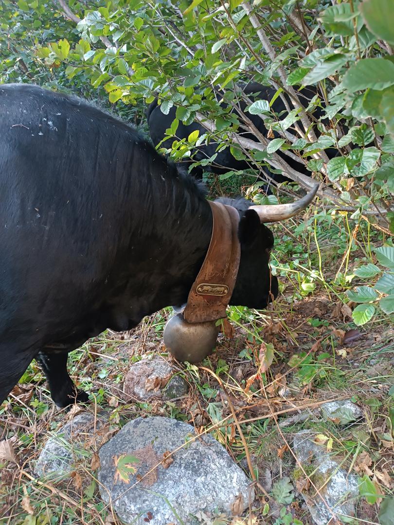En esta zona empezamos a ver unas vacas grandes, negras, con unos cencerros enormes enganchados con una tira de cuero super elaboradas. Yo leí algo de pelea de vacas Herens.