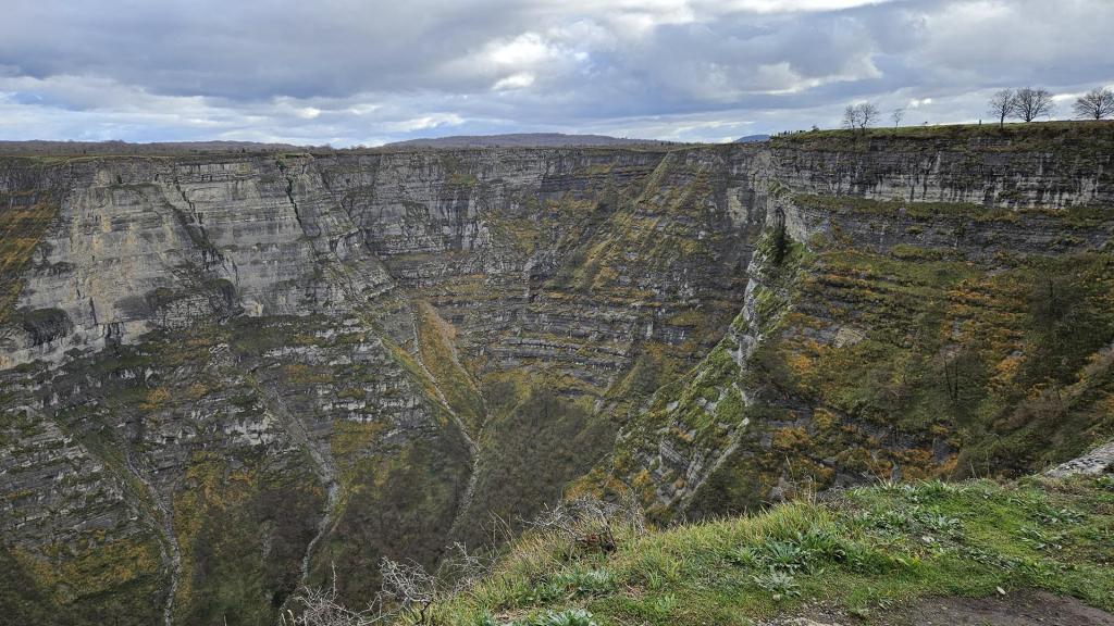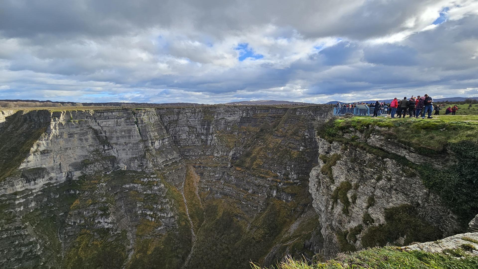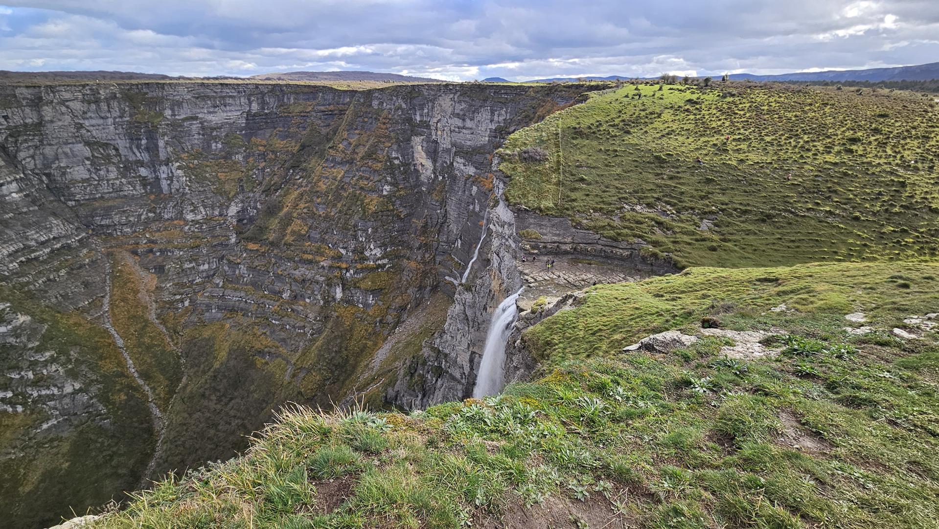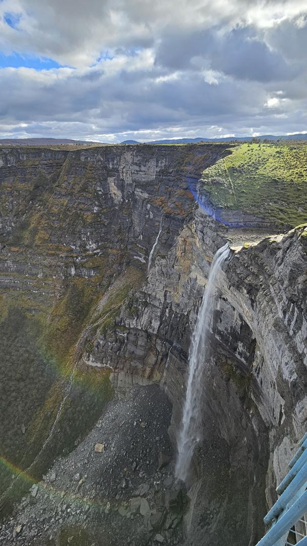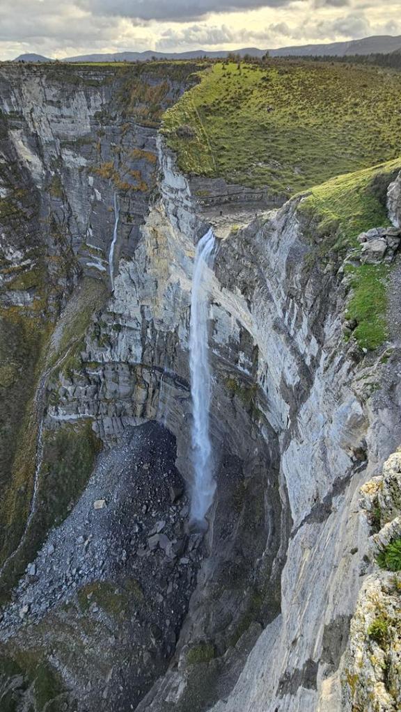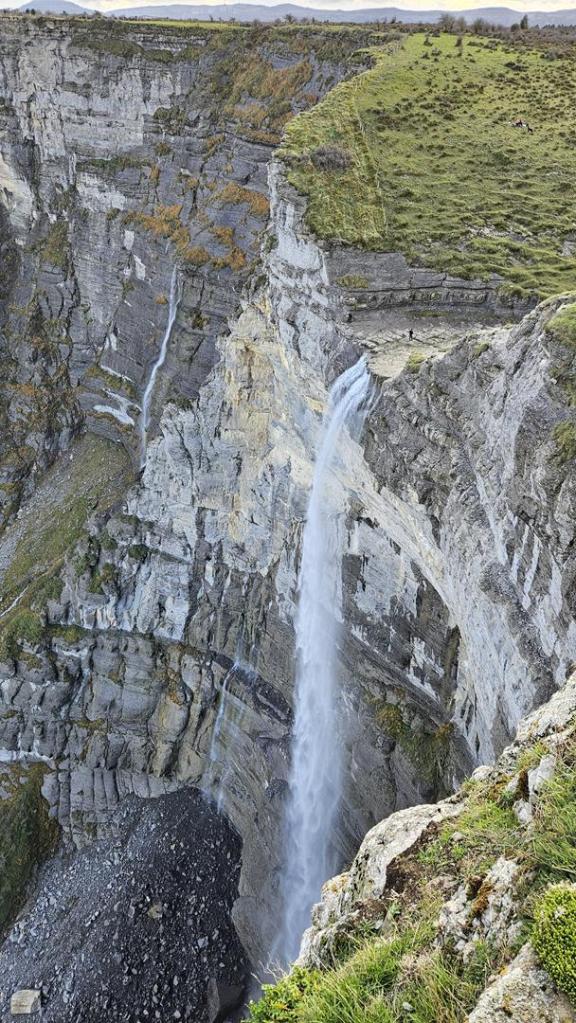Cuando llegamos al Mirador del Salto del Nervión, contemplamos que el caudal del río Nervión es más pausado, y la cascada, con sus aproximados 222 metros de altura, nos revela una faceta diferente de su encanto. Impresiona contemplar una de las cascadas más imponentes de España, donde el agua no llega líquida a la base, sino que se descompone en gotas suspendidas en el aire antes de llegar al suelo. ¡Espectacular! Incluso con este caudal la naturaleza nos ofrece toda una exhibición de belleza. No queremos pensar cuando el rio Nervión baje en su máxima espresión.