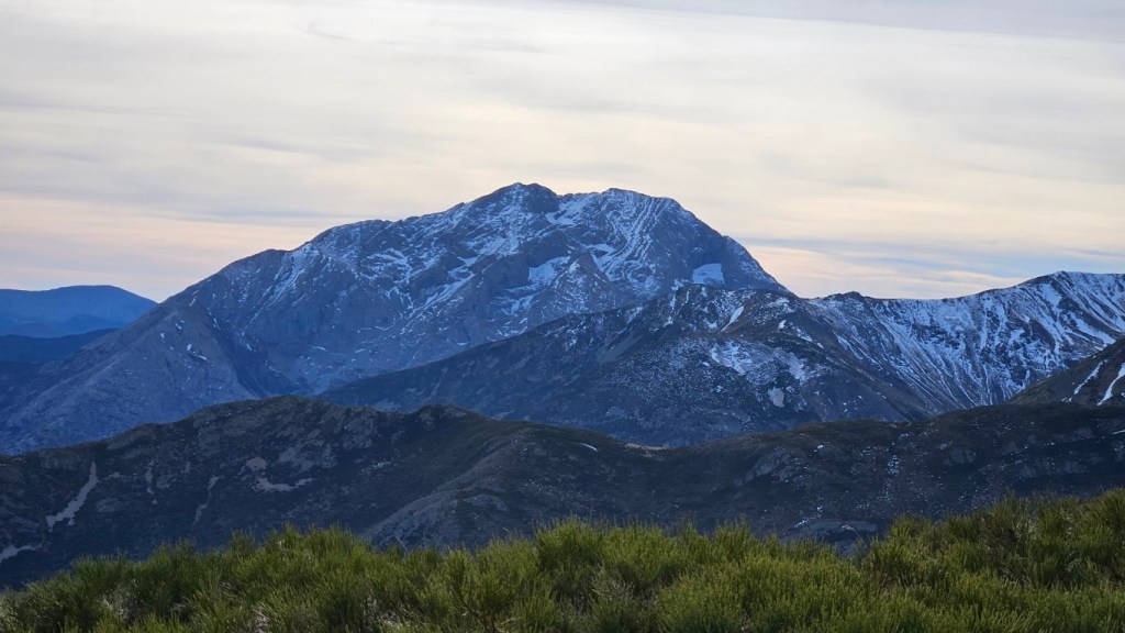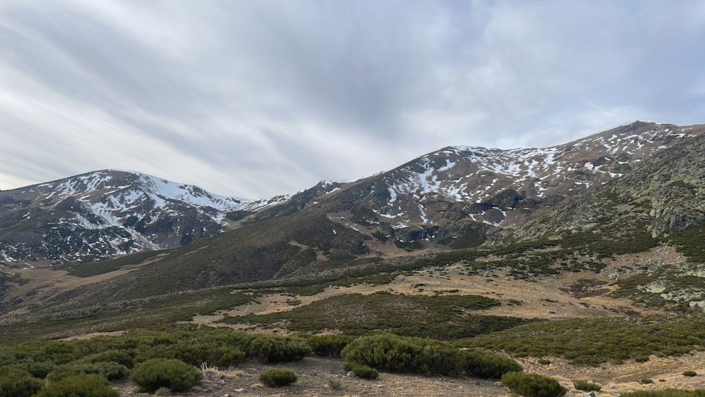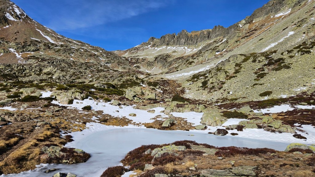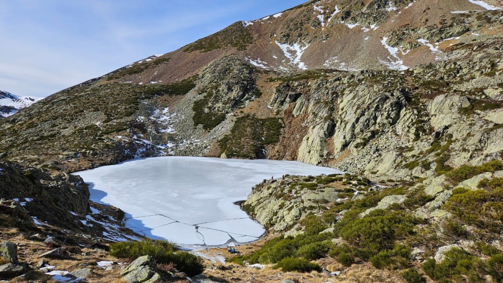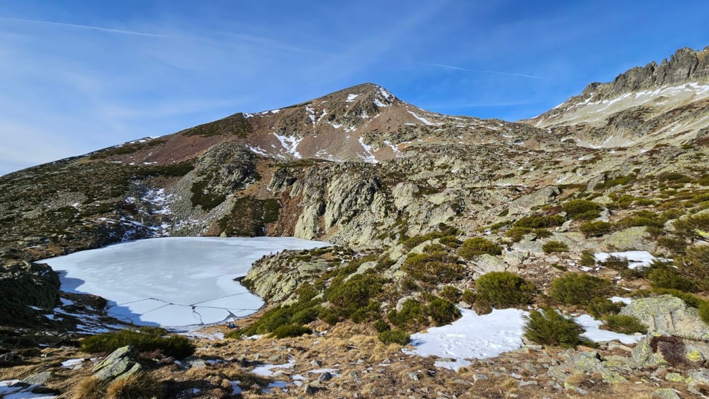 Finalmente llegamos a nuestro destino. Un pequeño collado desde donde se ve abajo, totalmente helado, el Pozo de las Lomas, situado a 2.080 metros. Alrededor de nosotros nos recreamos con cumbres de unos 2.400 metros las buenas vistas del Pico Murcia o el Espigüete.