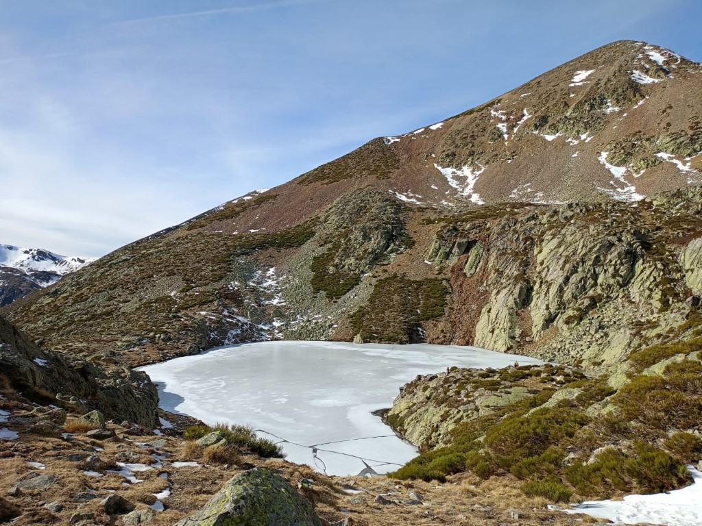 Finalmente llegamos a nuestro destino. Un pequeño collado desde donde se ve abajo, totalmente helado, el Pozo de las Lomas, situado a 2.080 metros. Alrededor de nosotros nos recreamos con cumbres de unos 2.400 metros las buenas vistas del Pico Murcia o el Espigüete.