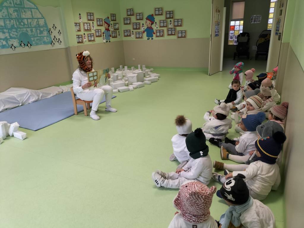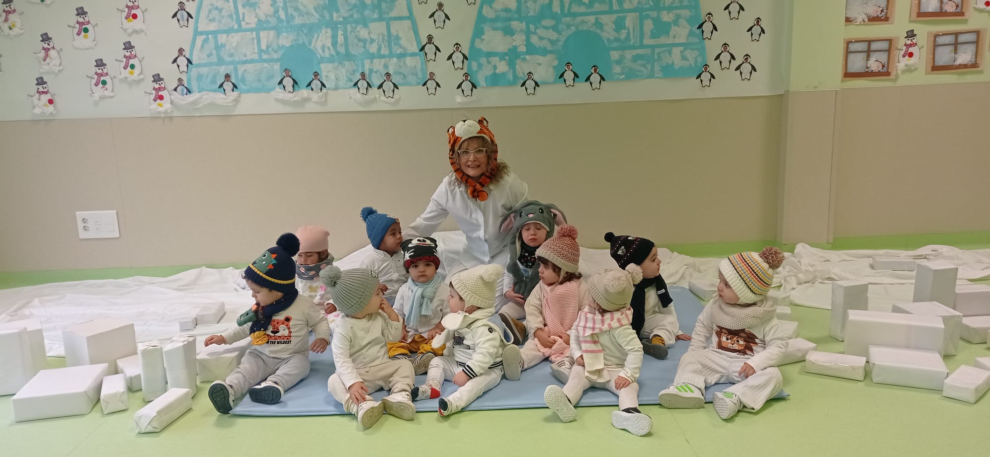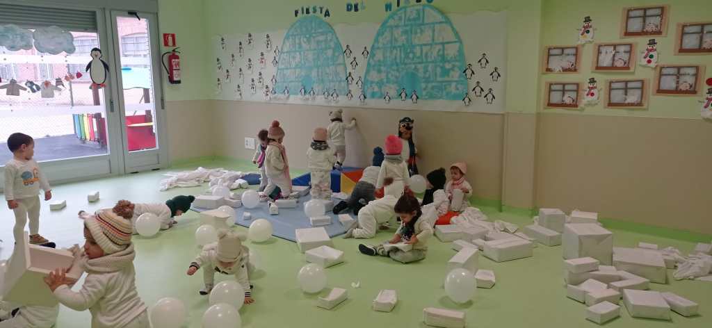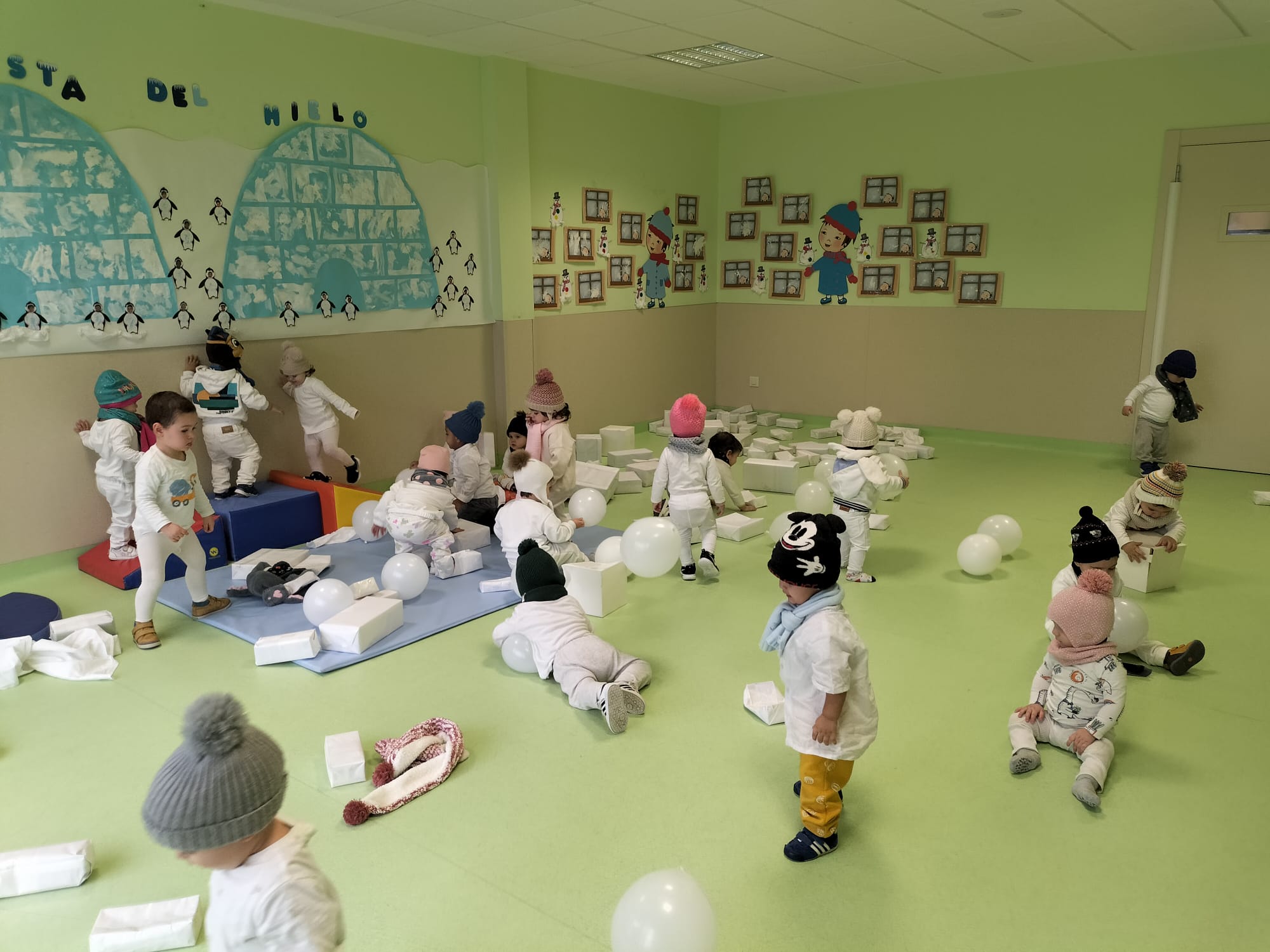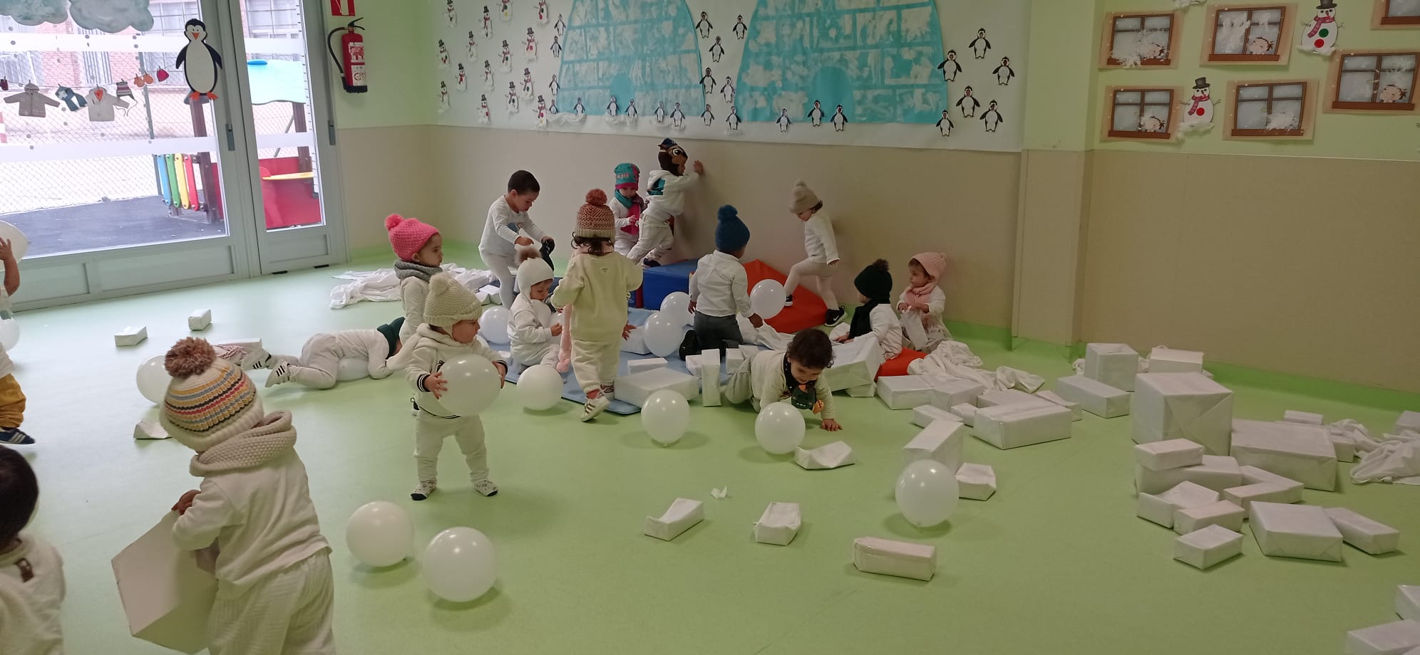 El alumnado de 1-2 años disfrutamos en «la fiesta del hielo» con cajas de cartón recicladas forradas de papel, simulando bloques de hielo, jugando a arrastrarlas y las apilamos para hacer torres.