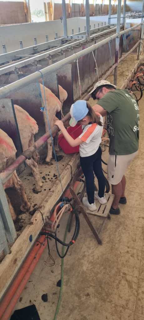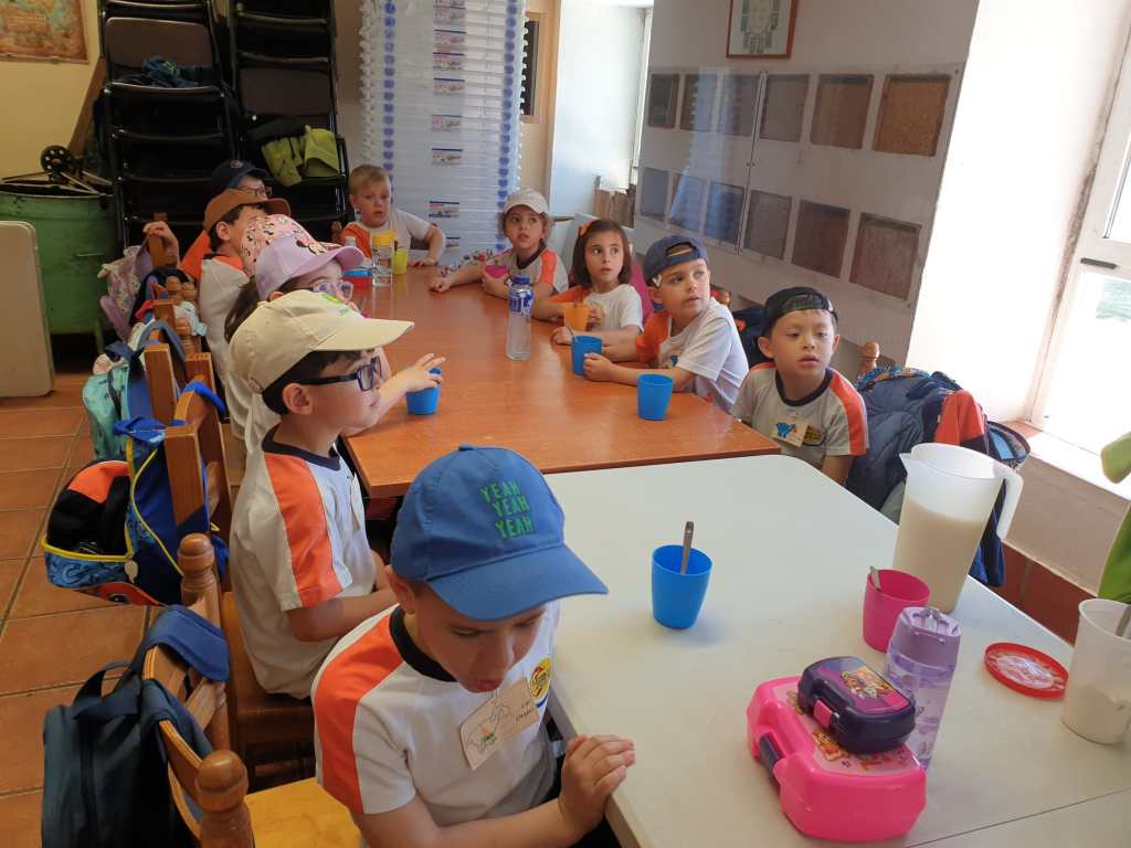 Después de la ordeña, los niños se dirigieron a la cocina de la granja, donde participaron en la elaboración de un delicioso bizcocho. Midieron ingredientes, mezclaron la masa y la vertieron en moldes, aprendiendo sobre las distintas etapas de la preparación. Mientras el bizcocho se horneaba, otro grupo de alumnos preparó una rica cuajada, siguiendo el proceso tradicional, y aprendieron sobre la fermentación de la leche y la magia de convertirla en un postre cremoso.