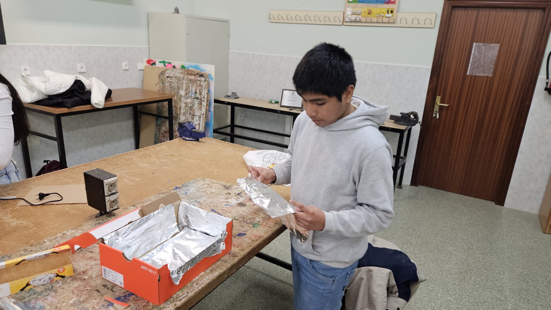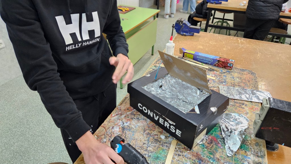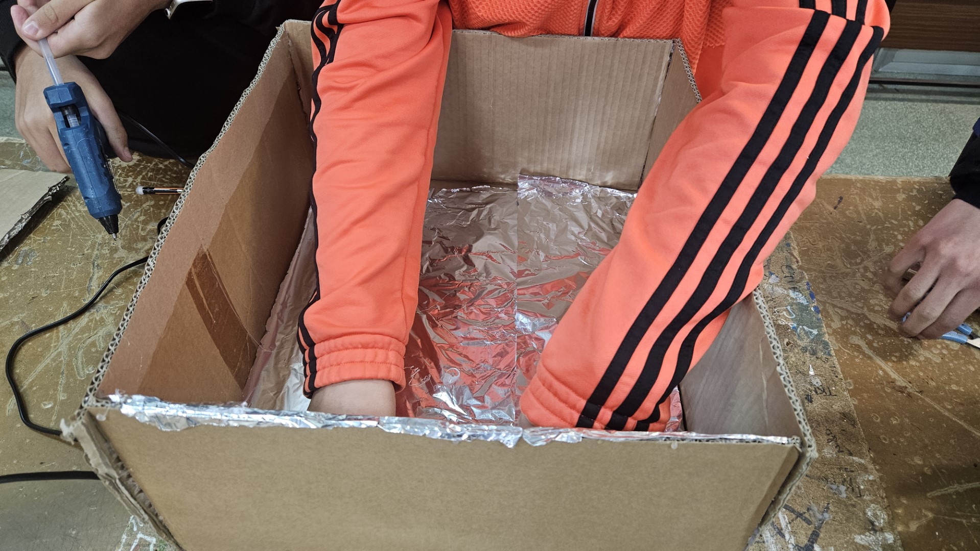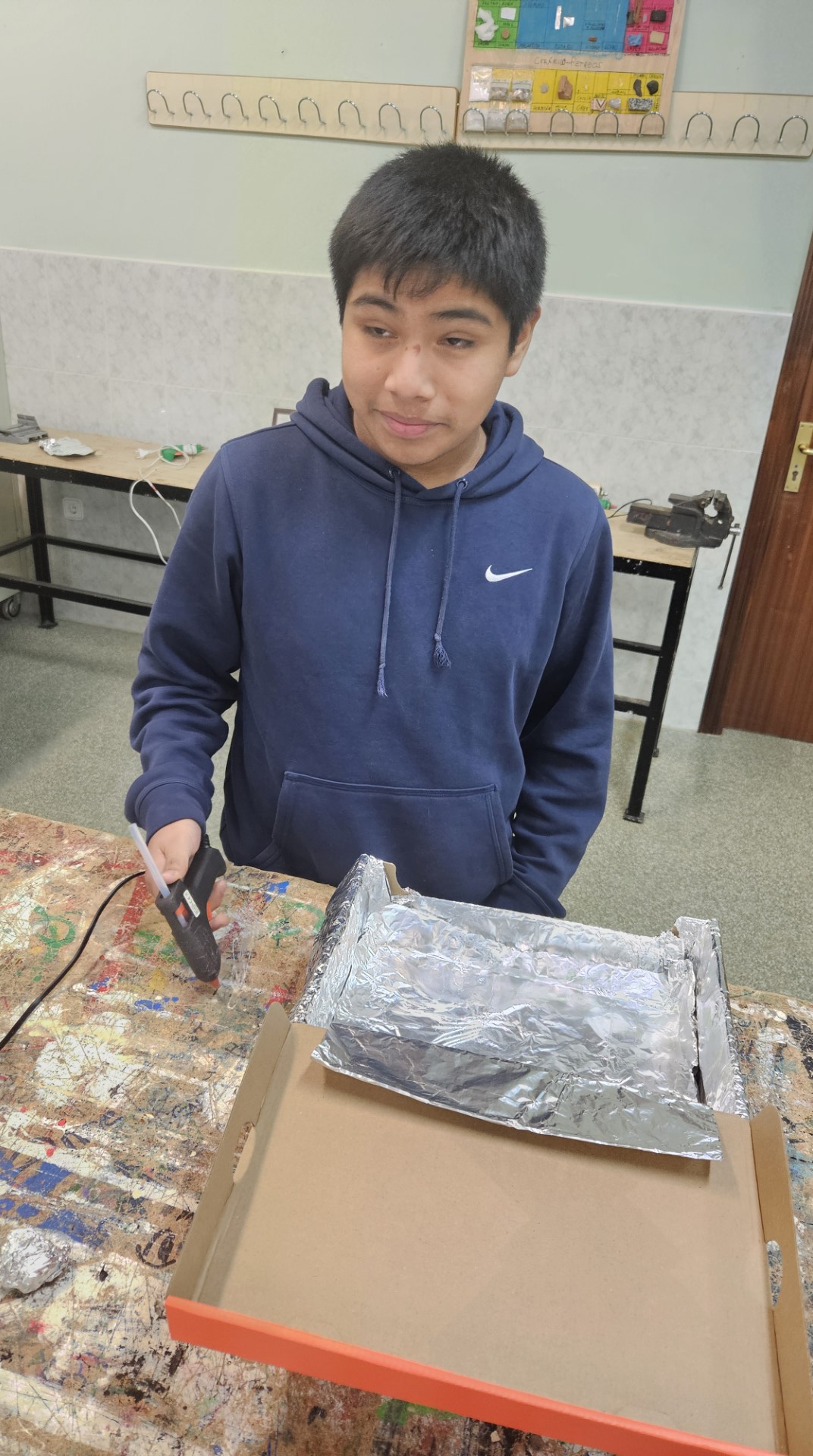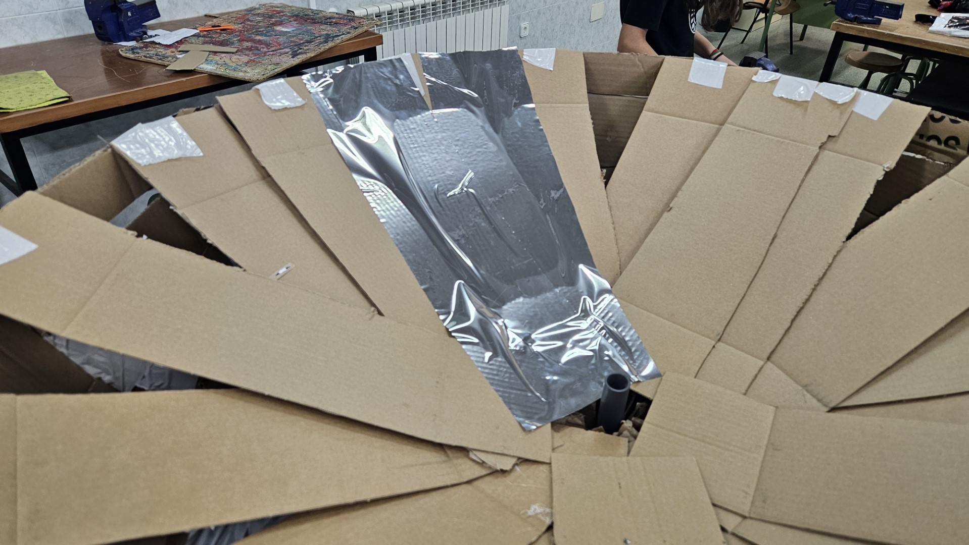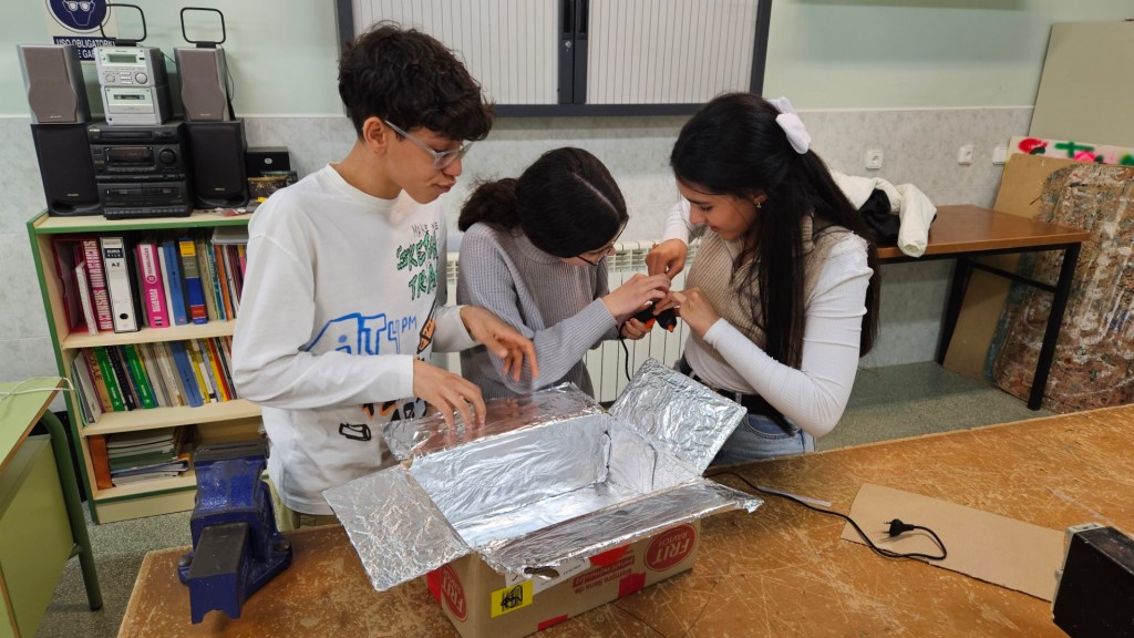 Esta fue una etapa crucial. Los alumnos hicieron bocetos y planos detallados de sus hornos solares, asegurándose de que cada diseño fuera práctico y eficiente. Decidieron los materiales que iban a usar, eligiendo siempre opciones reciclables y económicas, como cajas de cartón, papel de aluminio y plástico transparente. Planificaron cada paso de la construcción, distribuyendo tareas en sus equipos para asegurarse de que todos participaran y el trabajo se hiciera de manera ordenada.
