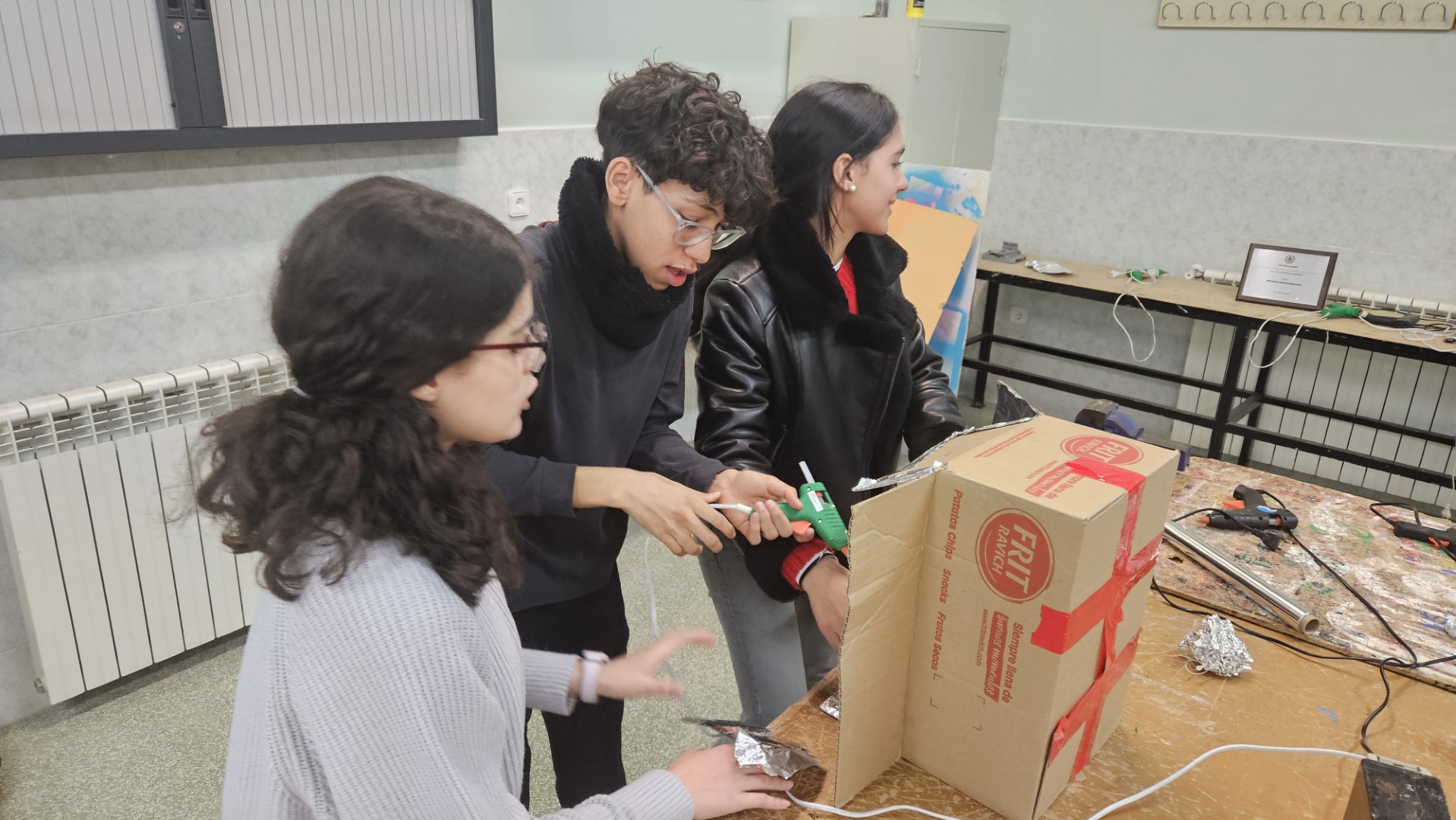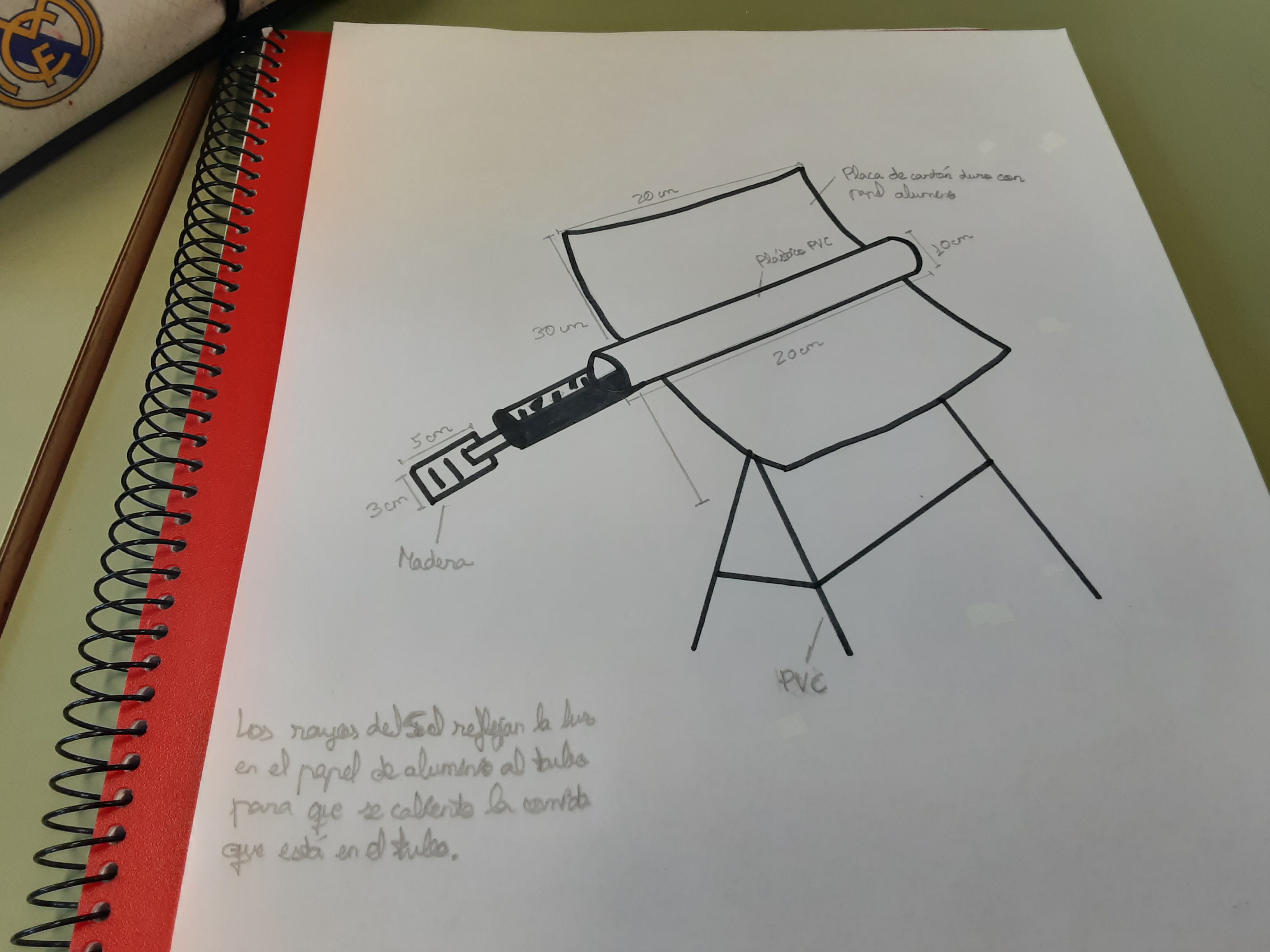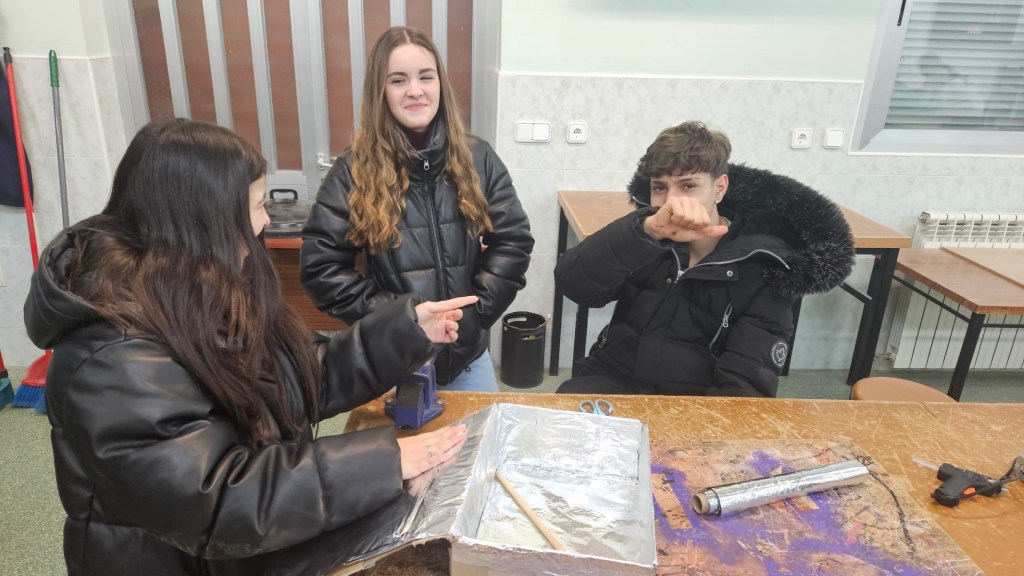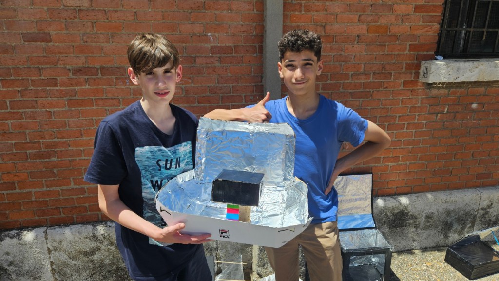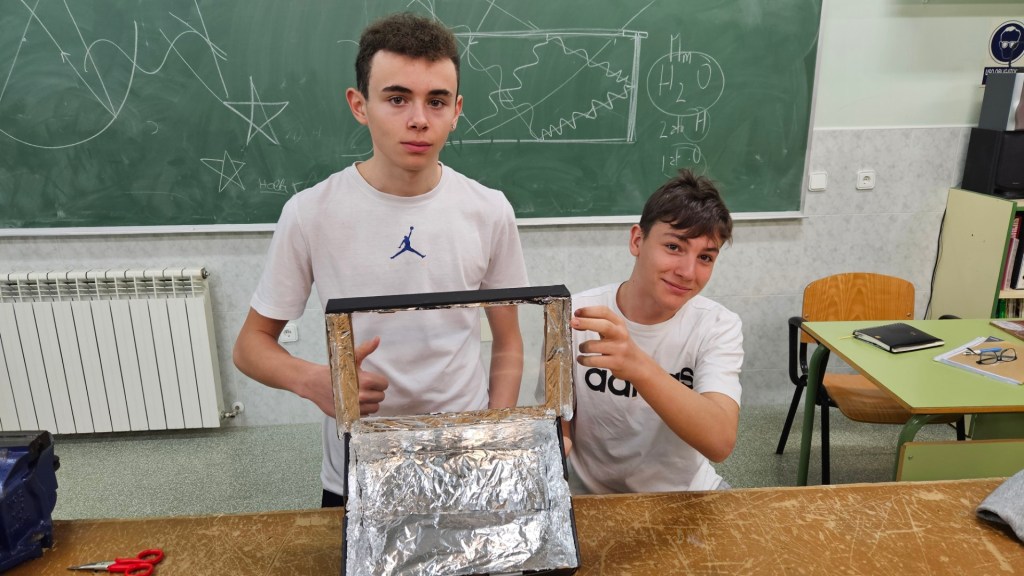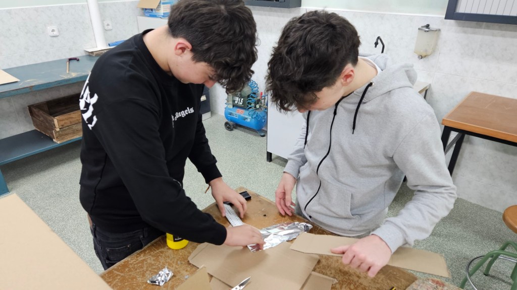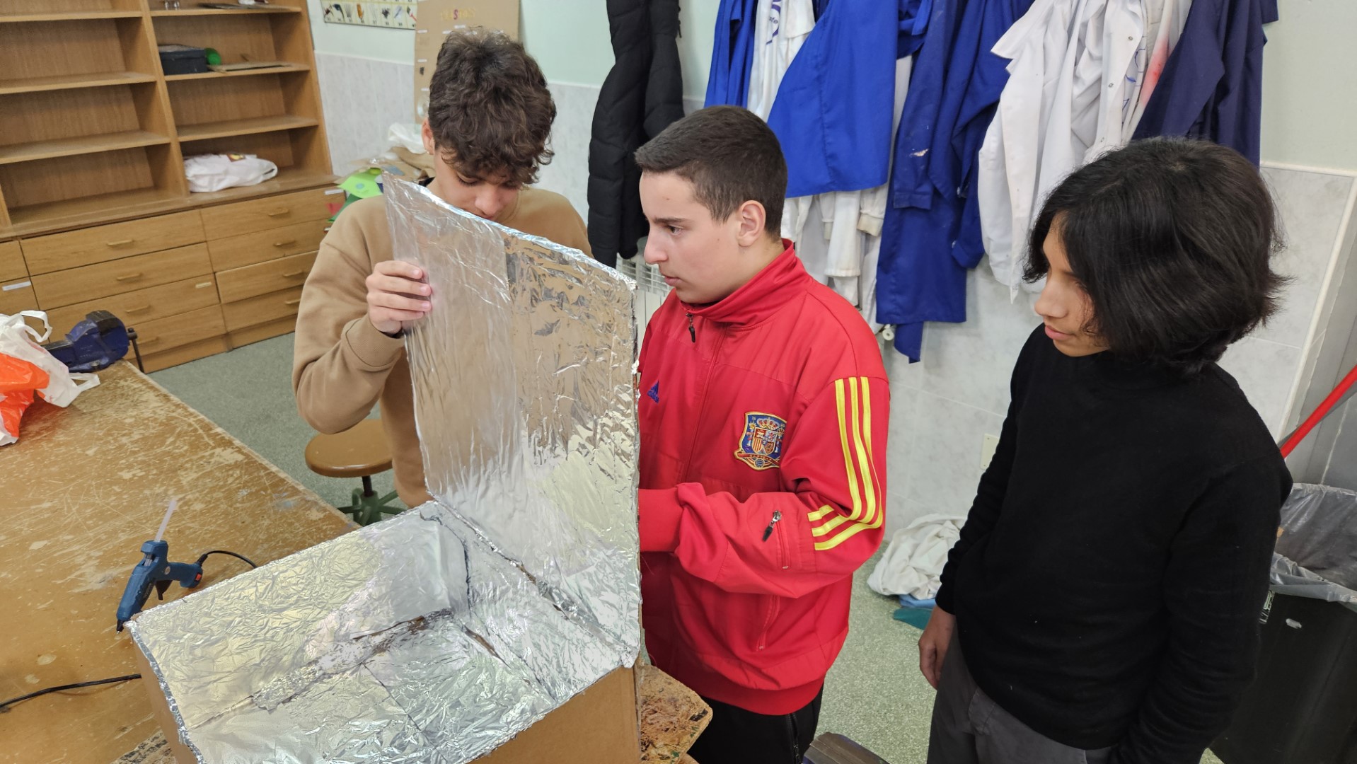 Esta fue una etapa crucial. Los alumnos hicieron bocetos y planos detallados de sus hornos solares, asegurándose de que cada diseño fuera práctico y eficiente. Decidieron los materiales que iban a usar, eligiendo siempre opciones reciclables y económicas, como cajas de cartón, papel de aluminio y plástico transparente. Planificaron cada paso de la construcción, distribuyendo tareas en sus equipos para asegurarse de que todos participaran y el trabajo se hiciera de manera ordenada.