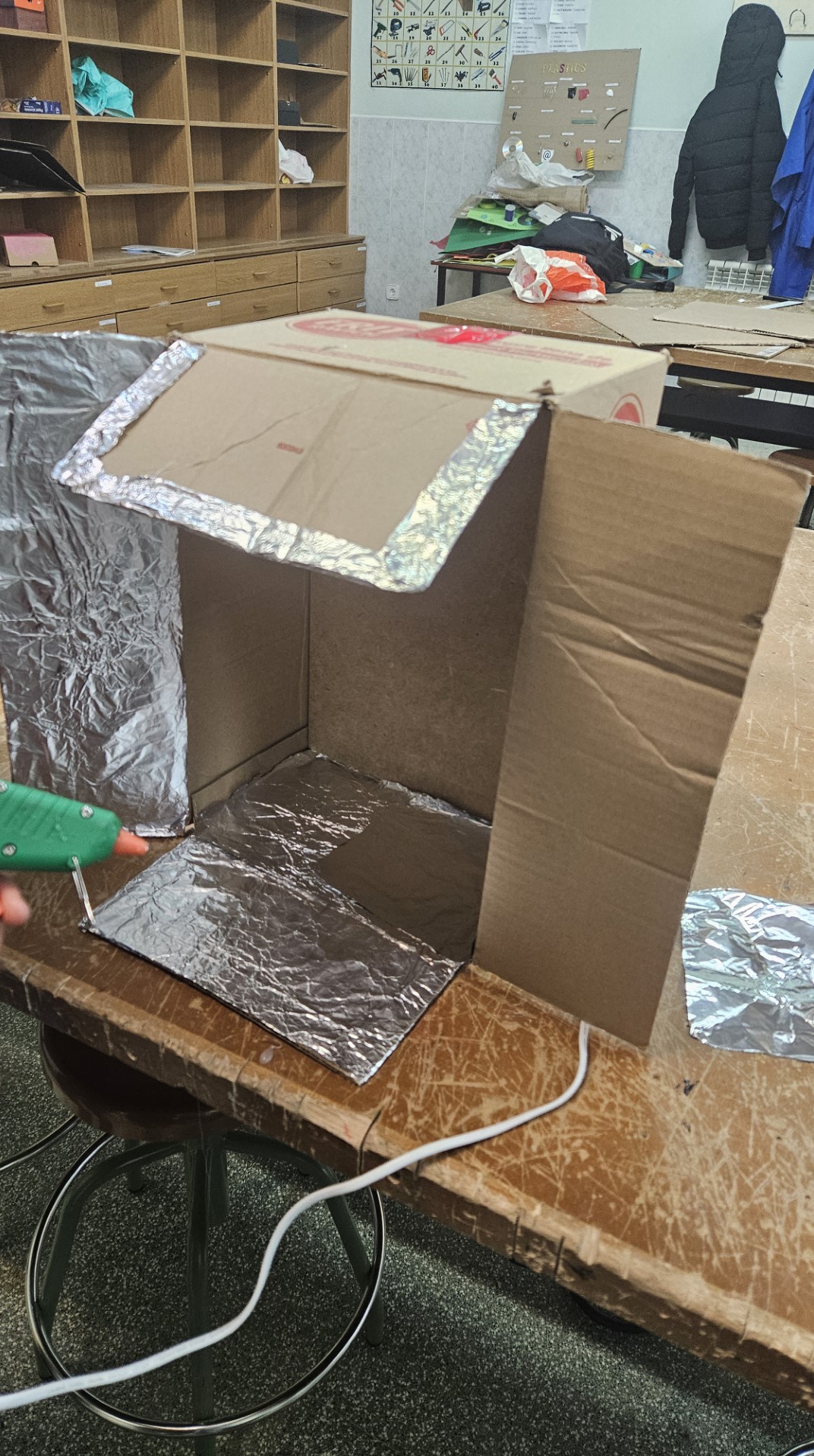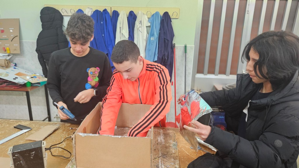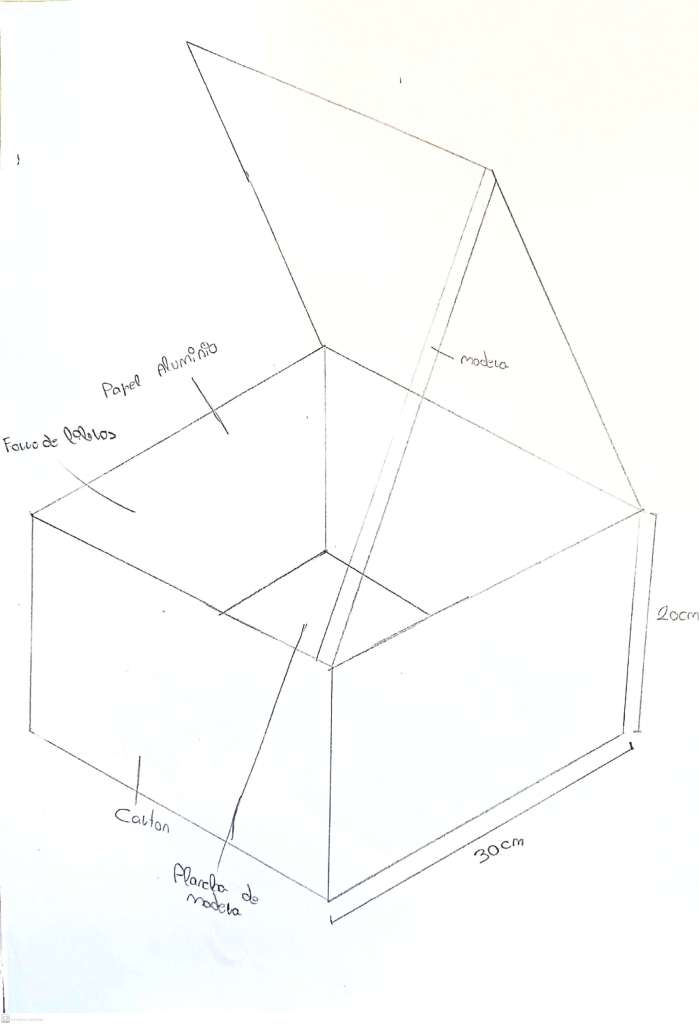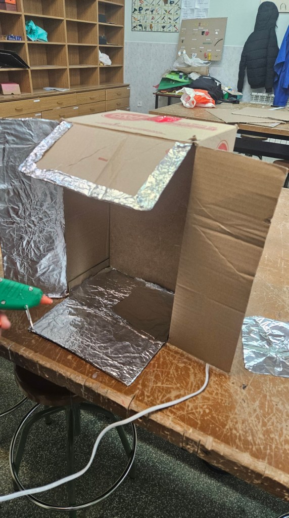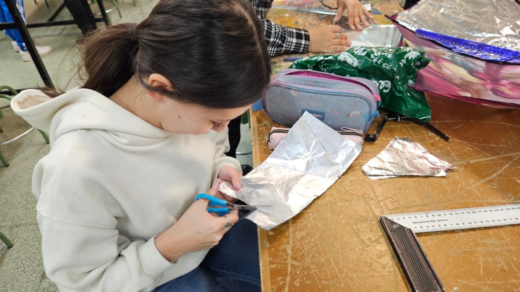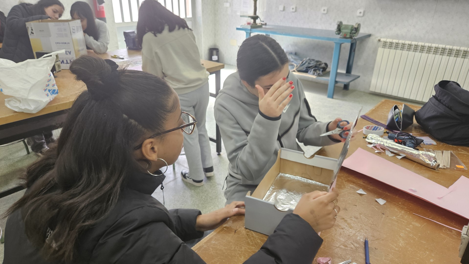 Esta fue una etapa crucial. Los alumnos hicieron bocetos y planos detallados de sus hornos solares, asegurándose de que cada diseño fuera práctico y eficiente. Decidieron los materiales que iban a usar, eligiendo siempre opciones reciclables y económicas, como cajas de cartón, papel de aluminio y plástico transparente. Planificaron cada paso de la construcción, distribuyendo tareas en sus equipos para asegurarse de que todos participaran y el trabajo se hiciera de manera ordenada.