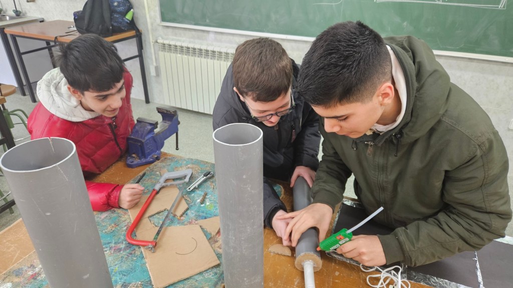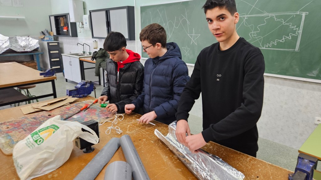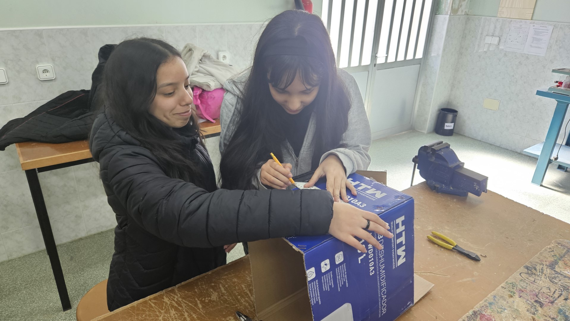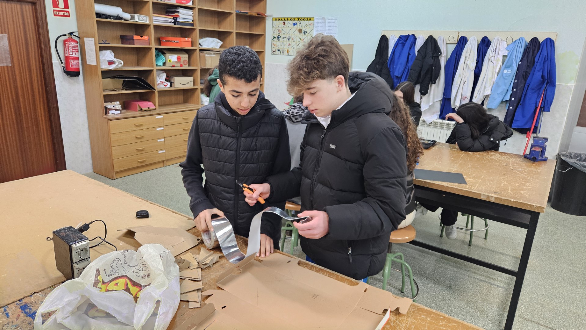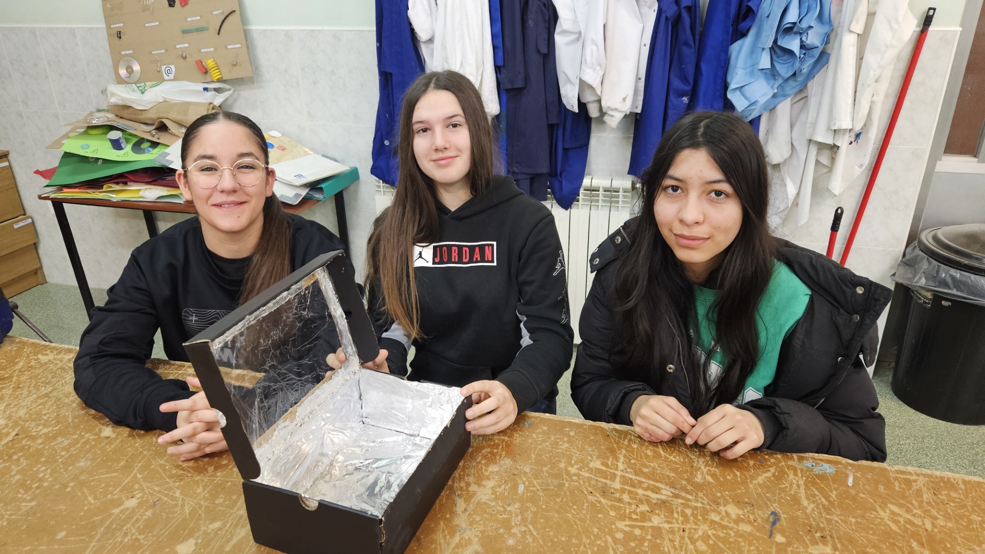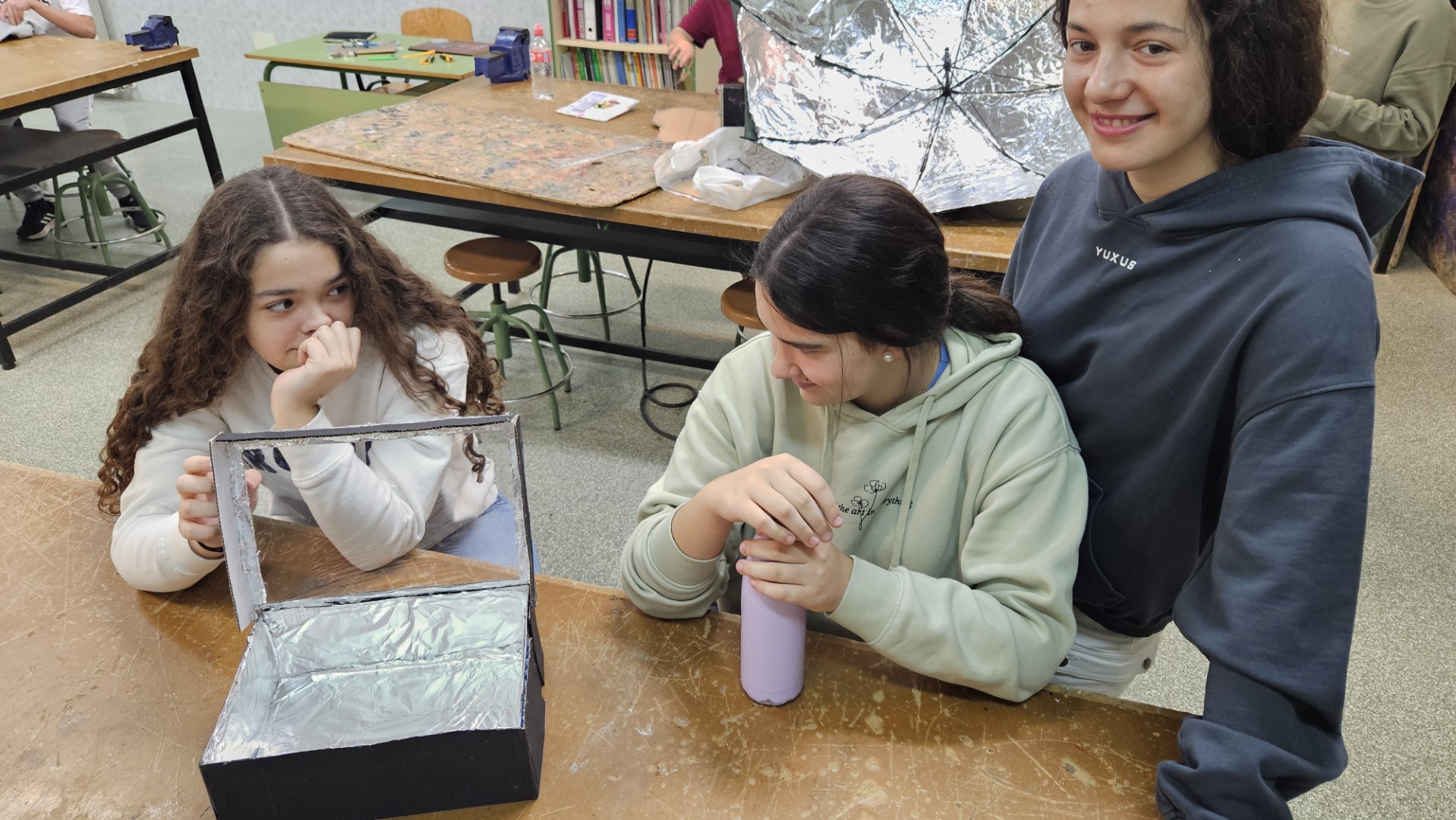 Esta fue una etapa crucial. Los alumnos hicieron bocetos y planos detallados de sus hornos solares, asegurándose de que cada diseño fuera práctico y eficiente. Decidieron los materiales que iban a usar, eligiendo siempre opciones reciclables y económicas, como cajas de cartón, papel de aluminio y plástico transparente. Planificaron cada paso de la construcción, distribuyendo tareas en sus equipos para asegurarse de que todos participaran y el trabajo se hiciera de manera ordenada.